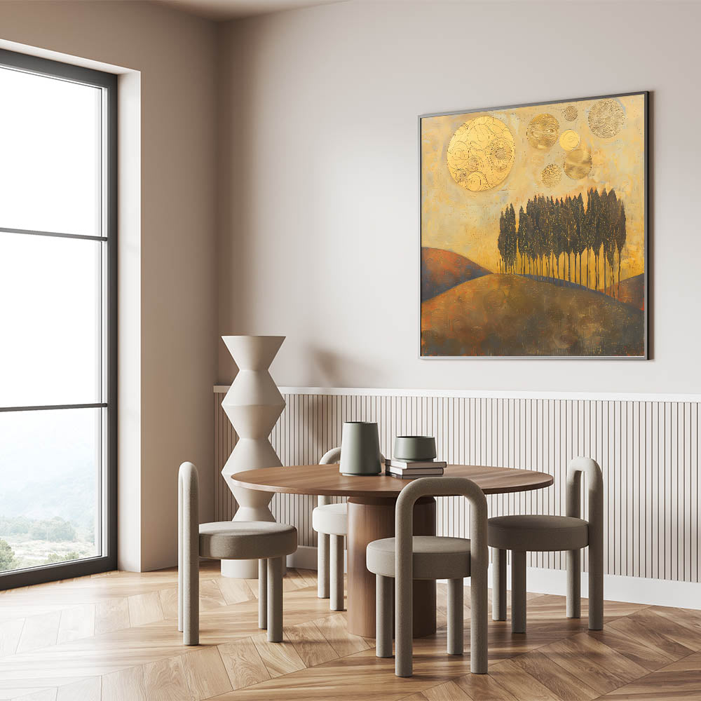 Add a touch of mystique to your decor with this modern landscape abstract, featuring a golden celestial sun above a line of elegant trees on rolling hills. The warm hues of gold, brown, and muted orange blend beautifully to create a surreal, dreamlike landscape that draws the eye and sparks the imagination. Perfect for those who appreciate unique, nature-inspired art, this piece brings warmth and depth to any room.