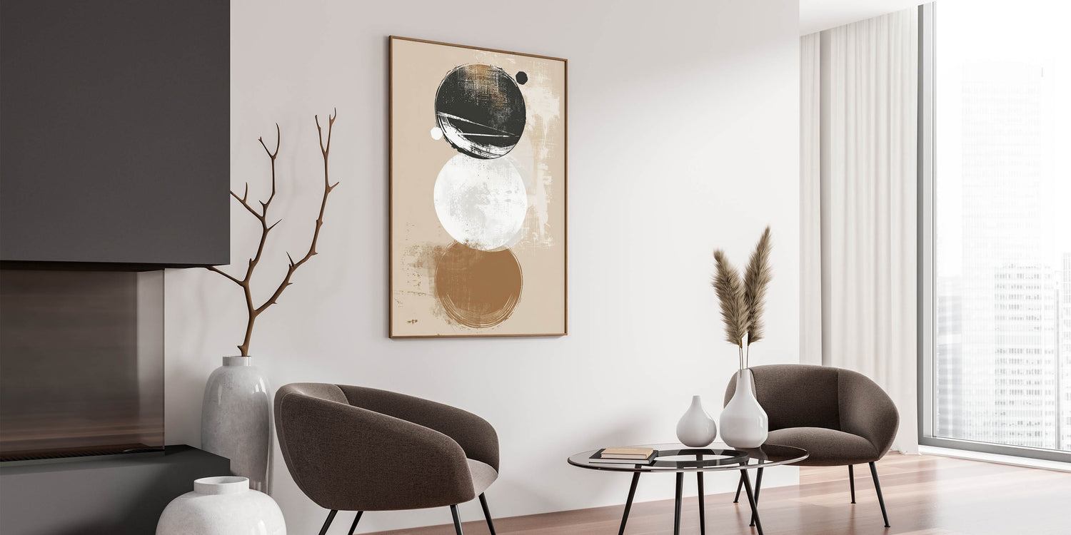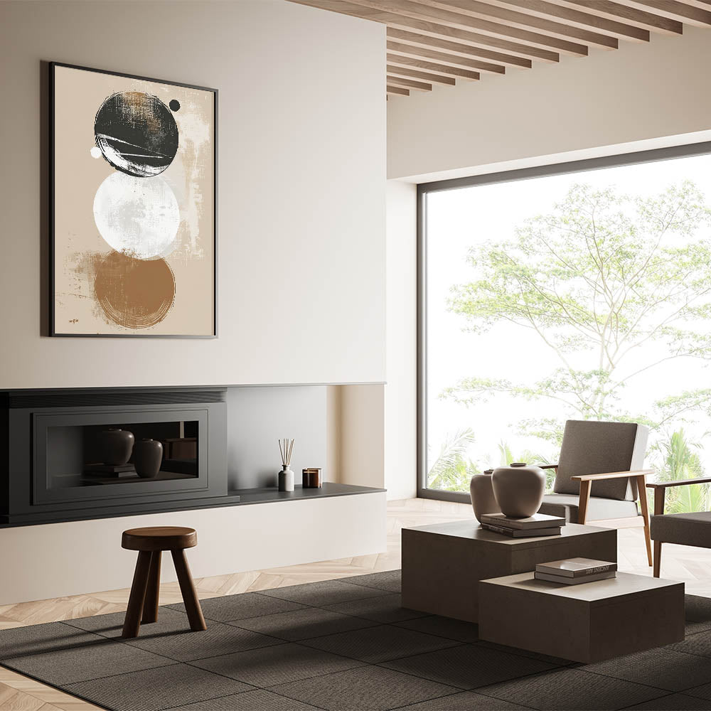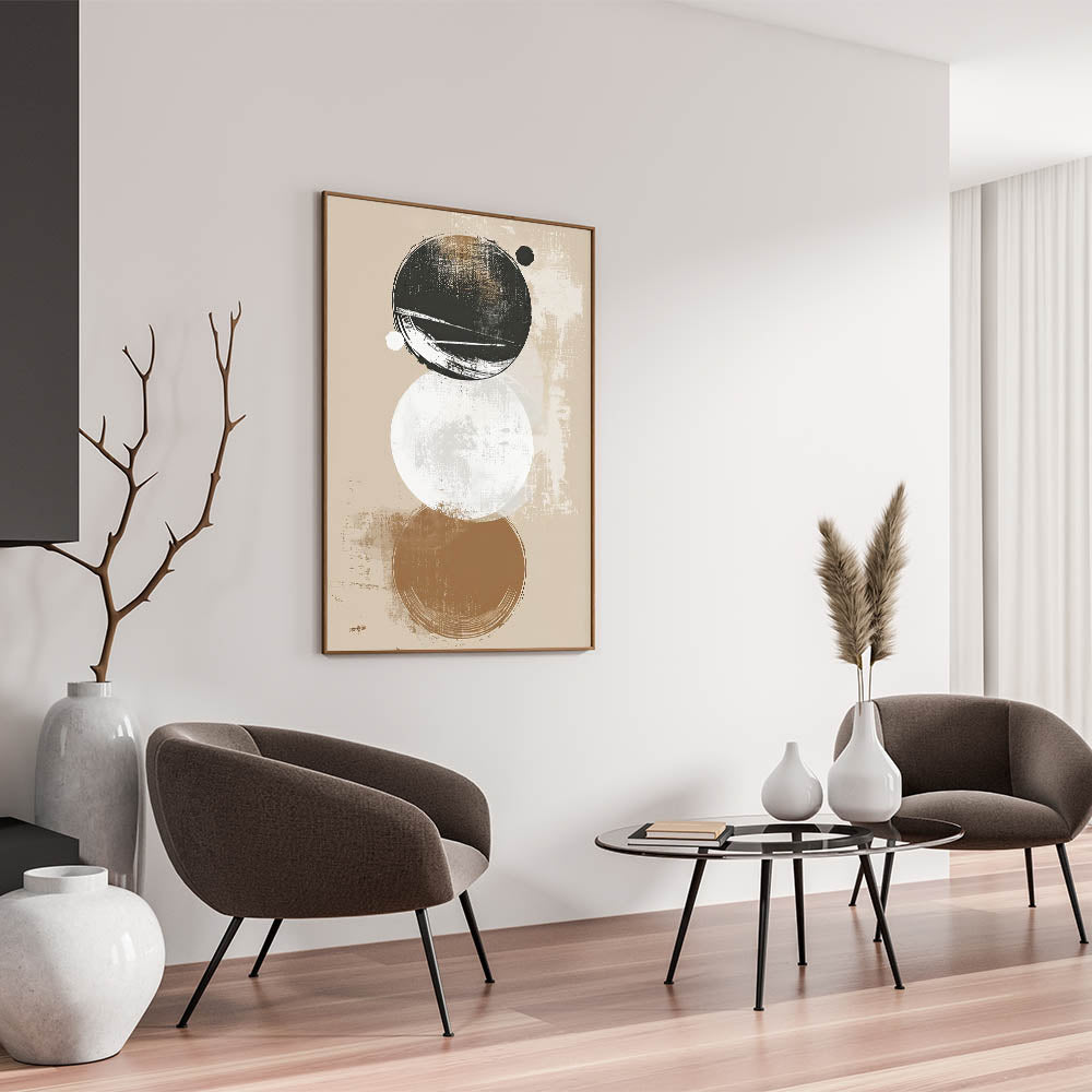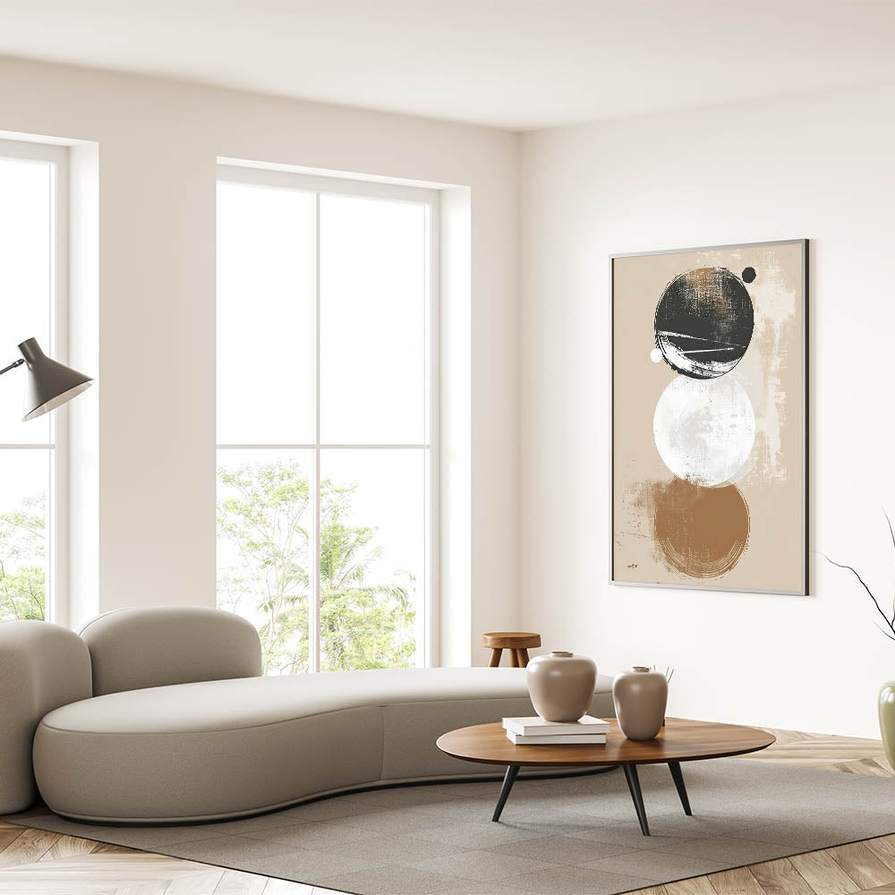 Add a modern touch to your decor with this minimalist geometric art print. Featuring layered circles in beige, black, and white tones, this artwork combines clean lines with a distressed texture, bringing a unique balance of simplicity and depth. Perfect for contemporary or minimalist spaces, this piece’s abstract circular forms create a visually engaging focal point.