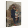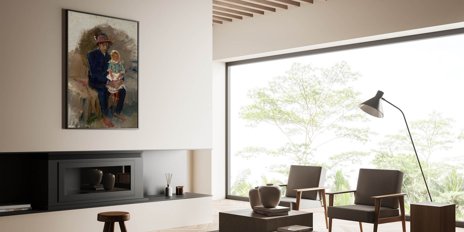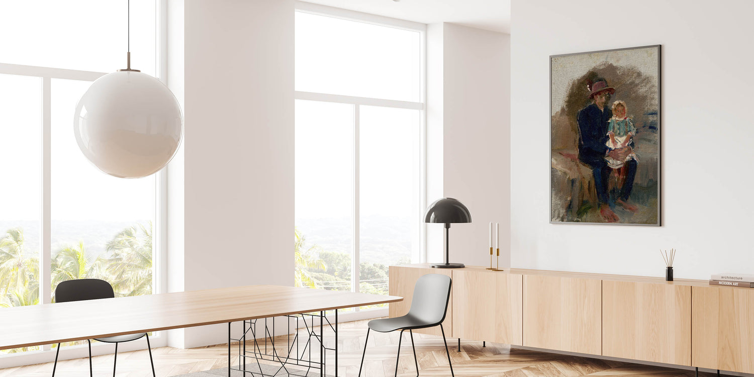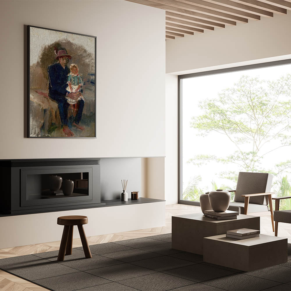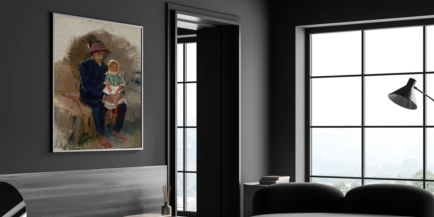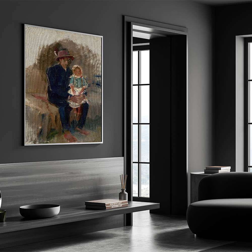 Add an emotional and introspective touch to your home with this evocative modern wall art, featuring a seated figure with a young child on their knee. The soft and textured brushstrokes create a warm yet muted atmosphere, bringing depth and character to any space. This unique art print is ideal for those who appreciate the complexities of human relationships and the beauty found in quiet moments. Its abstract nature and earthy color palette of browns, blues, and muted greens make it an excellent addition to a contemporary art collection.