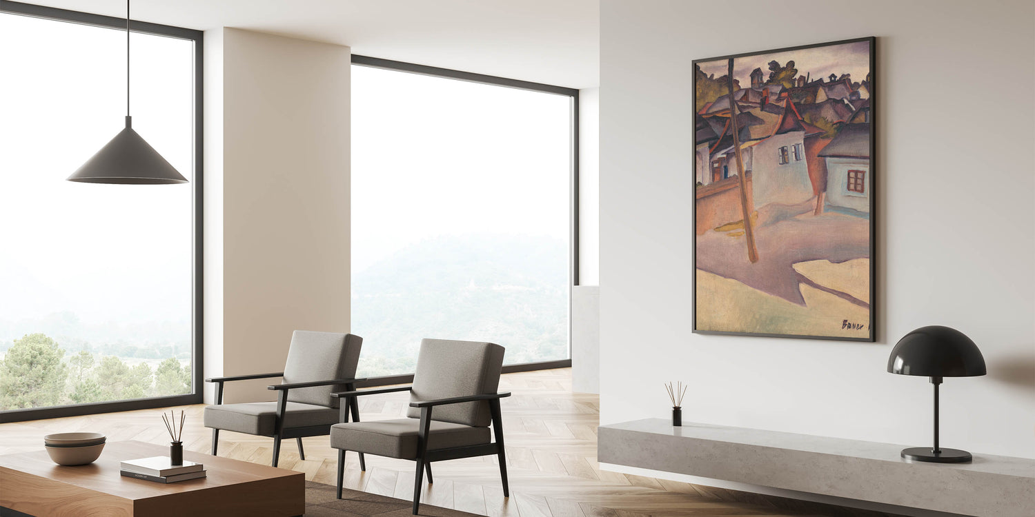 This charming modern wall art print, titled Gypsy Camp, by Konštantín Bauer, presents a unique depiction of a quiet village scene. The earthy colors and flowing shapes lend a dreamy, nostalgic quality to the artwork, transporting viewers to a simpler, rustic setting. Perfect for lovers of scenic and architectural art, this piece makes an ideal addition to living rooms, hallways, or cozy nooks. With its harmonious blend of light and shadow, this print evokes warmth and calm, making it a beautiful complement to both modern and classic decor styles.