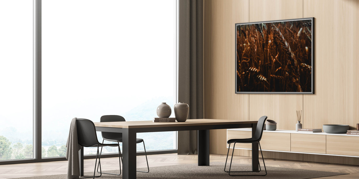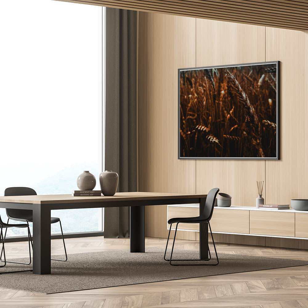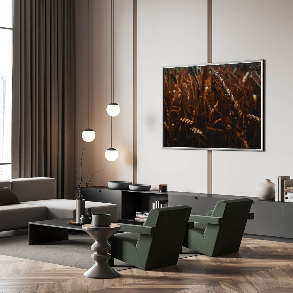 - Depicts a moody, atmospheric wheat field, adding depth and character to your space
