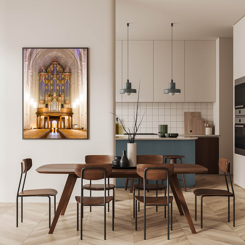 This stunning wall art showcases the magnificent grand organ set within a majestic North Carolina cathedral. The intricate details of the organ pipes, coupled with the beautiful architectural elements of the cathedral, make this piece an ideal choice for those looking to add historical and architectural beauty to their home or office. The soft lighting and grand scale bring out the iconic landmarks of North Carolina, highlighting Durham’s rich artistic heritage.