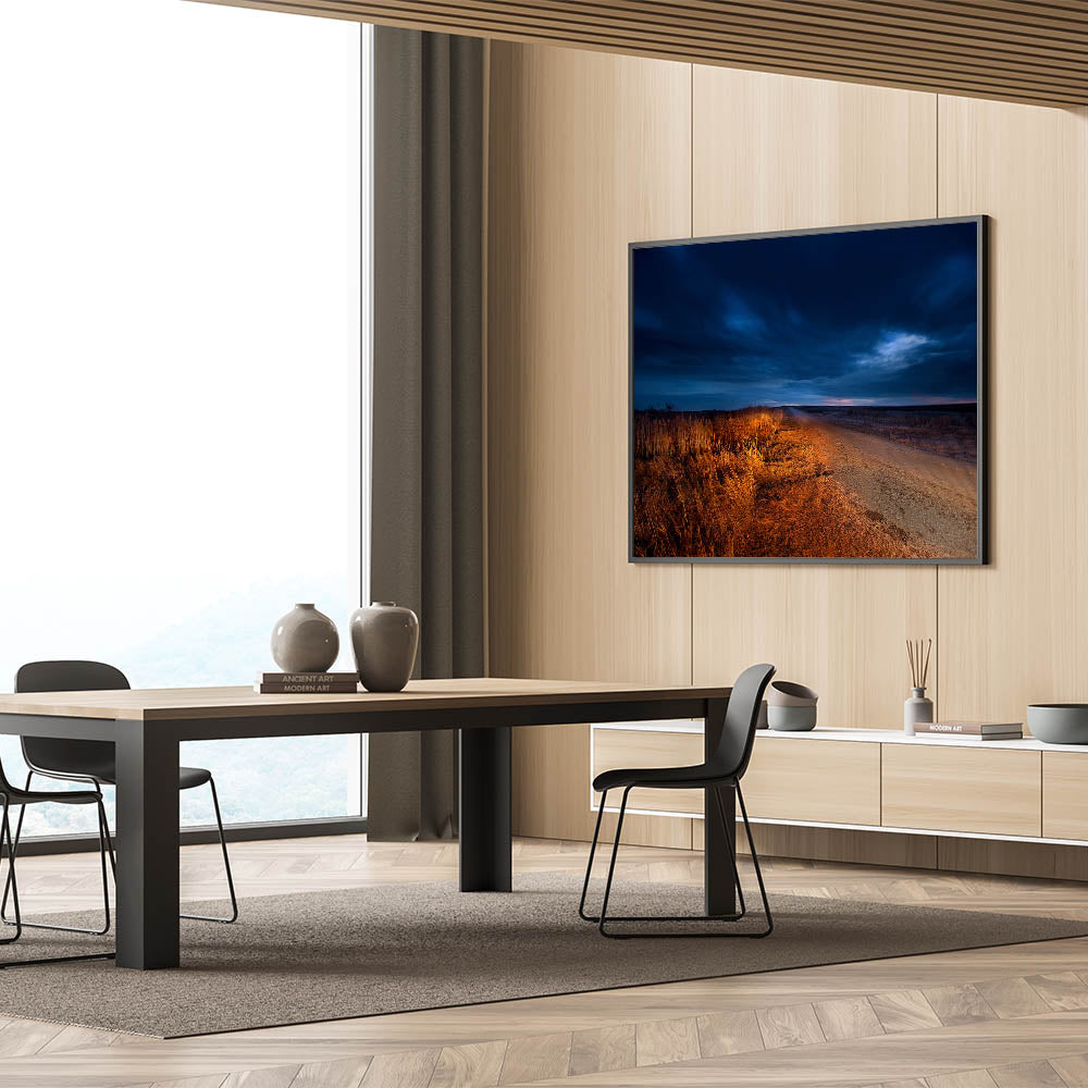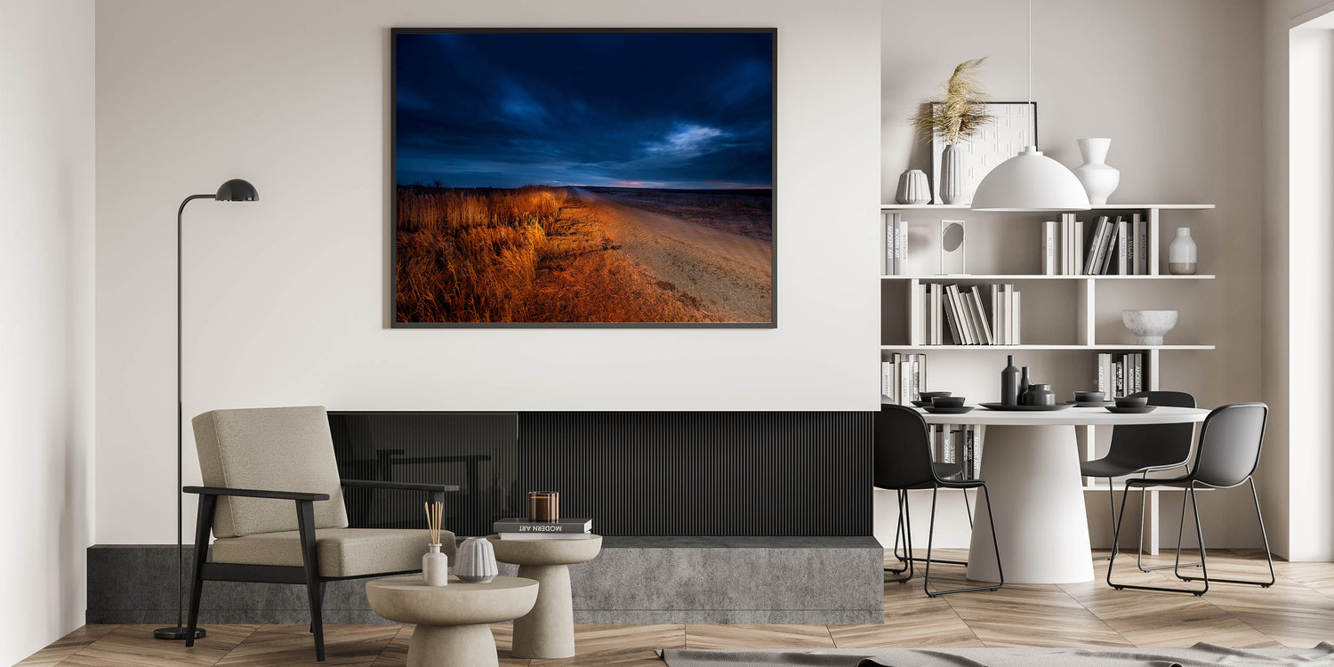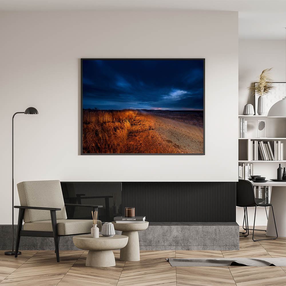 Embrace the rugged beauty of North Dakota with this breathtaking photograph of a rural road at dusk. The rich, dramatic sky contrasts perfectly with the golden, sunlit grass, creating a serene yet vibrant scene. This North Dakota wall art is perfect for nature lovers and those who want to add a touch of scenic charm to their space. Available as high-quality North Dakota canvas prints or framed art, it captures the tranquility of the open landscape.
