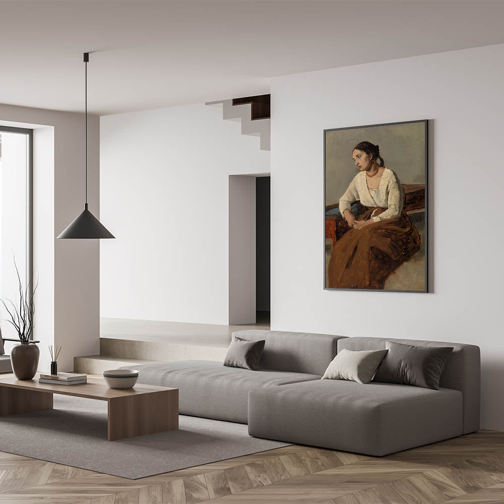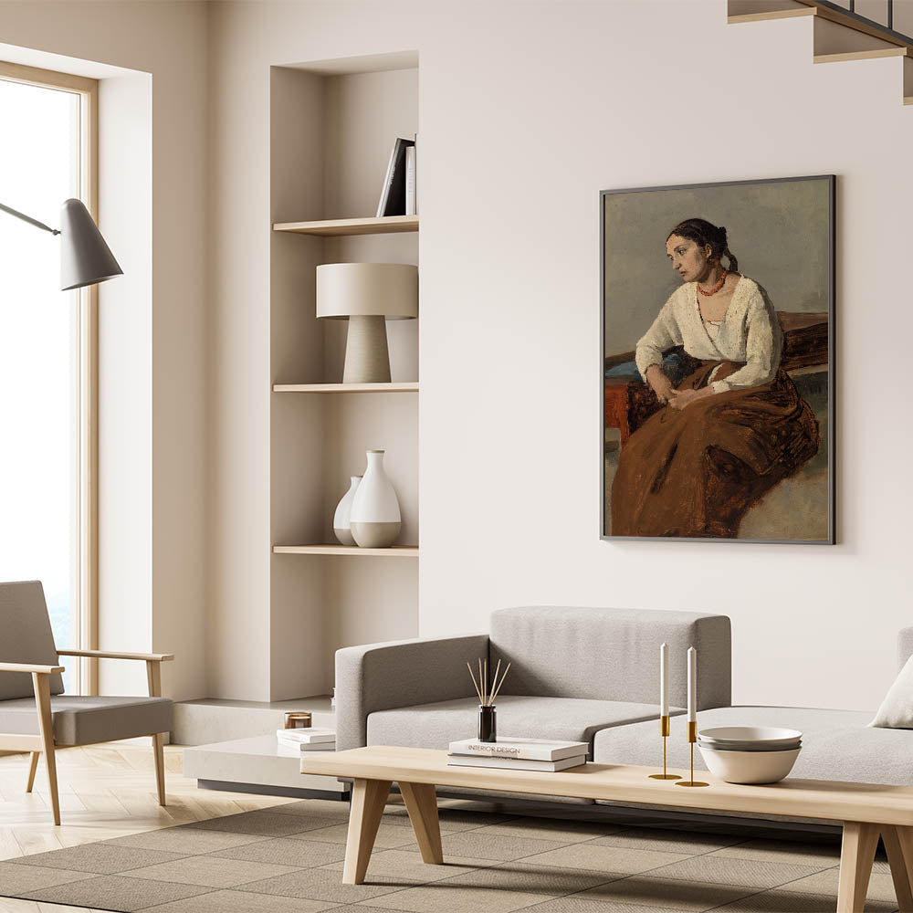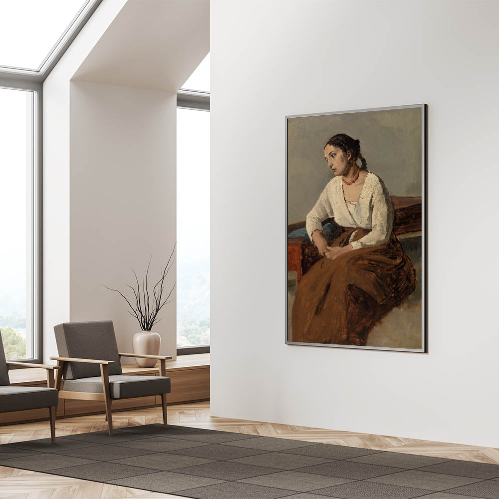 Add a touch of introspective beauty to your decor with "Melancholy Italian Woman (Rome)" by Jean-Baptiste-Camille Corot. This moving Realism portrait captures a young woman lost in thought, with a serene yet melancholic expression. Corot’s delicate brushwork and earthy color palette highlight the simplicity of her attire and surroundings, emphasizing the depth of her mood and character. This artwork’s subtle detail and subdued tones make it a timeless piece, perfect for adding an emotional and reflective touch to any room.