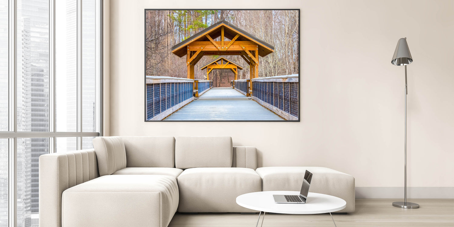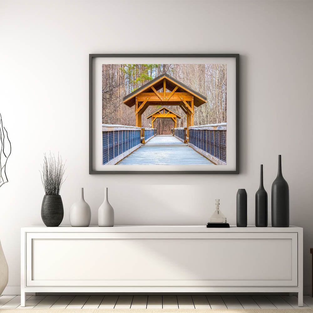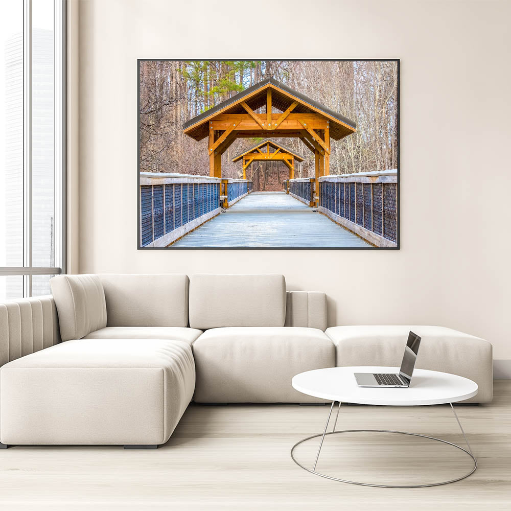 Whether you're looking to decorate your home or workspace, this Raleigh wooden bridge wall art will bring warmth and serenity to any room. Experience the calming beauty of Raleigh’s natural pathways in your own space.