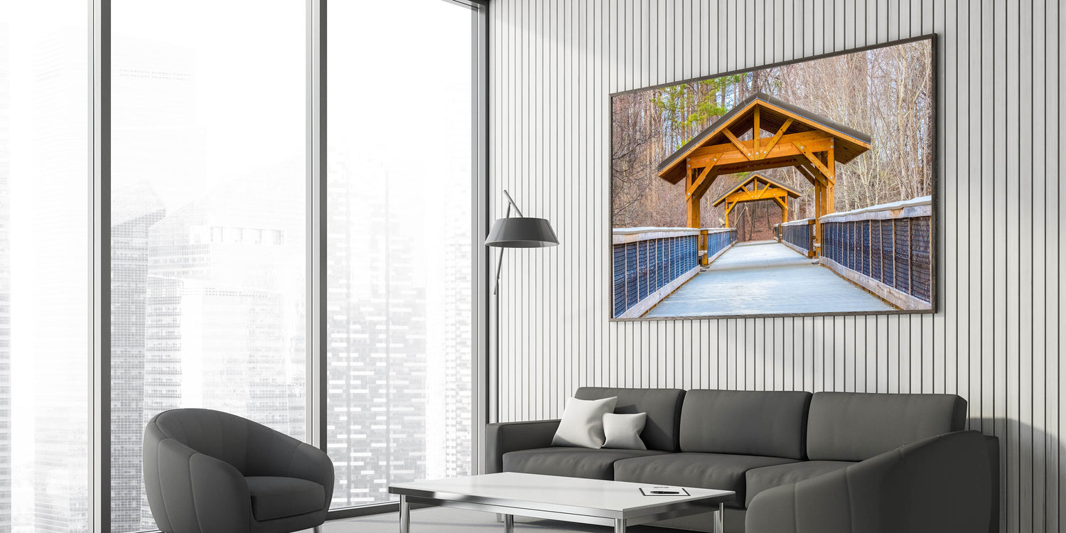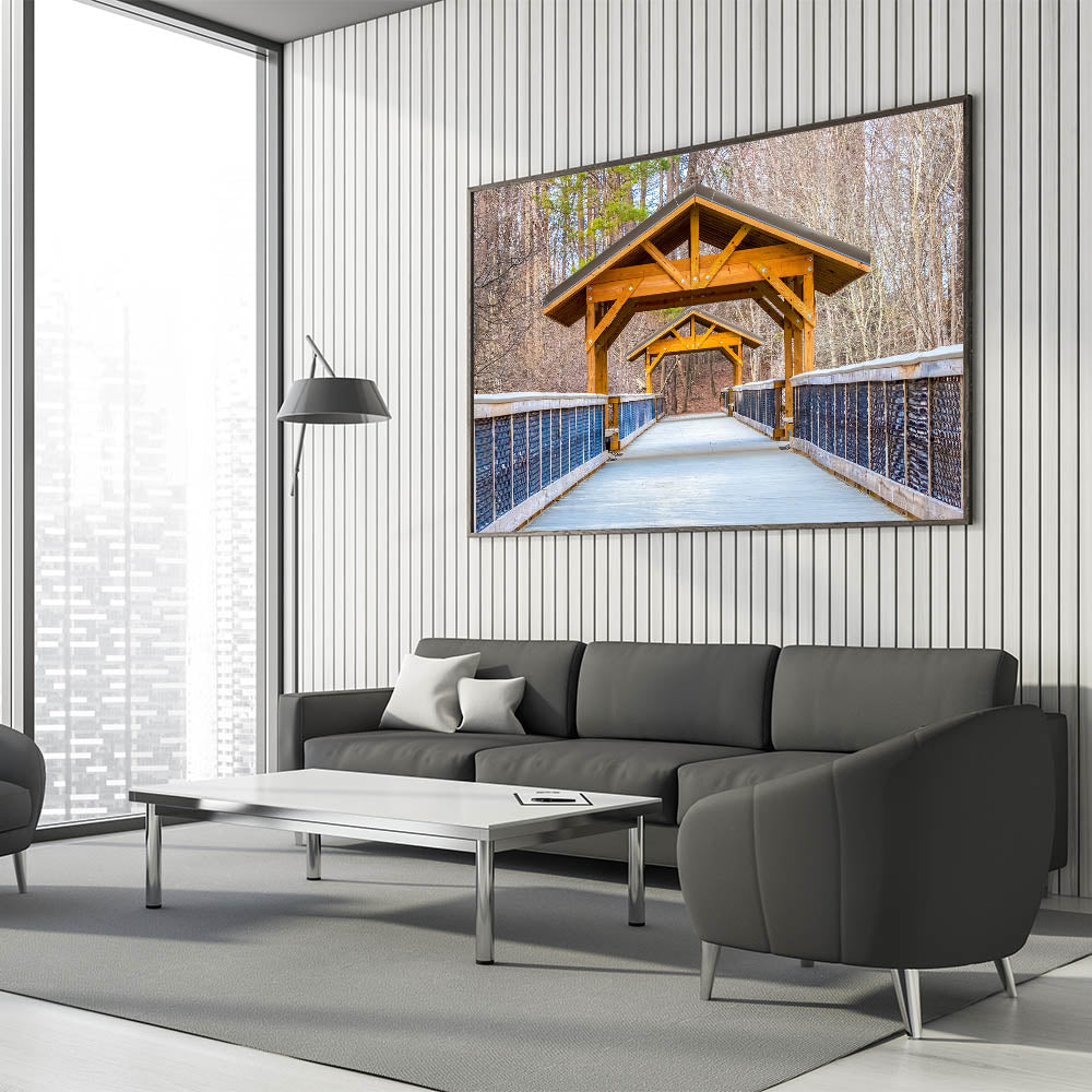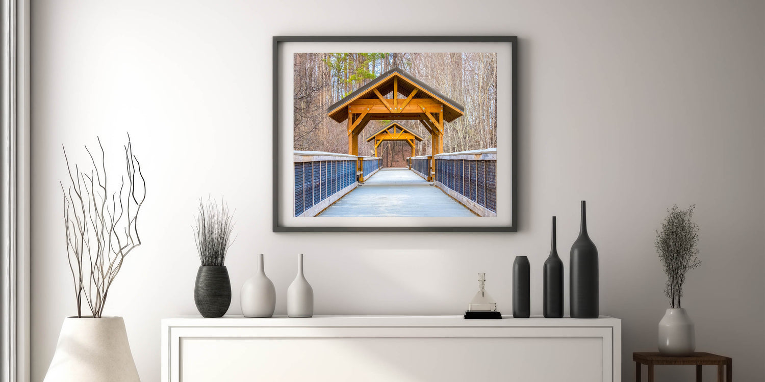 Whether you're looking to decorate your home or workspace, this Raleigh wooden bridge wall art will bring warmth and serenity to any room. Experience the calming beauty of Raleigh’s natural pathways in your own space.