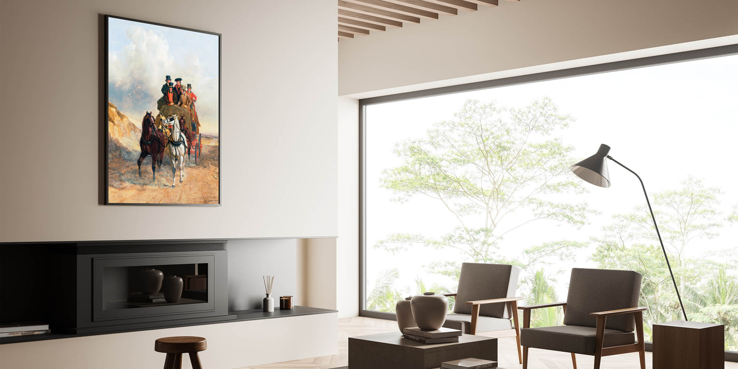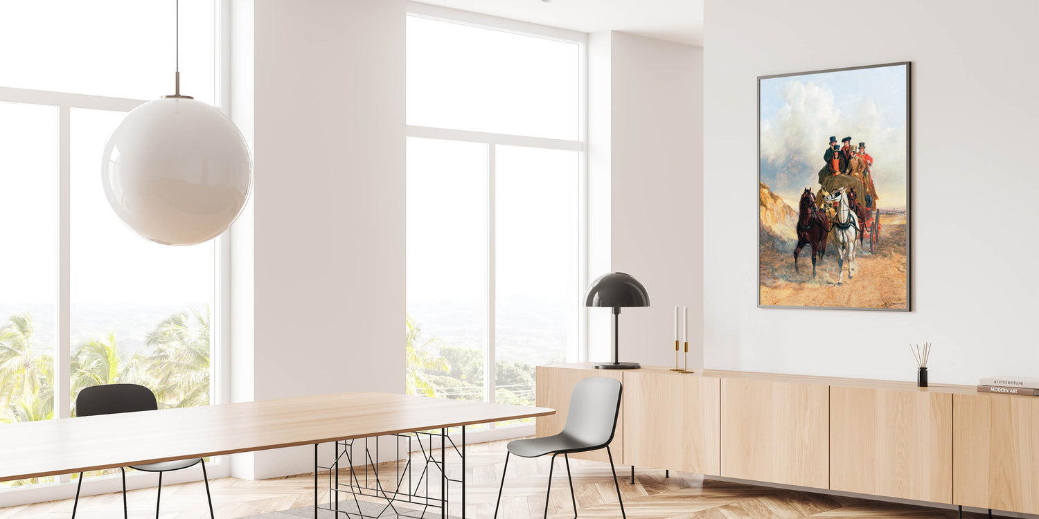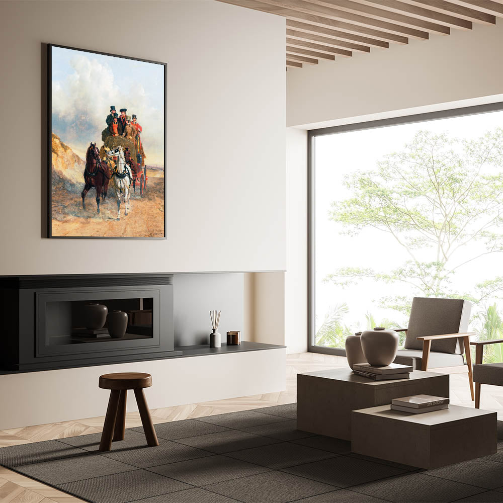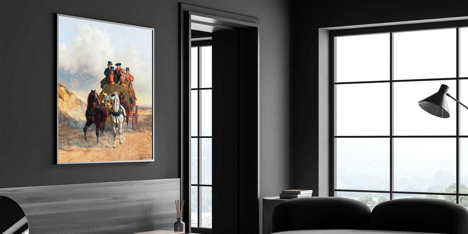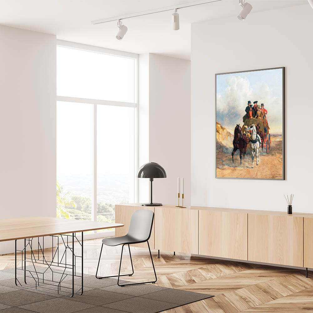 Choose The Royal Mail Coach on the Road to enrich your space with timeless British charm and historical significance. This fine art realism piece makes a statement in any room, offering a glimpse into a bygone era.
