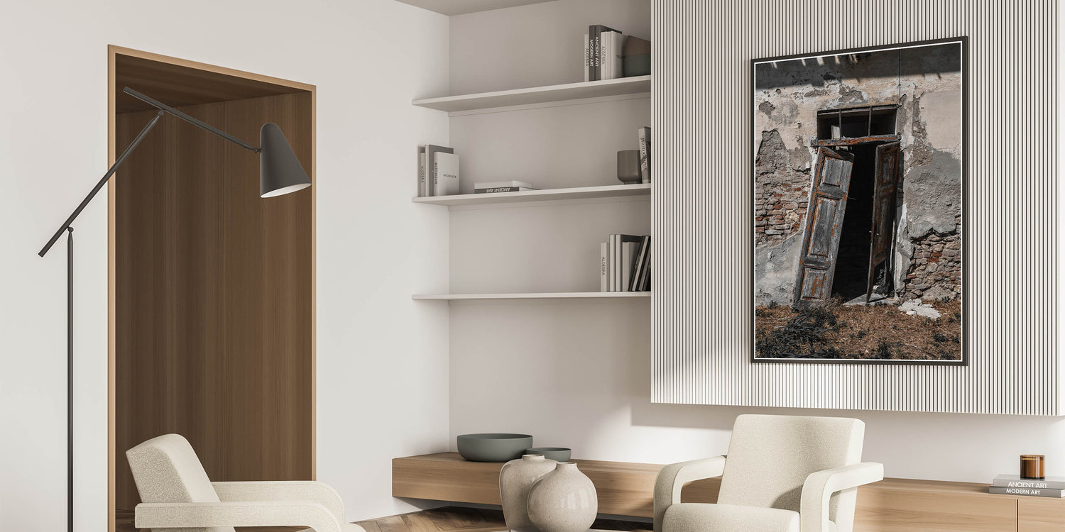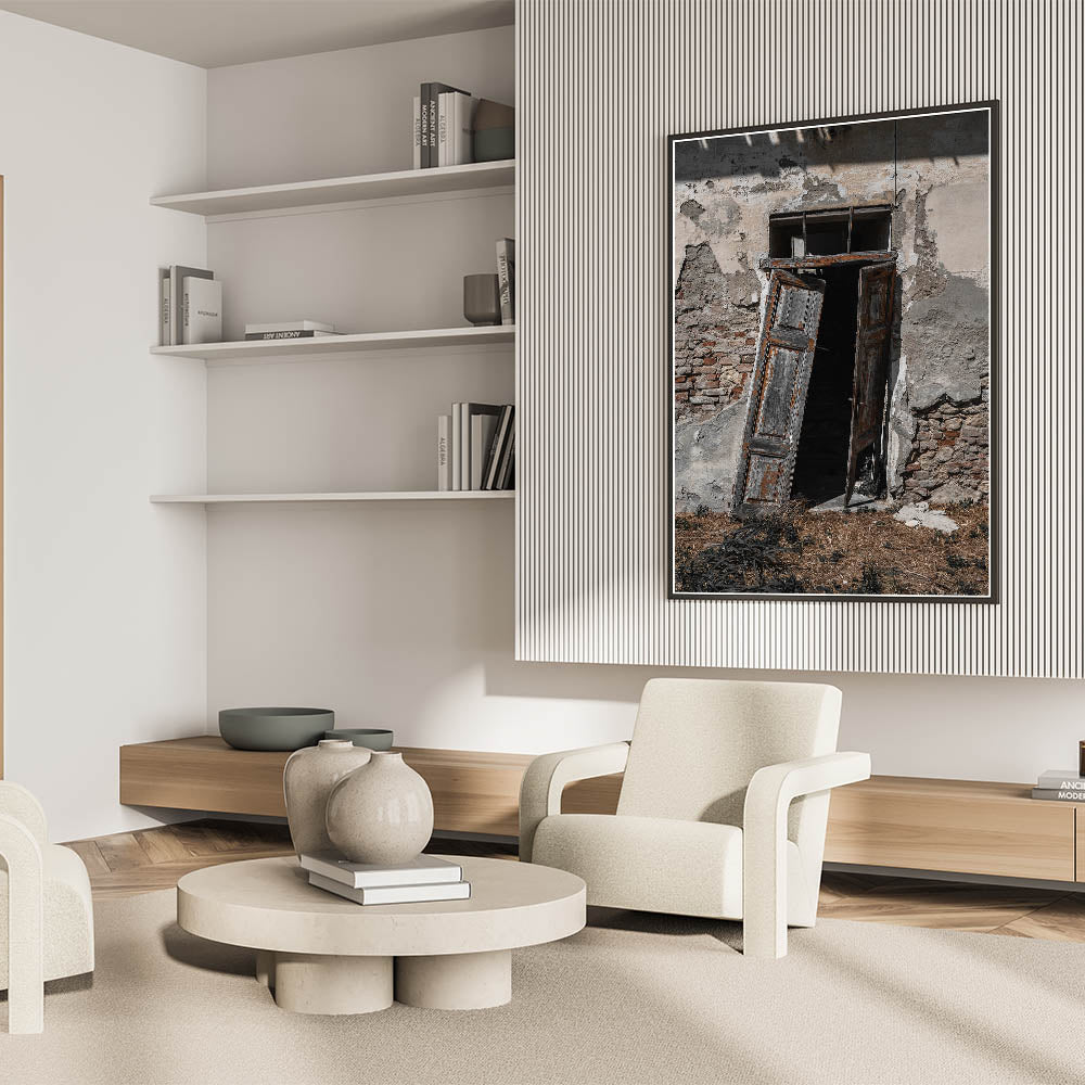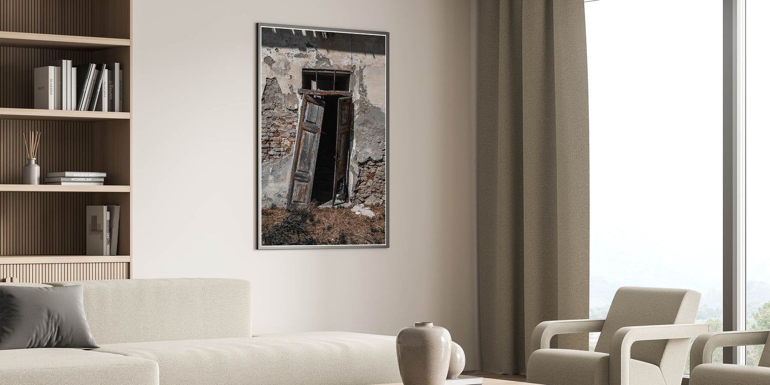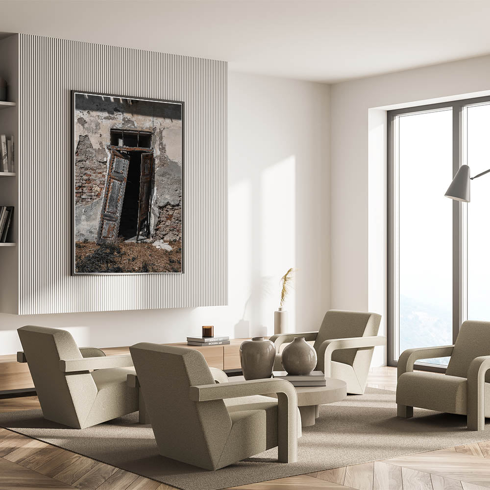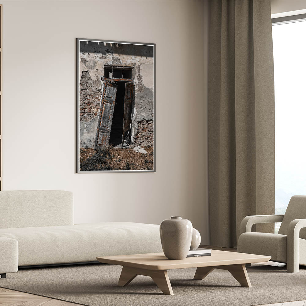 Step into the charm of forgotten places with this striking rustic wall art, featuring a weathered doorway of an abandoned building. The peeling paint, crumbling stone, and the sense of decay evoke the passage of time, making this piece perfect for those who appreciate the beauty in aged, imperfect structures. The door, leaning precariously ajar, invites the viewer to imagine the stories hidden within, adding a sense of mystery and nostalgia.