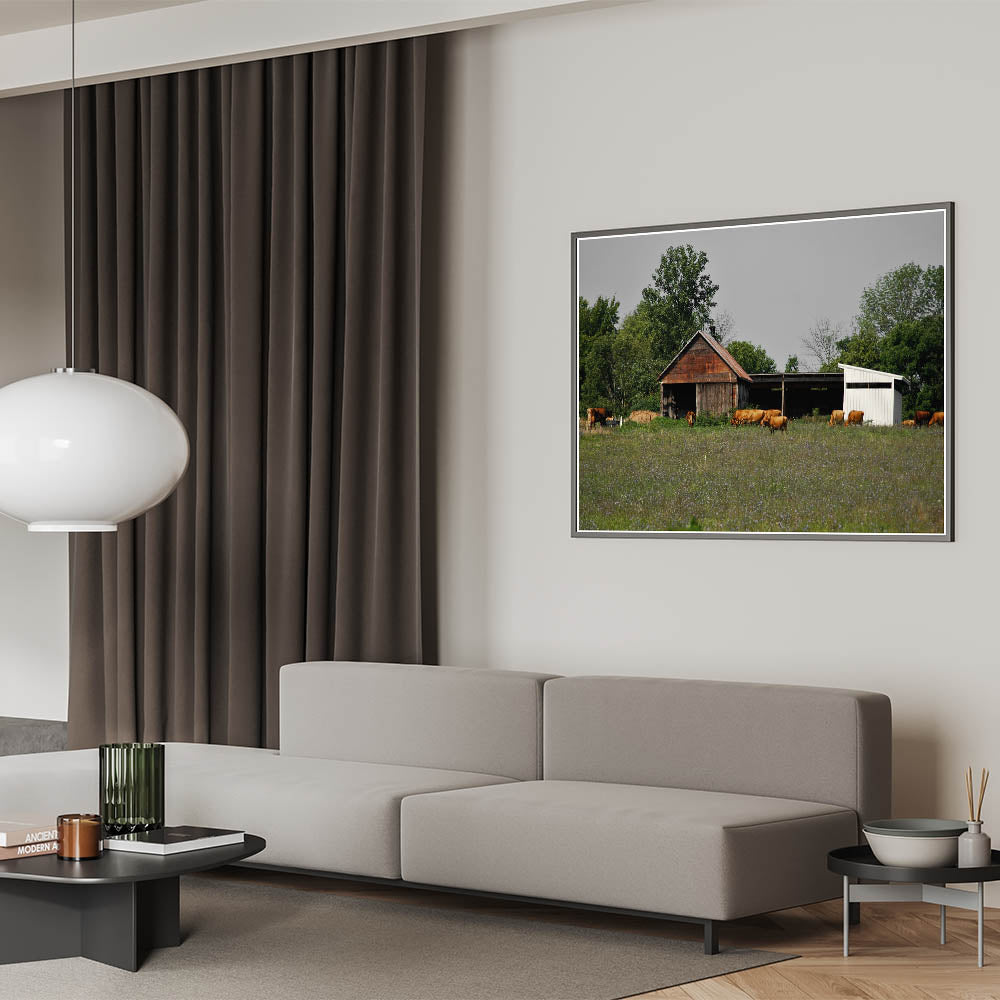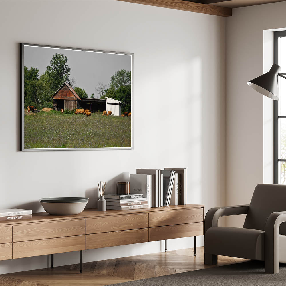Bring the tranquility of rural life into your home with this beautiful rustic wall art featuring a barn and cattle grazing in a lush green field. The combination of the weathered barn and the peaceful cattle creates a calming, countryside atmosphere that is perfect for adding a farmhouse touch to your home decor. The earthy tones and natural setting make this artwork an ideal addition to any rustic-themed space, whether it’s a living room, kitchen, or hallway.