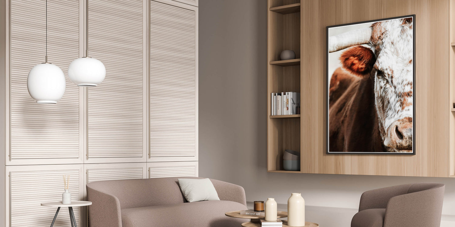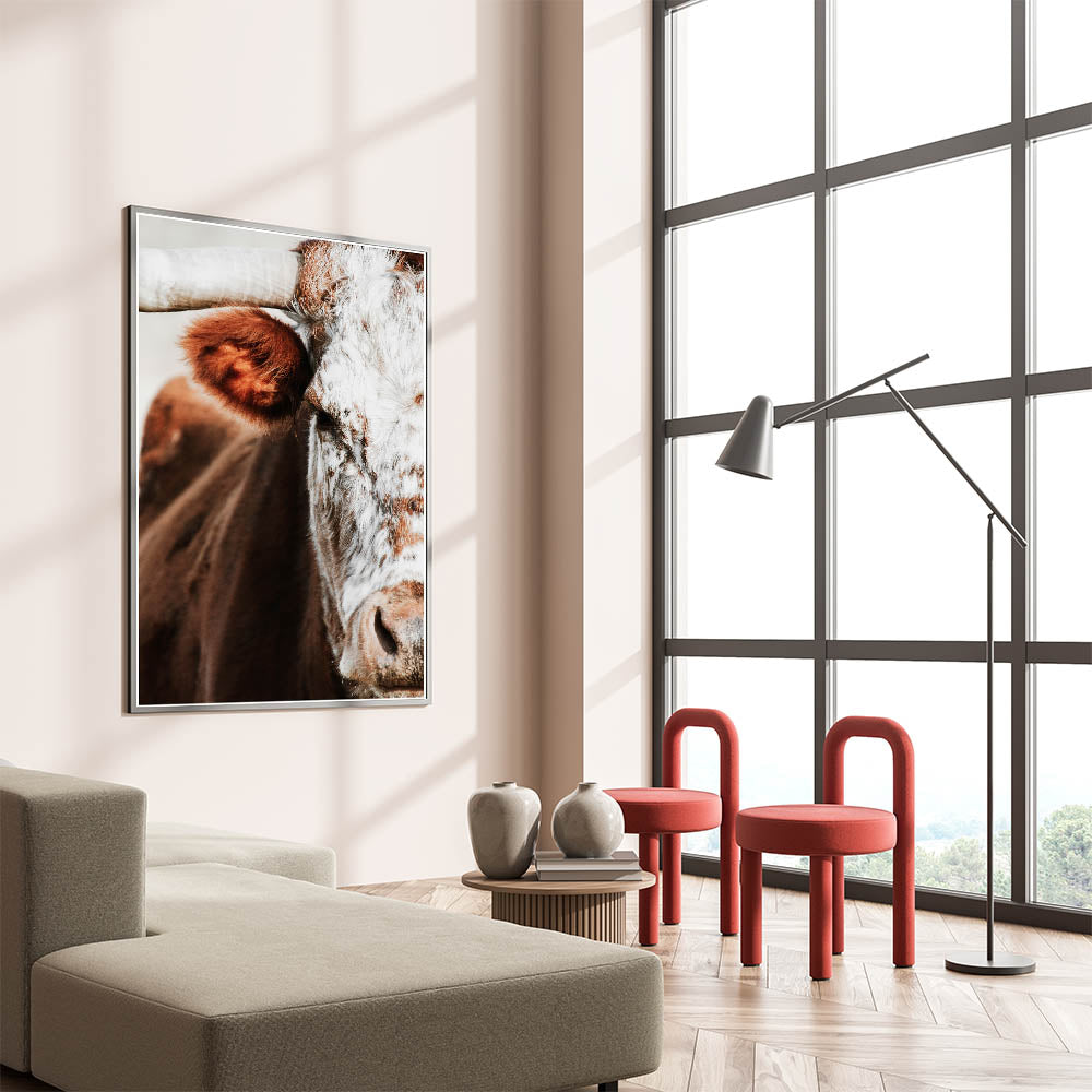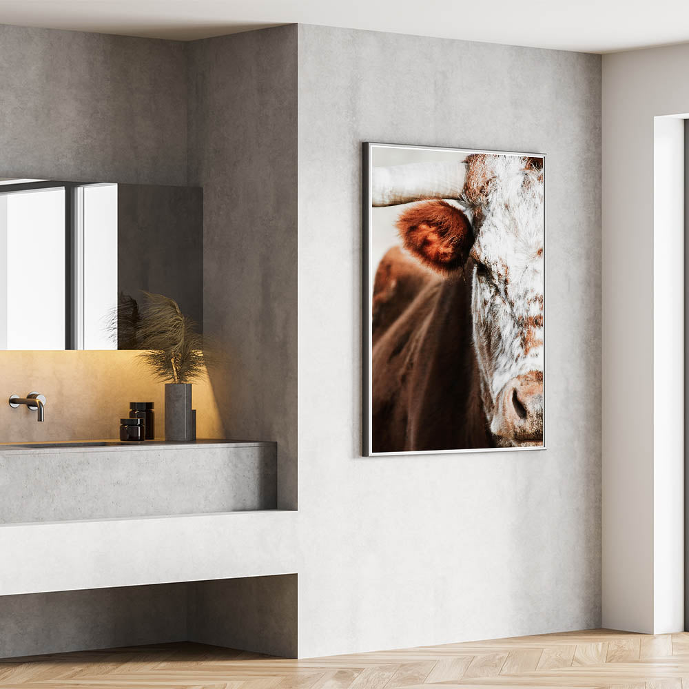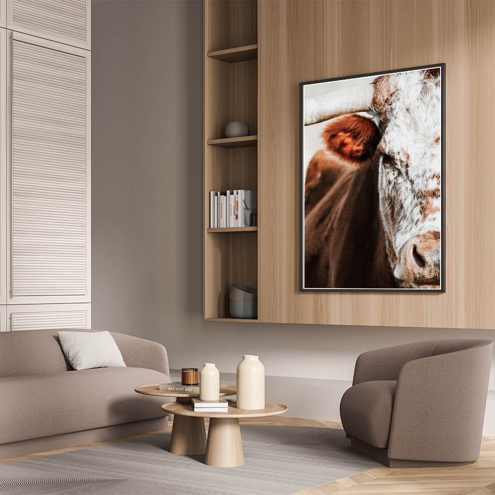 Celebrate the charm of rural life with this striking wall art featuring a close-up of a cow. The detailed textures of the cow's fur and horns, along with the earthy brown and white tones, make this piece perfect for anyone who appreciates the beauty of farm animals. This artwork captures the essence of life on a farm, bringing warmth and character to any space. Whether you're decorating a farmhouse, cabin, or adding a rustic touch to a modern home, this cow close-up adds a cozy, country feel to your decor.
