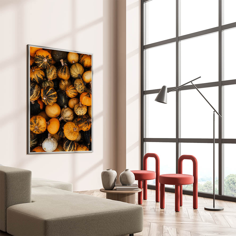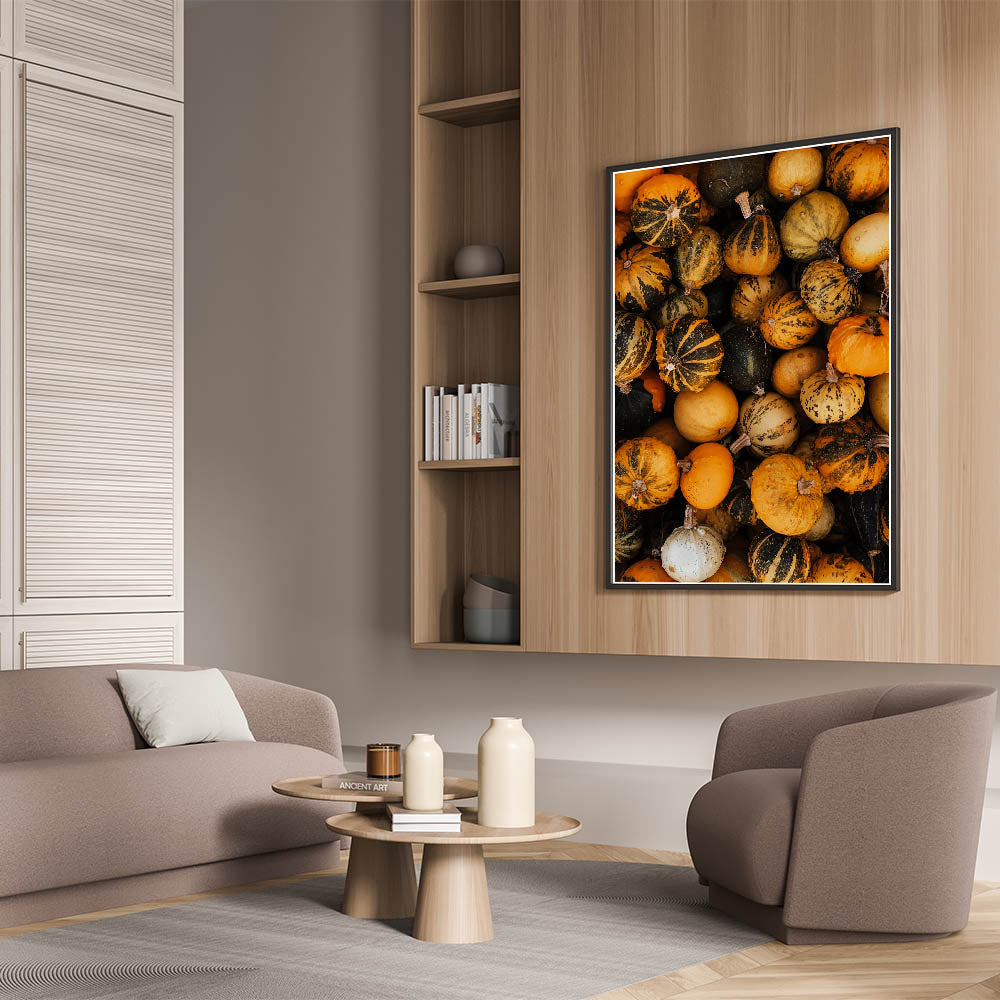 - Depicts a striking array of gourds and pumpkins in rich fall colors.