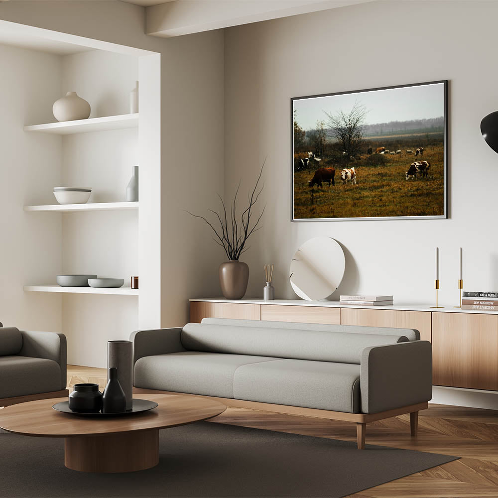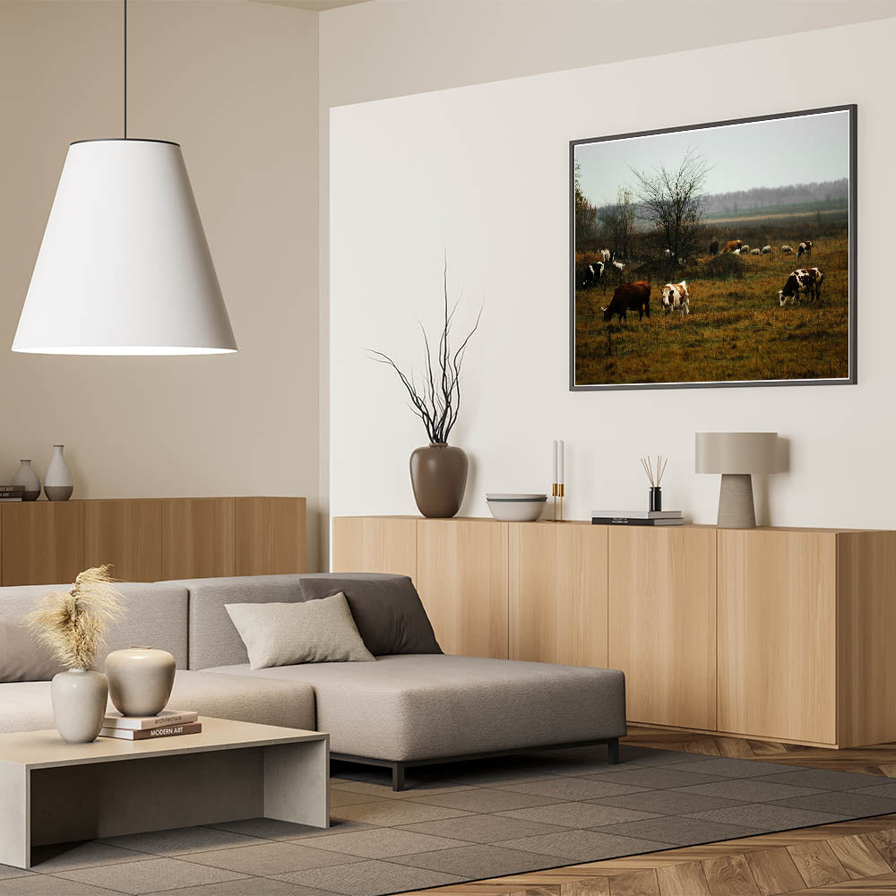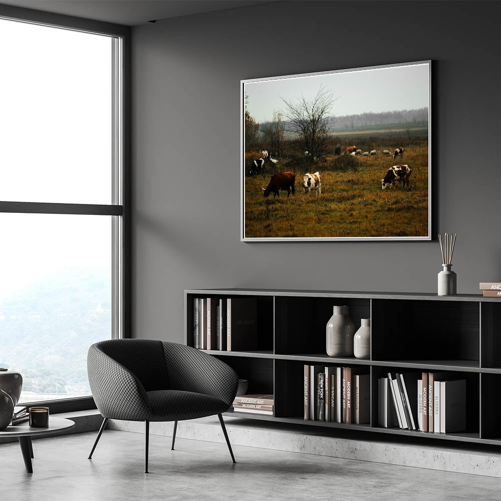 Rustic Farm Landscape Wall Art – Grazing Cows in Serene Pasture Scene