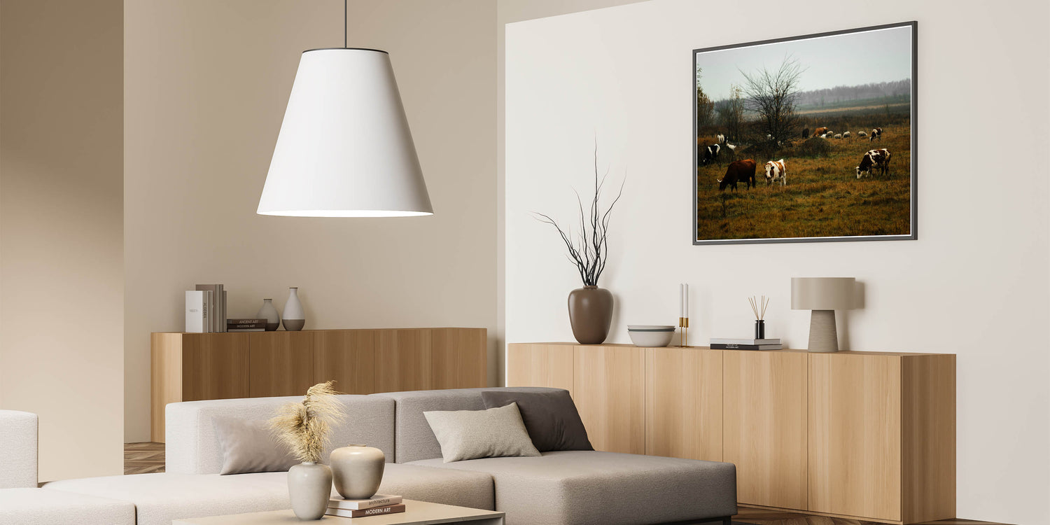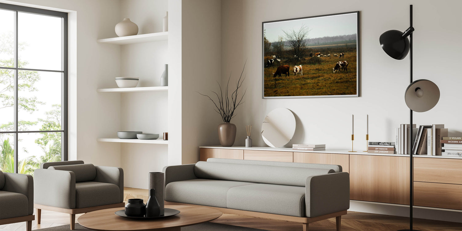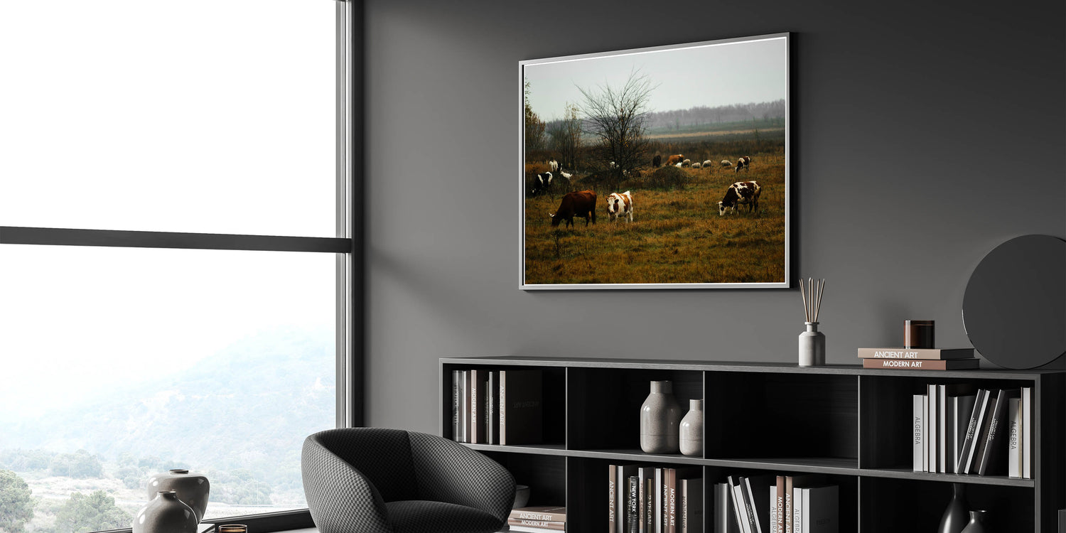Rustic Farm Landscape Wall Art – Grazing Cows in Serene Pasture Scene