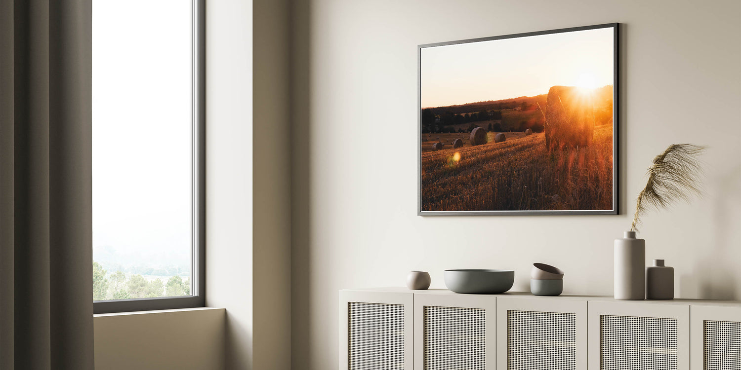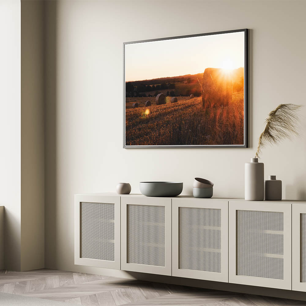 - High-quality print capturing the warm glow of the sun and the detailed textures of the hay bales