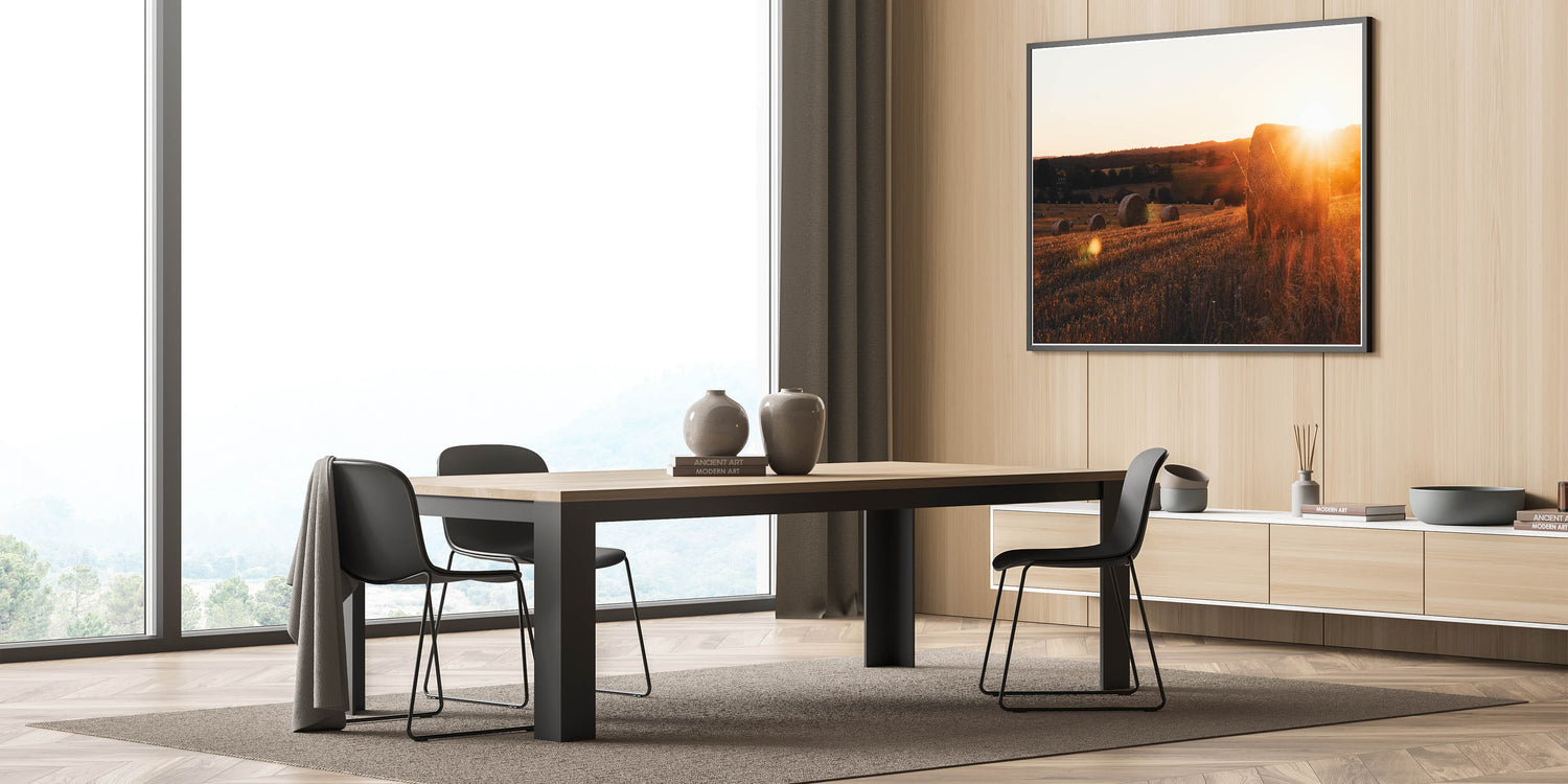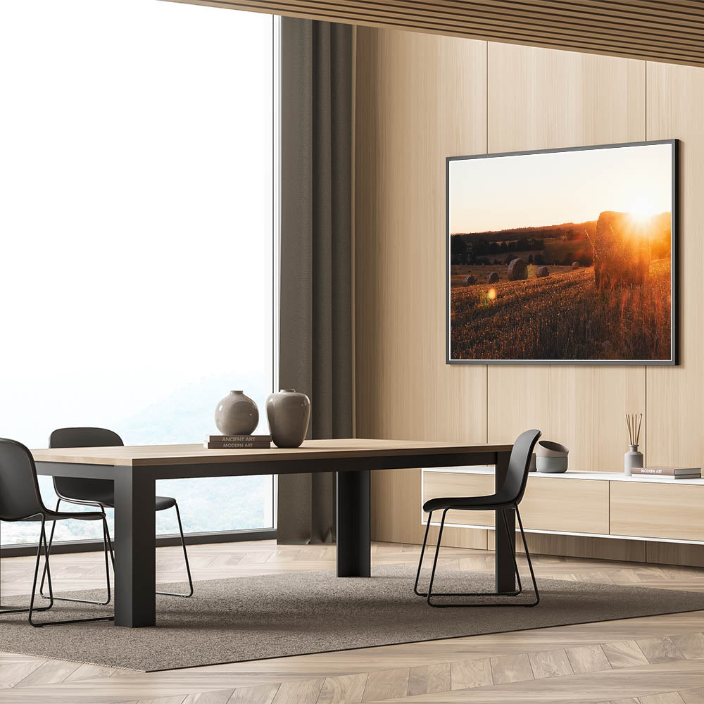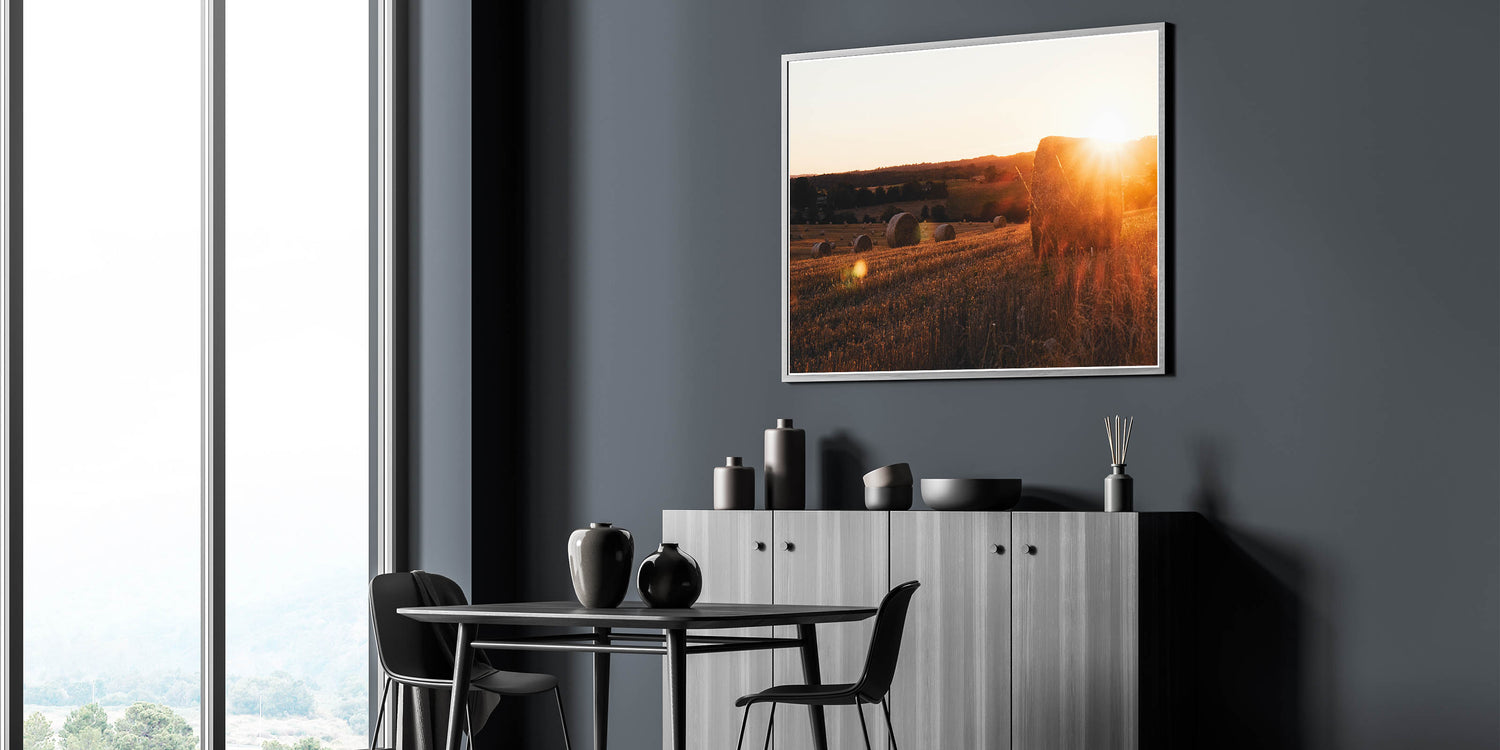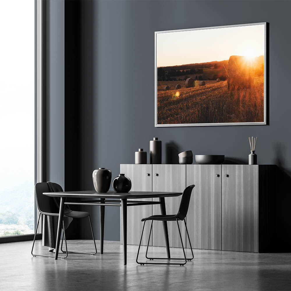Capture the beauty of rural life with this serene rustic wall art featuring sunlit hay bales scattered across a golden field at sunset. The warm tones of the setting sun, combined with the natural textures of the hay, create a calming and inviting atmosphere that brings the essence of the countryside into your home. This vintage-inspired wall art is perfect for those looking to add a peaceful, rustic touch to their decor.