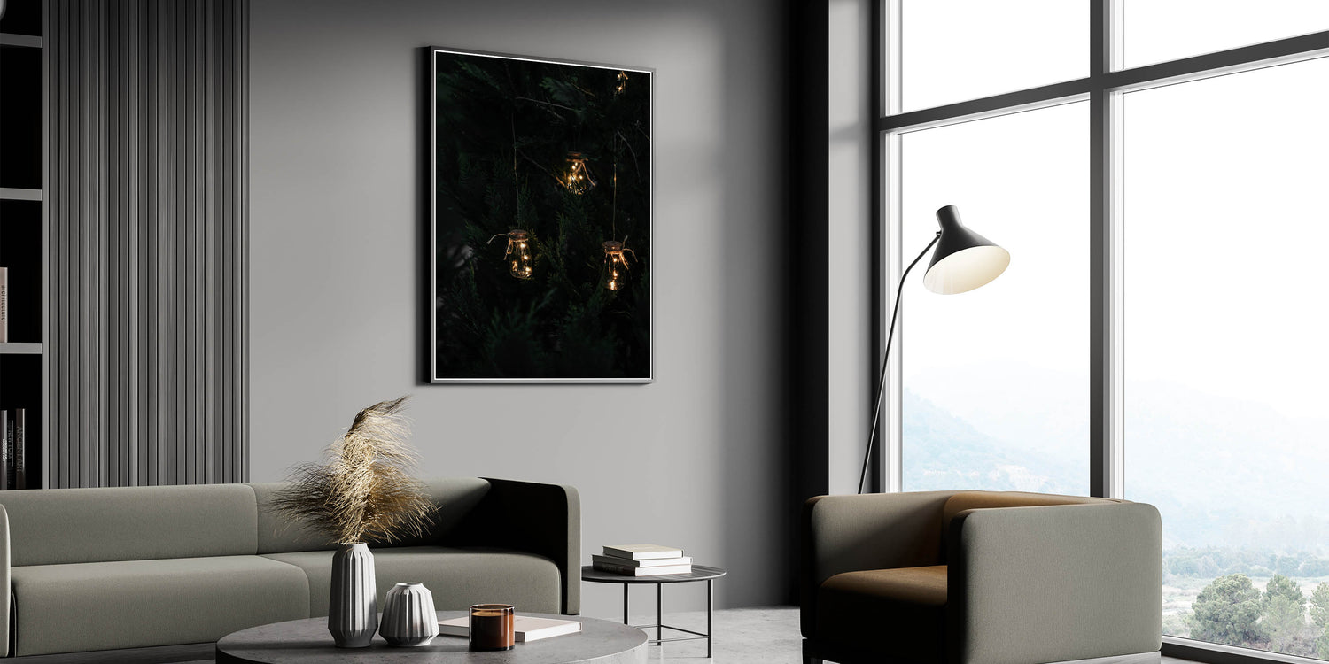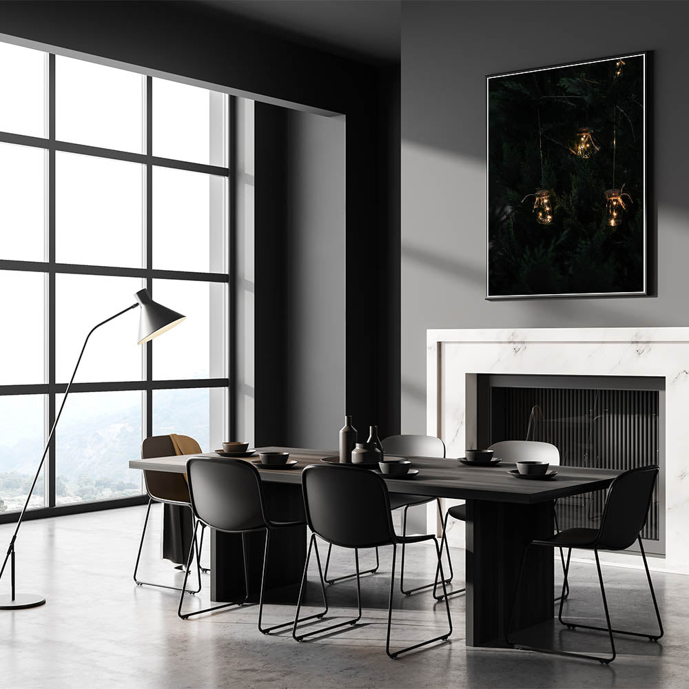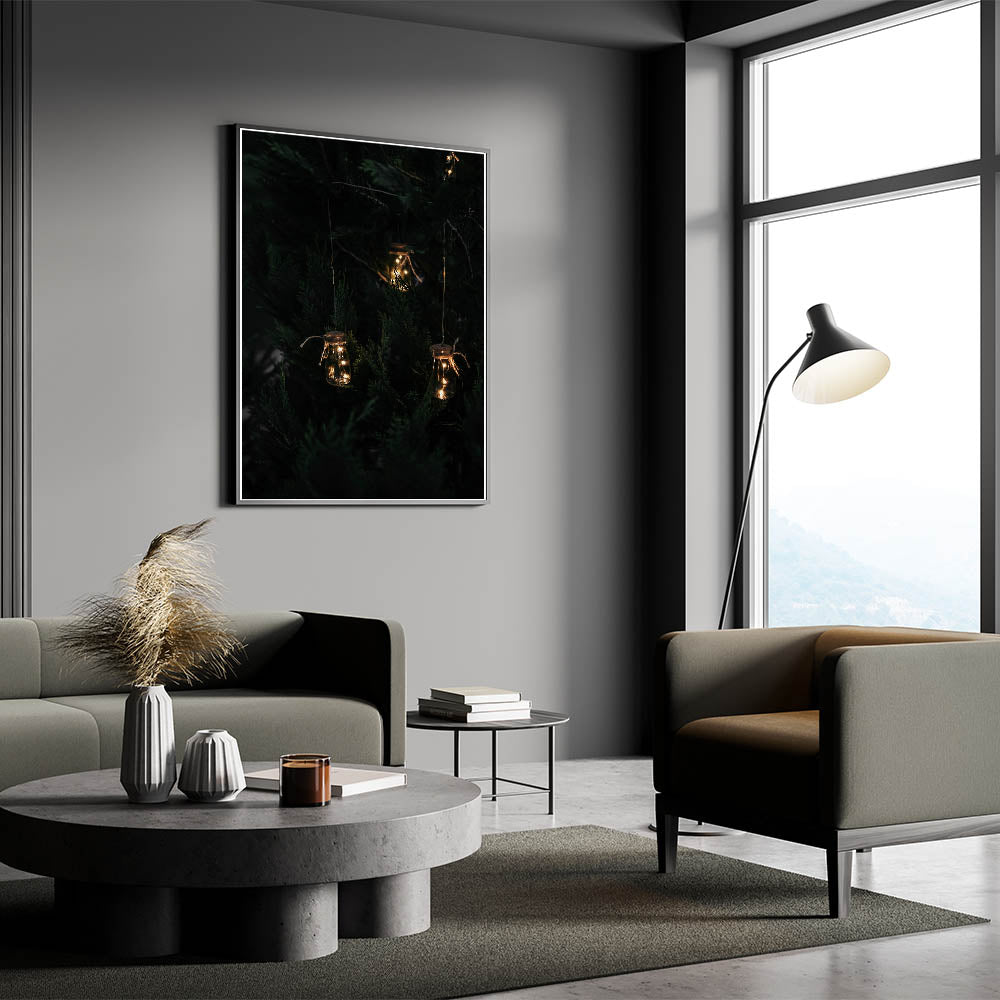 This rustic wall art captures the warm glow of fairy lights delicately placed inside mason jars, hanging amidst lush greenery. The soft, ambient lighting adds a touch of magic and coziness, making this piece perfect for creating a serene, inviting atmosphere in any room. Whether you're decorating for a festive occasion or looking to enhance your year-round rustic decor, this artwork brings a charming, whimsical touch to your home.