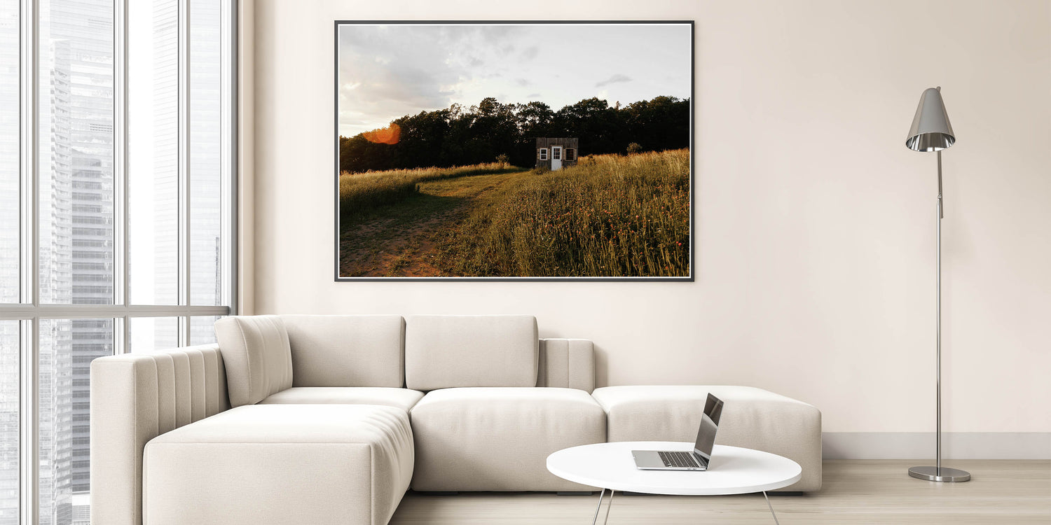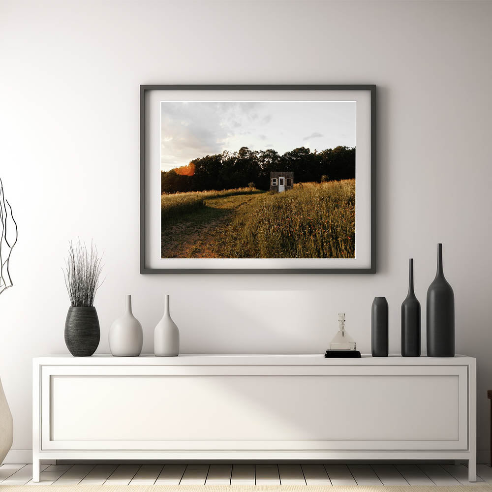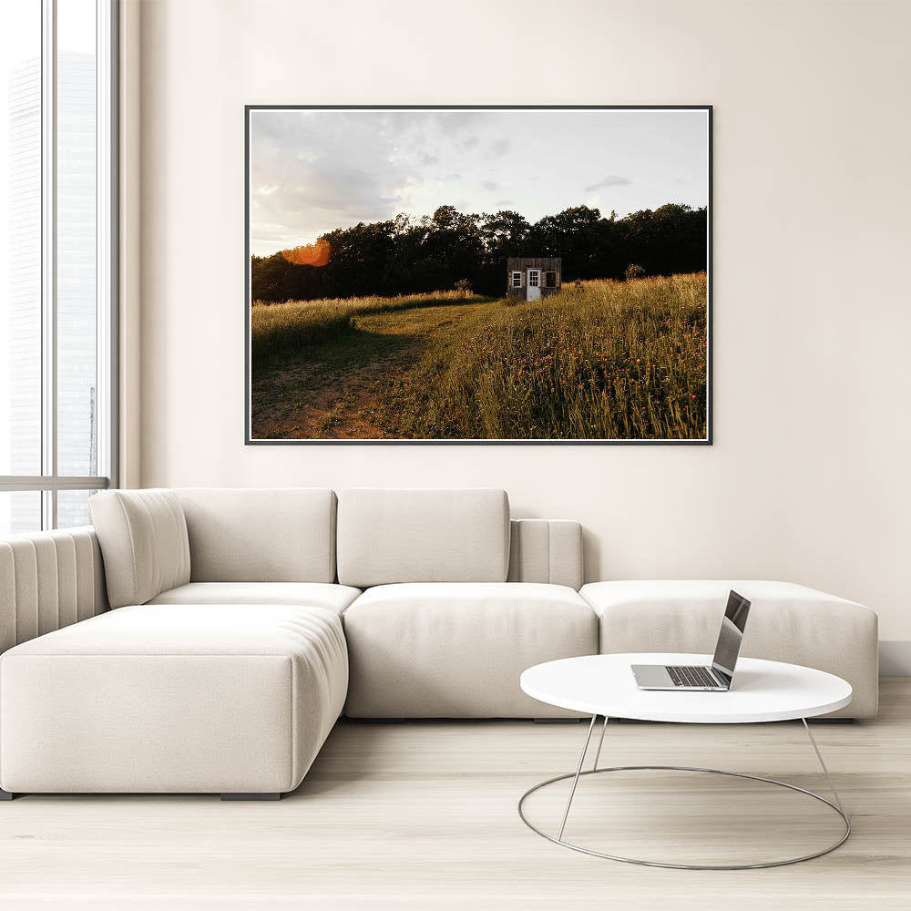 Rustic Landscape Wall Art – Peaceful Farmhouse Cabin in Golden Field
