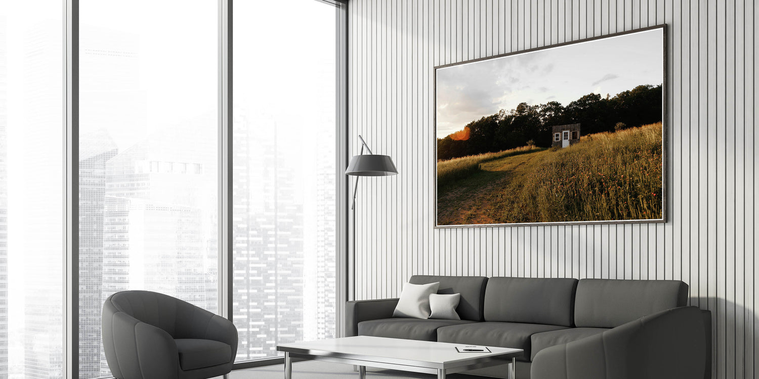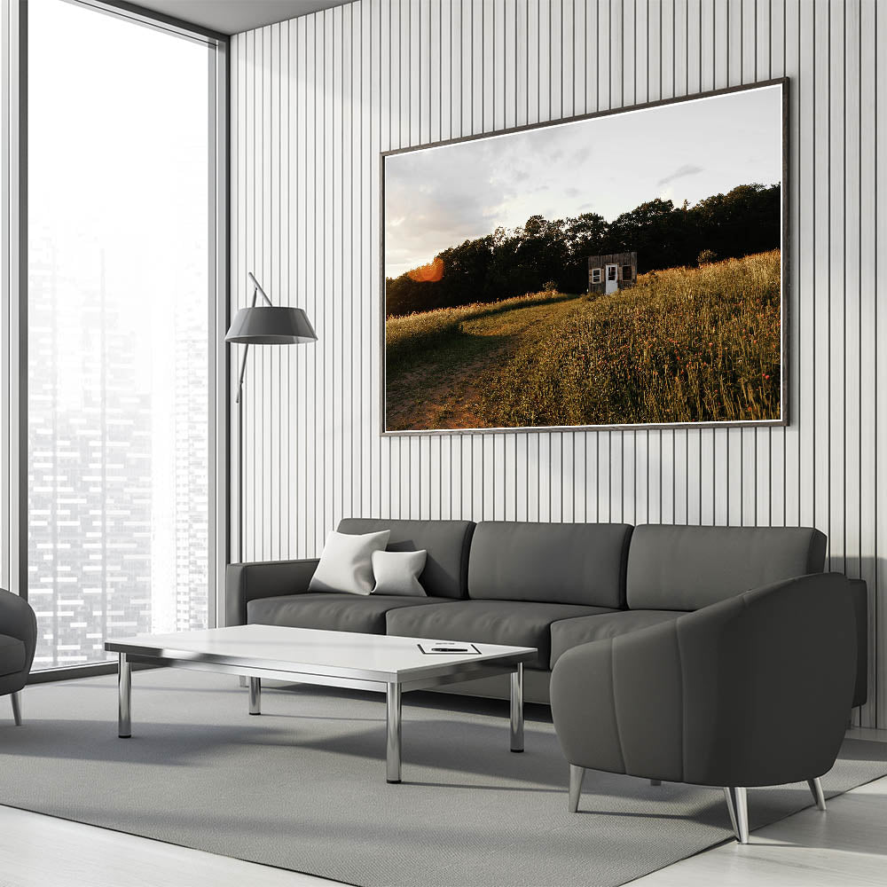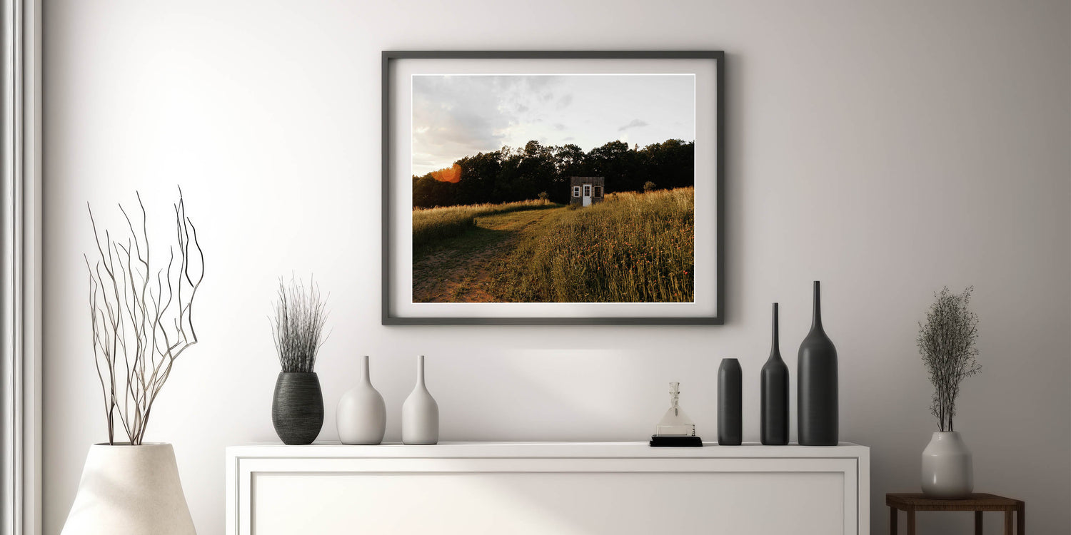 Rustic Landscape Wall Art – Peaceful Farmhouse Cabin in Golden Field