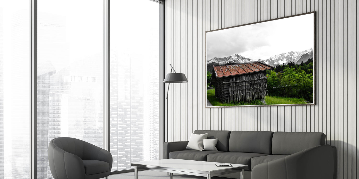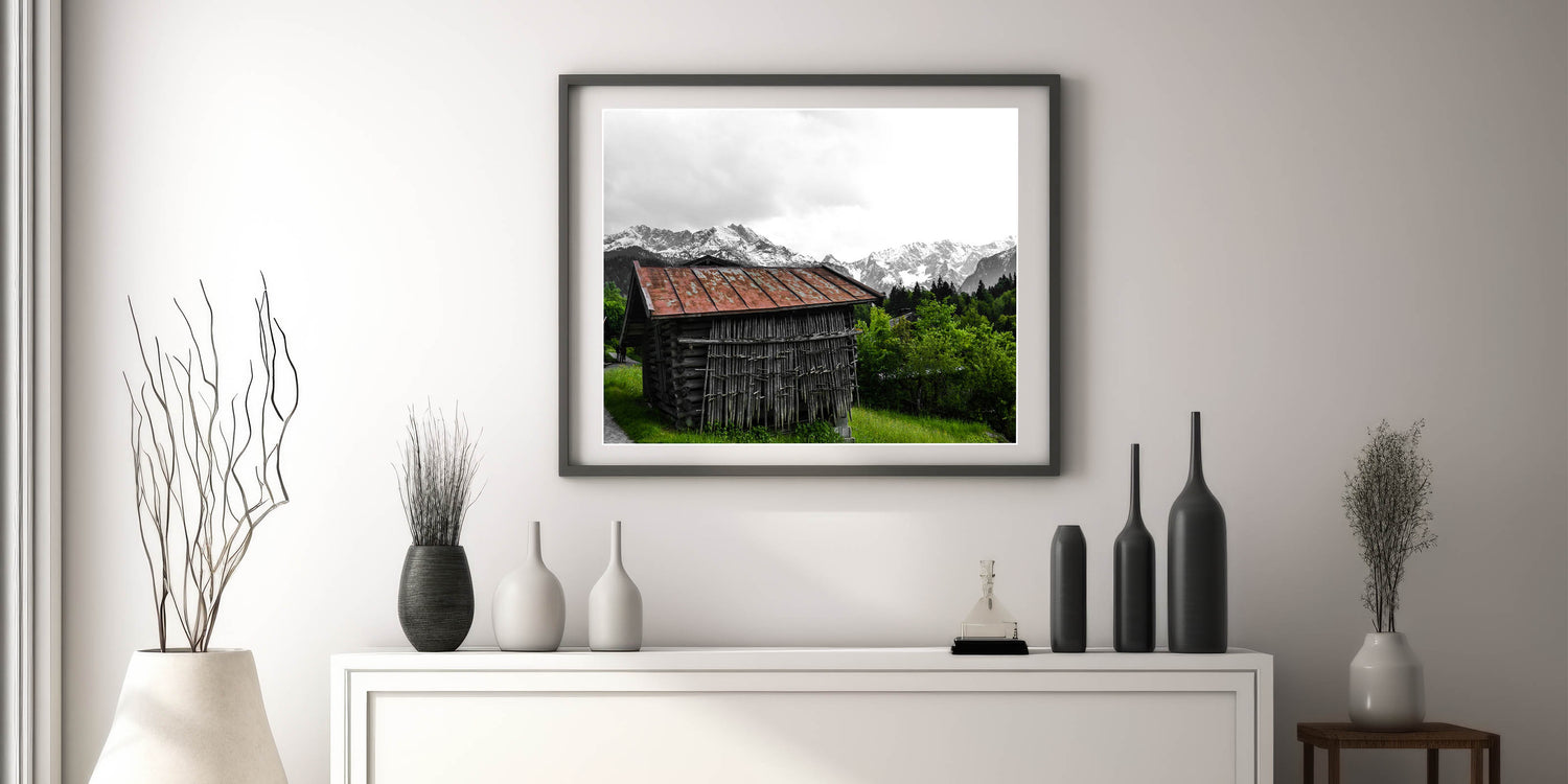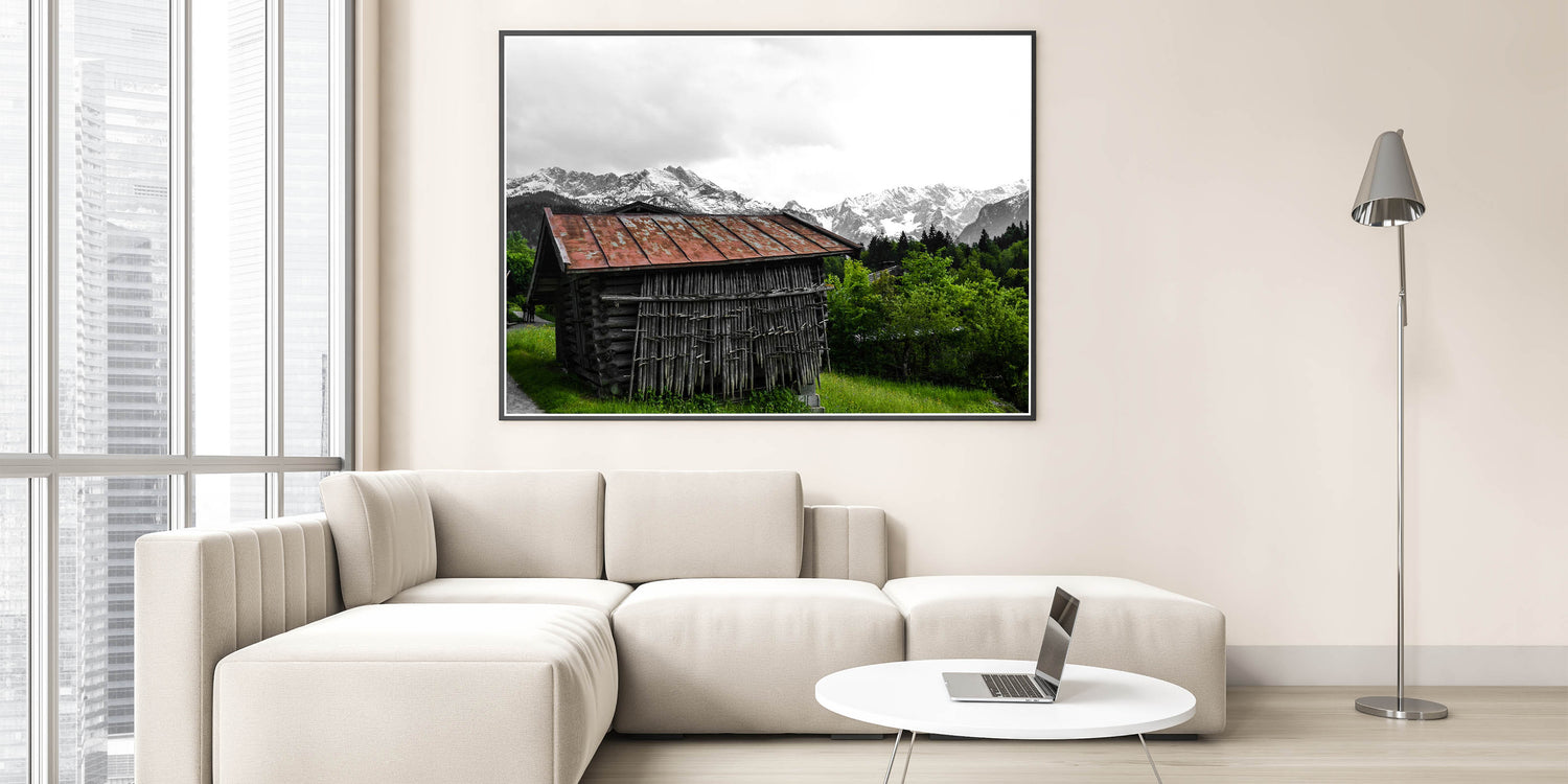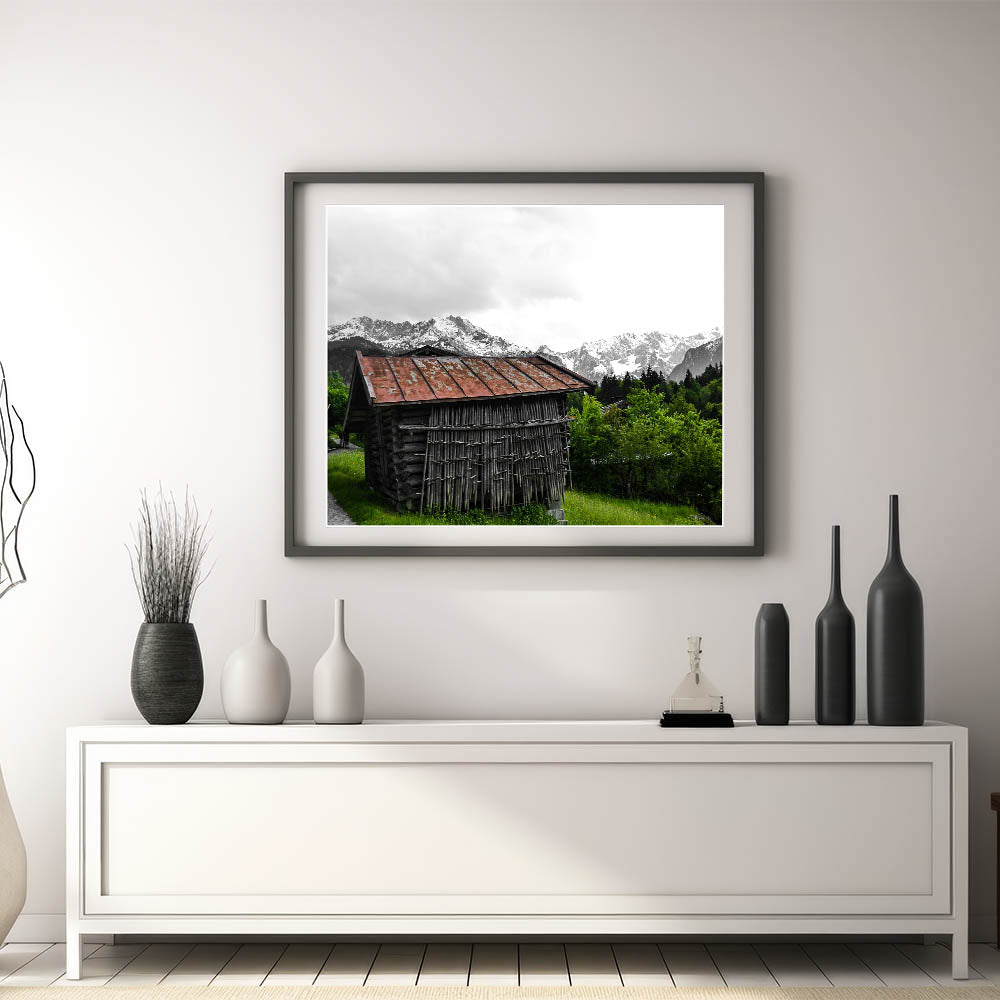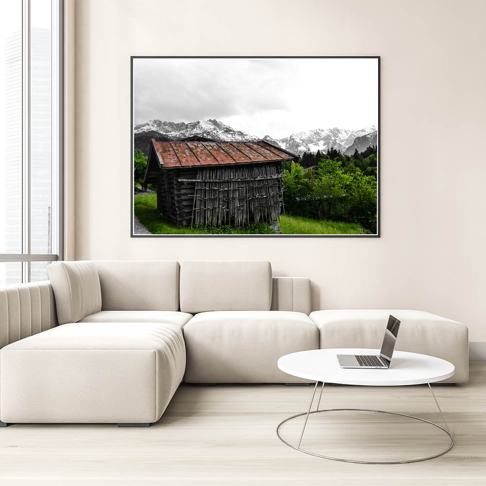 - High-quality print capturing the fine details of the weathered cabin and the dramatic mountain landscape