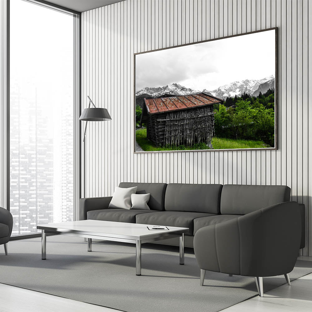 This rustic nature scene is a perfect representation of the simple beauty of life in the mountains. Add this piece to your home to evoke the charm of a secluded cabin with stunning alpine views.