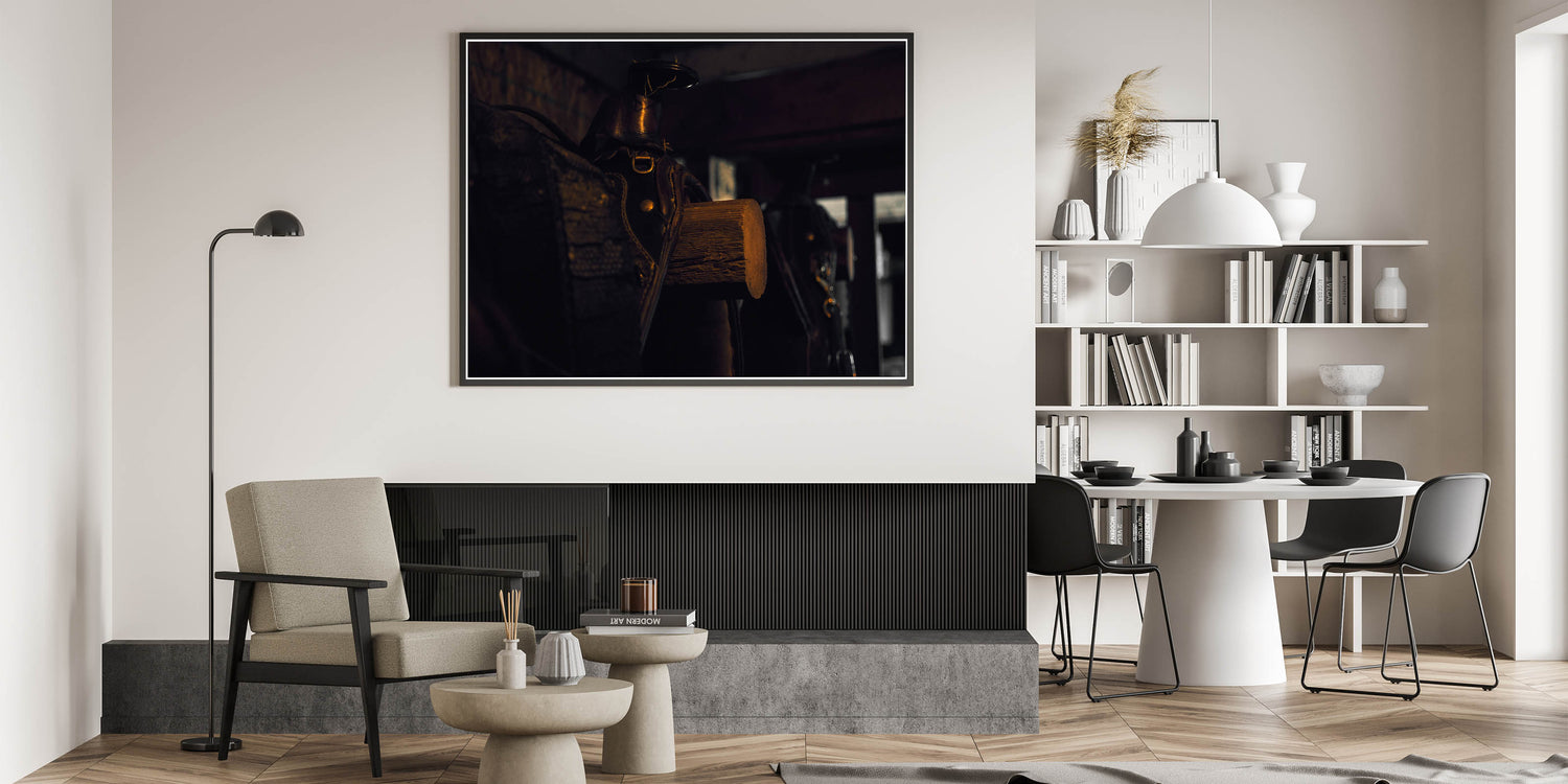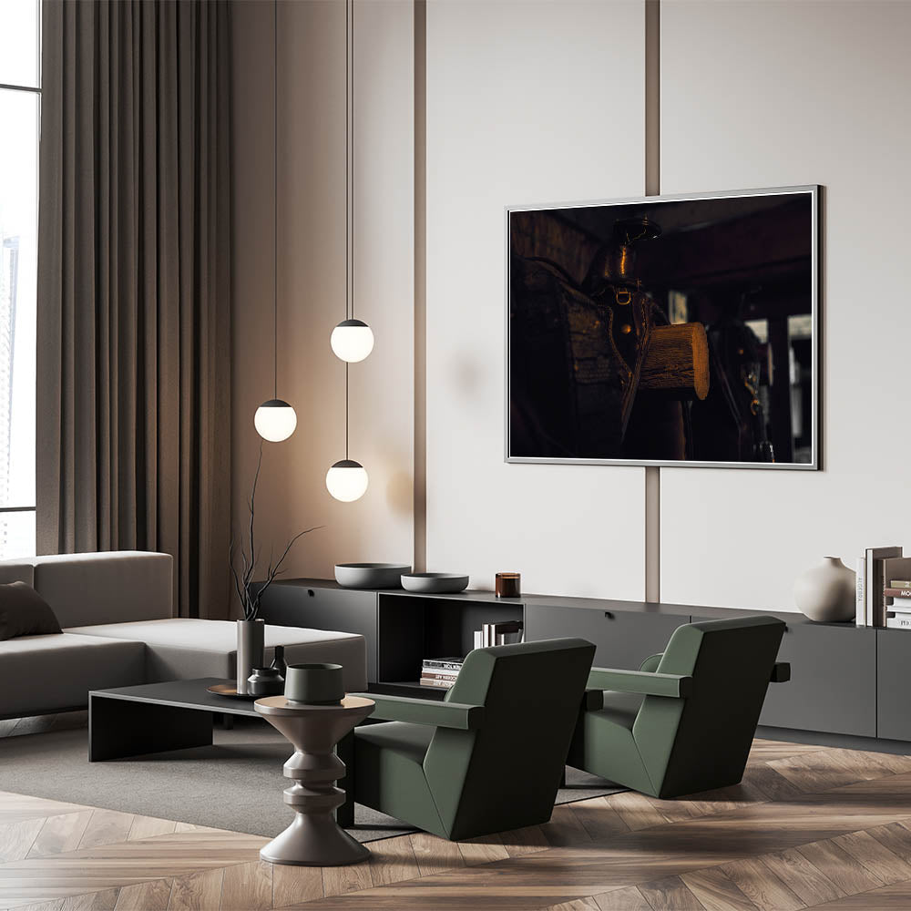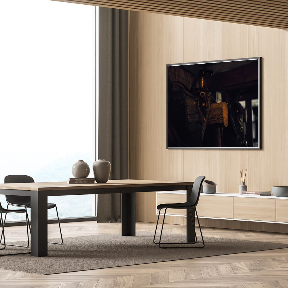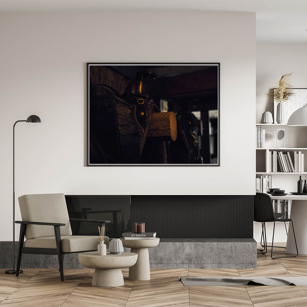 - High-quality print capturing the intricate details of the saddle and the rich textures of the barn wood