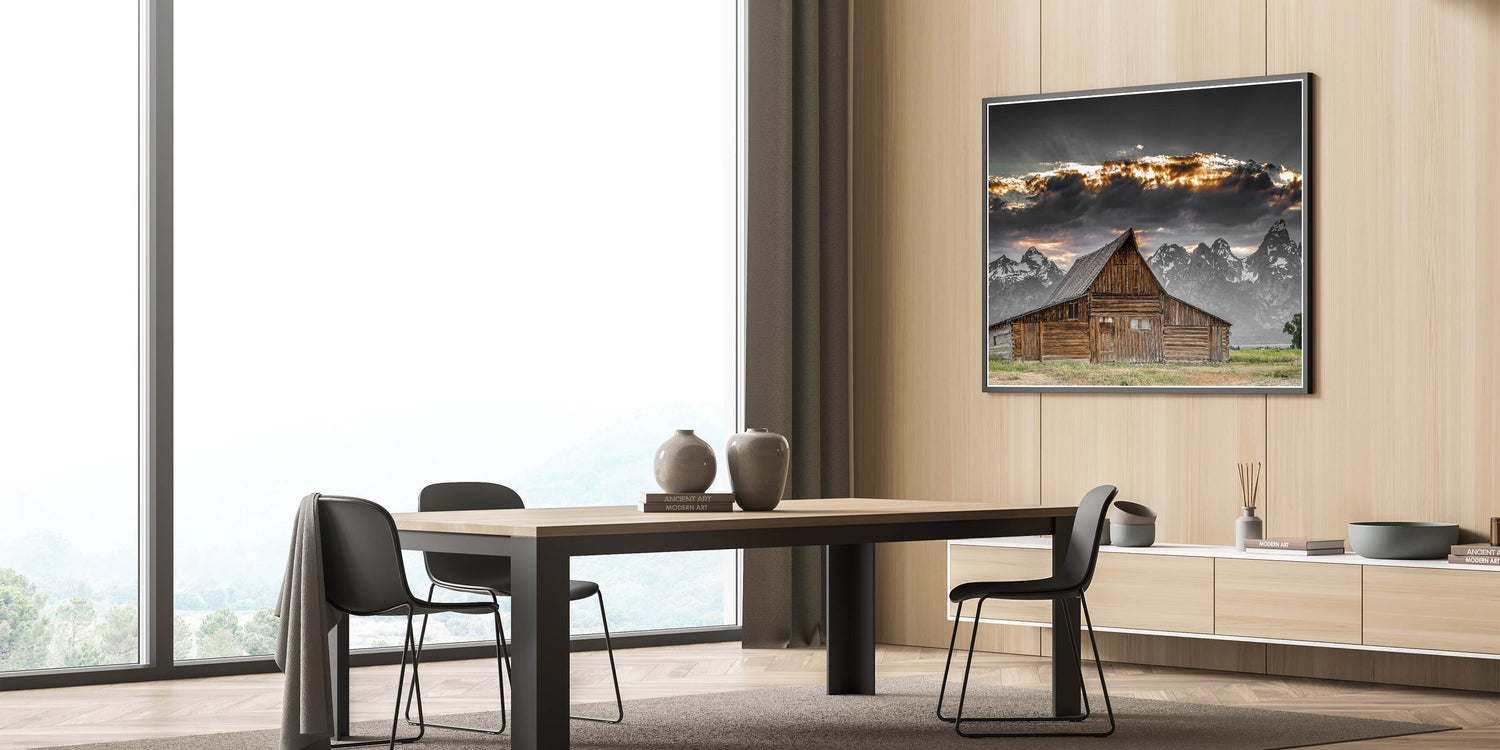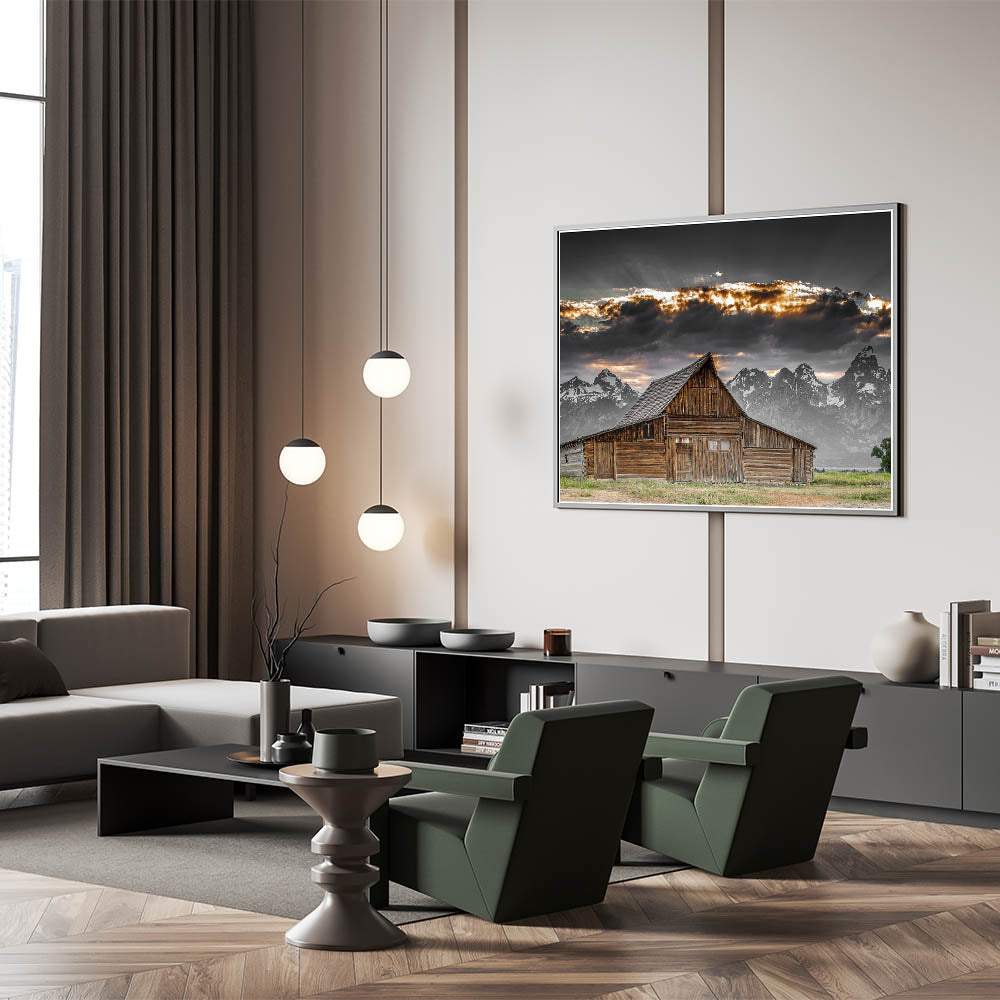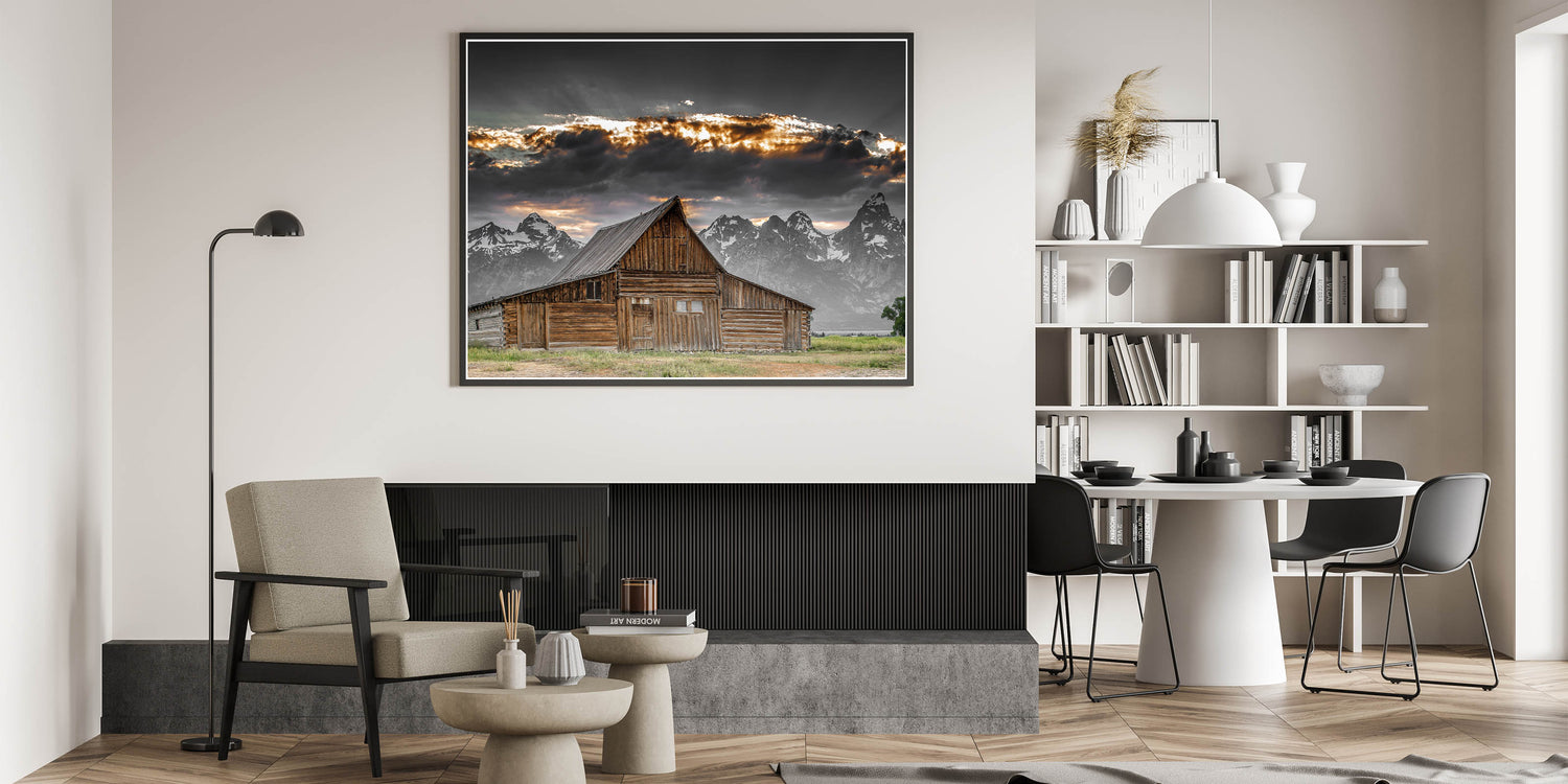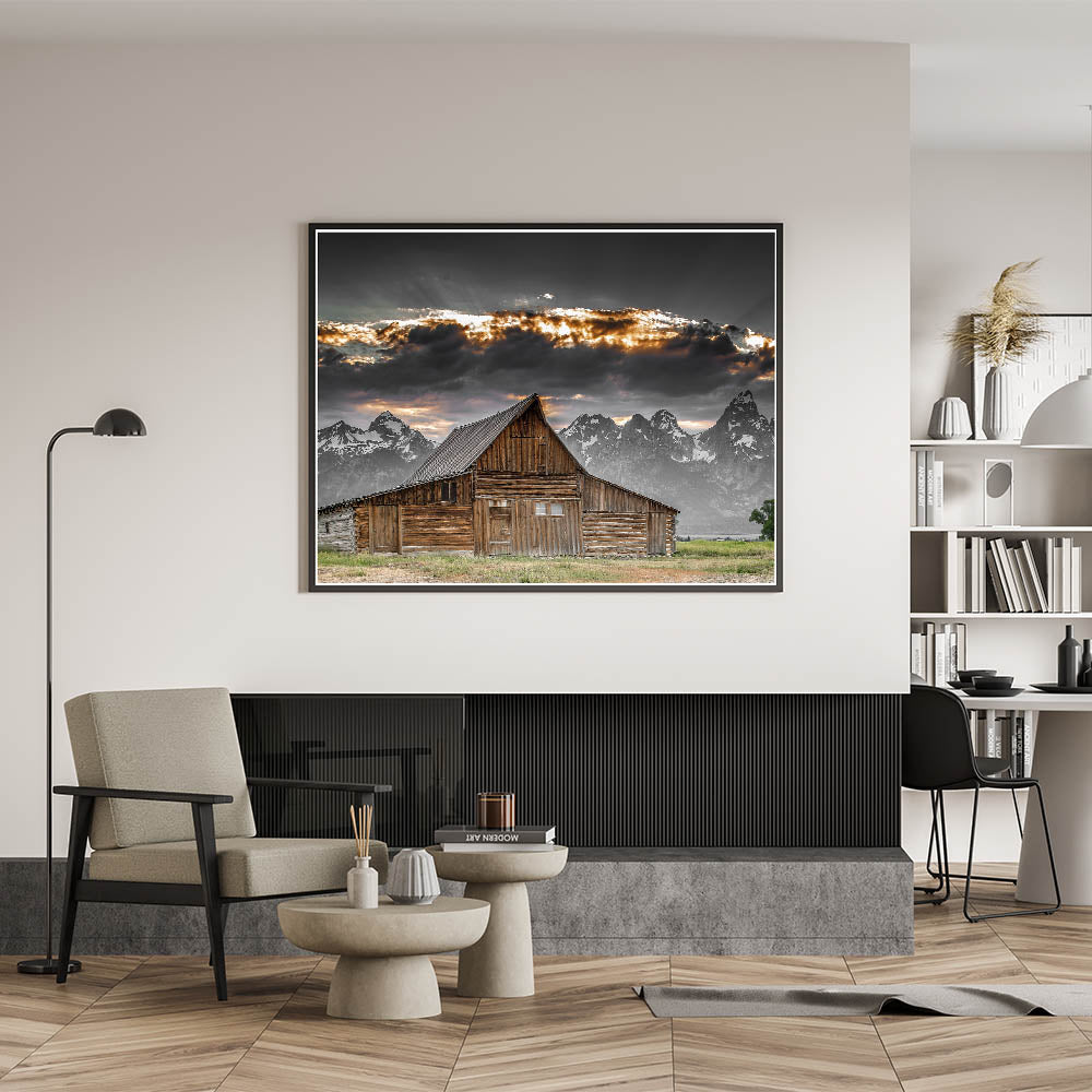 Rustic Wall Art - Barn and Mountain Landscape with Dramatic Sky