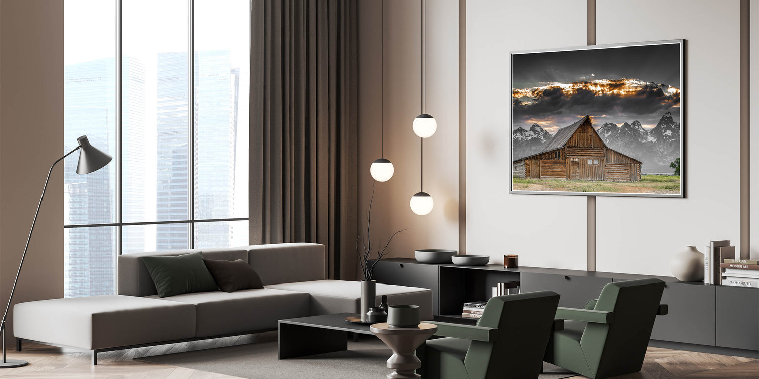 - High-quality rustic wall art featuring a barn and mountain landscape
