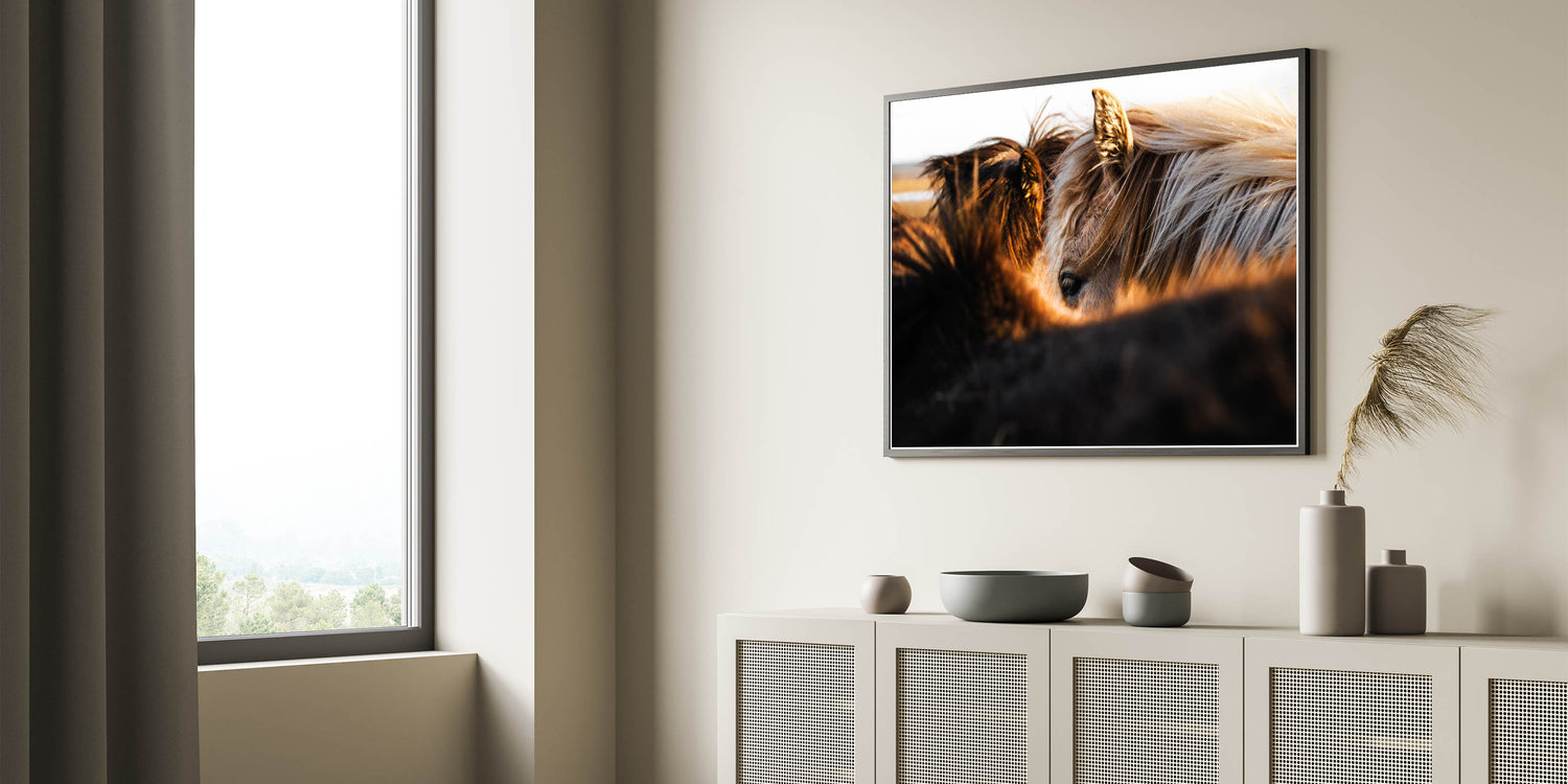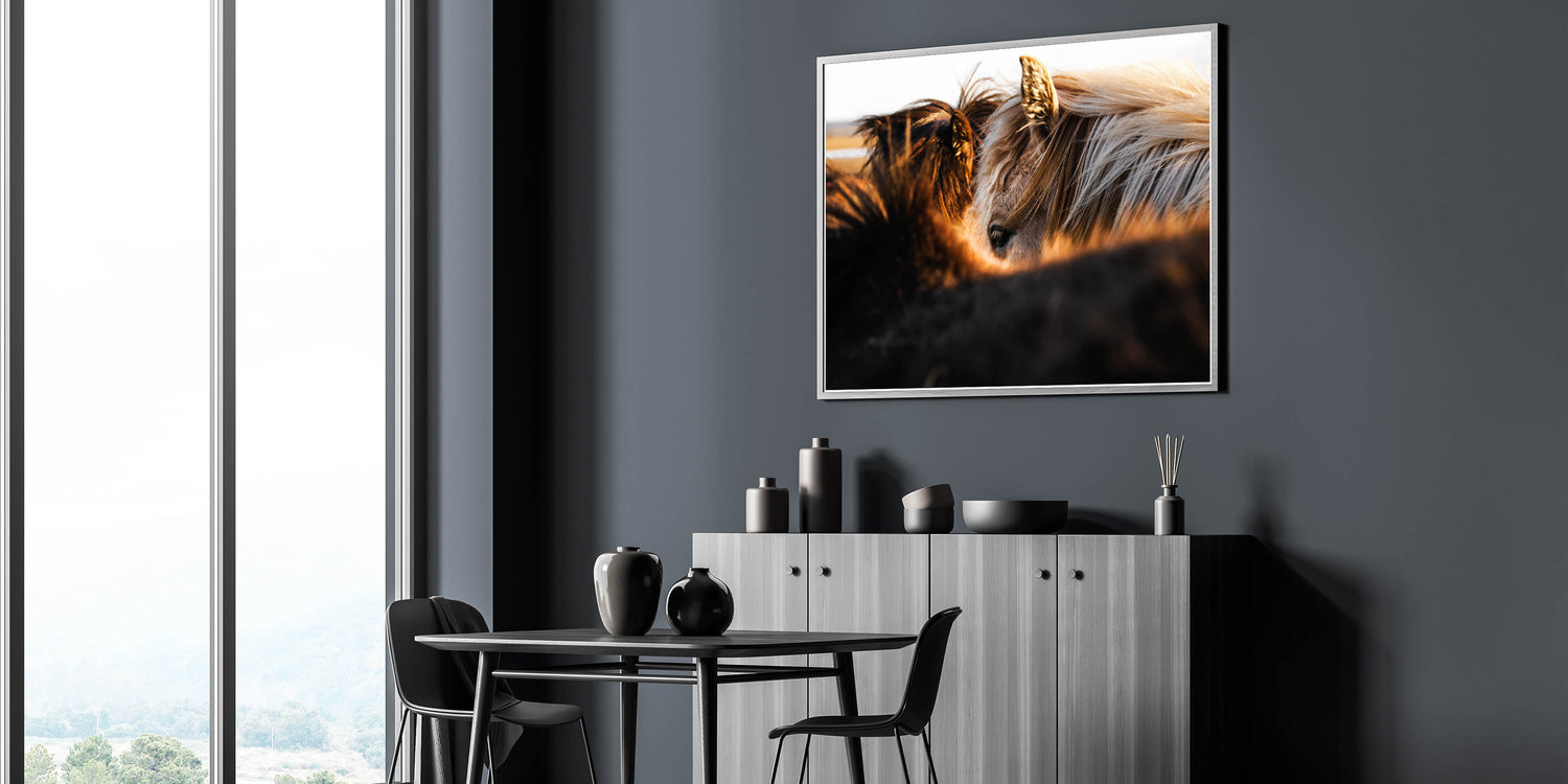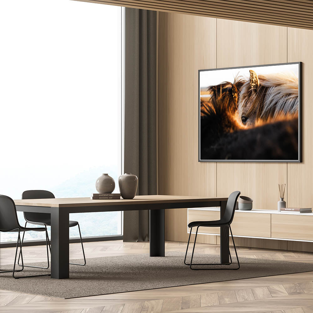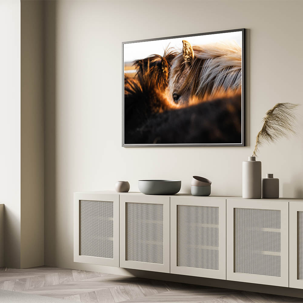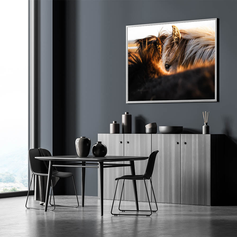 - High-quality rustic wall art featuring a close-up of horses with natural lighting