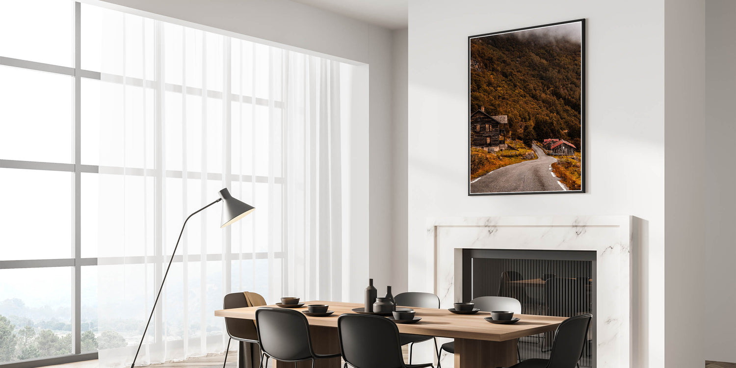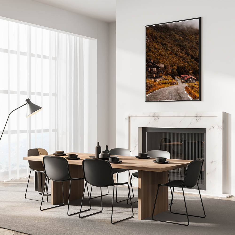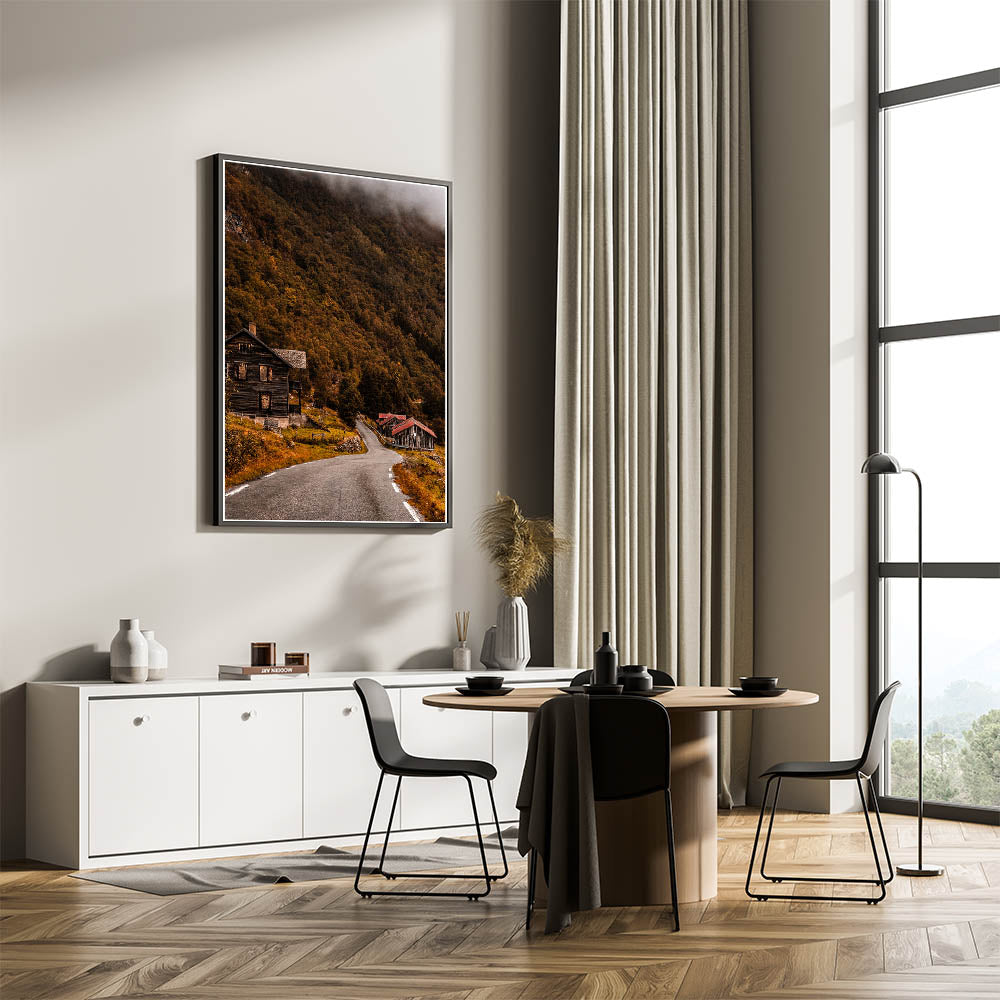 - Captures the essence of rustic home decor ideas with a serene country road and cabin nestled in nature.