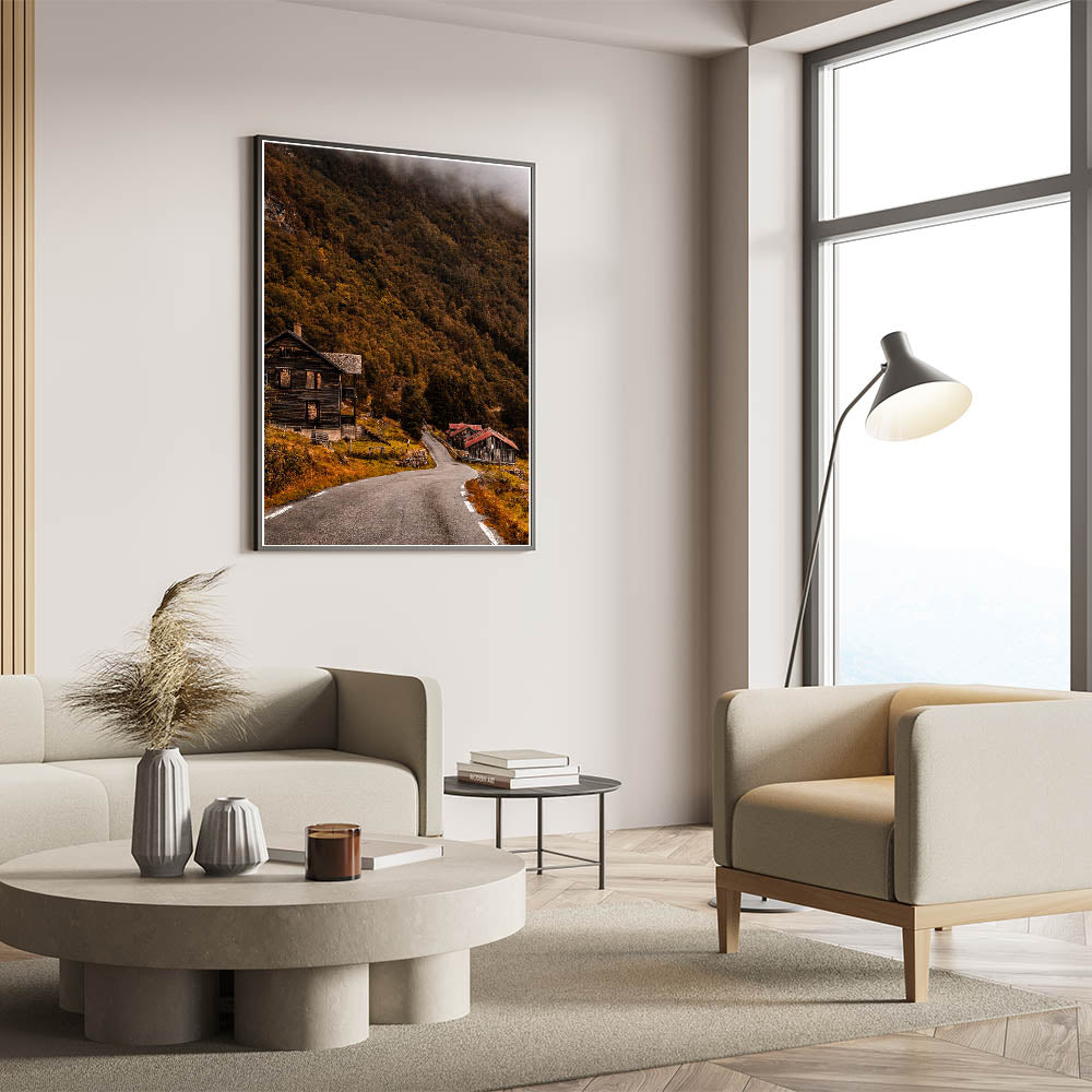 Capture the peaceful charm of the countryside with this stunning rustic wall art featuring a winding road that leads to a weathered wooden cabin nestled in a forested hillside. The earthy tones of the landscape, combined with the nostalgic feel of the cabin, make this artwork perfect for any farmhouse-style interior. The winding path invites a sense of adventure, while the autumnal colors evoke warmth and a connection to nature, making this piece ideal for creating a cozy and welcoming atmosphere in any room.