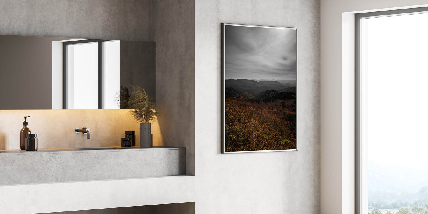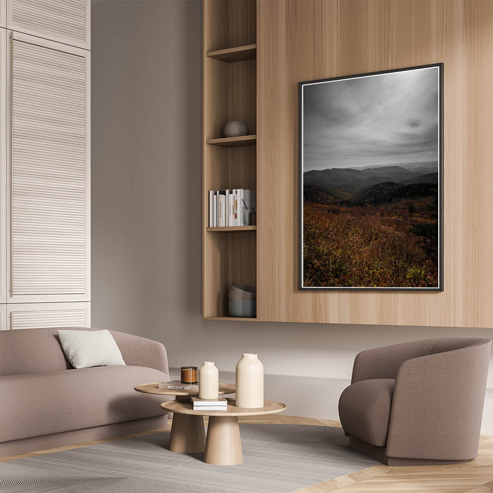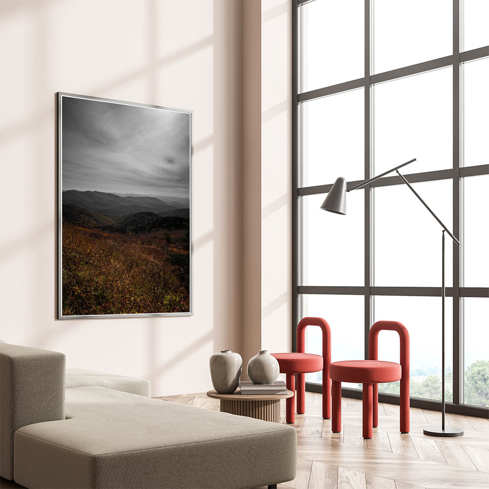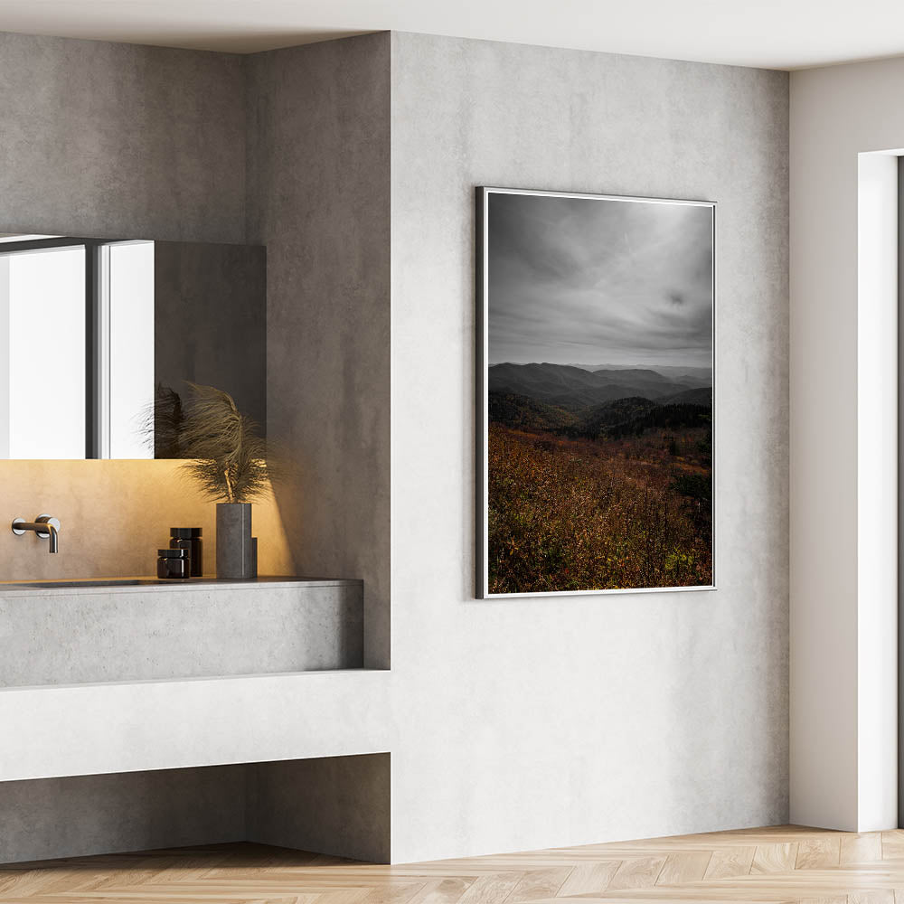 Transform your living space with this breathtaking Rustic Wall Art, featuring an expansive view of a mountain range under a moody, overcast sky. The muted colors of the landscape, combined with the rugged beauty of the hills and valleys, create a powerful sense of solitude and grandeur. Perfect for those who appreciate rustic nature scenes or want to bring the calm beauty of the outdoors into their home, this piece adds a touch of natural elegance to any space.