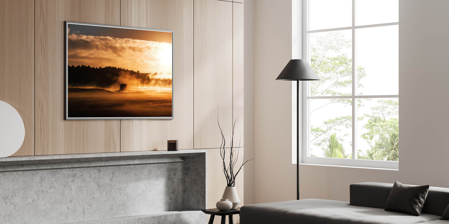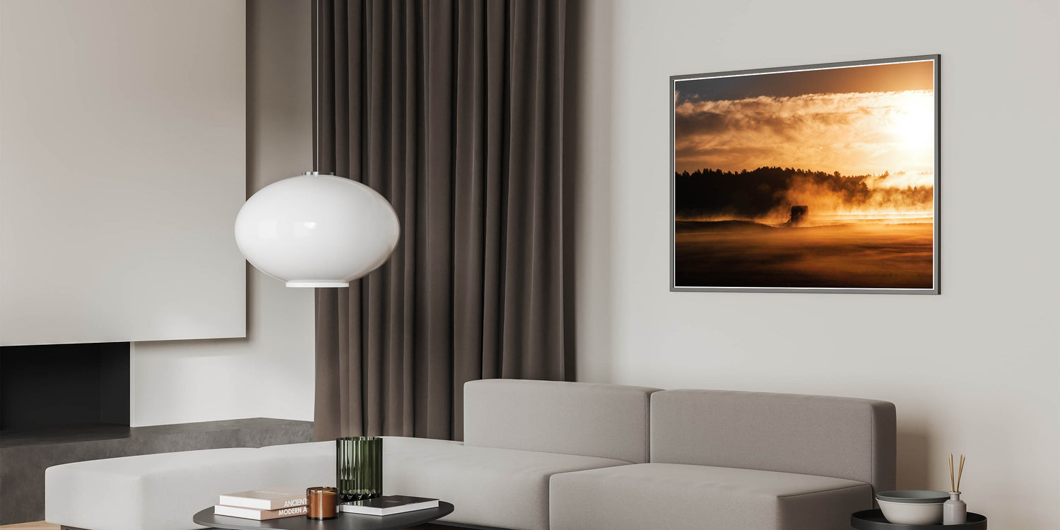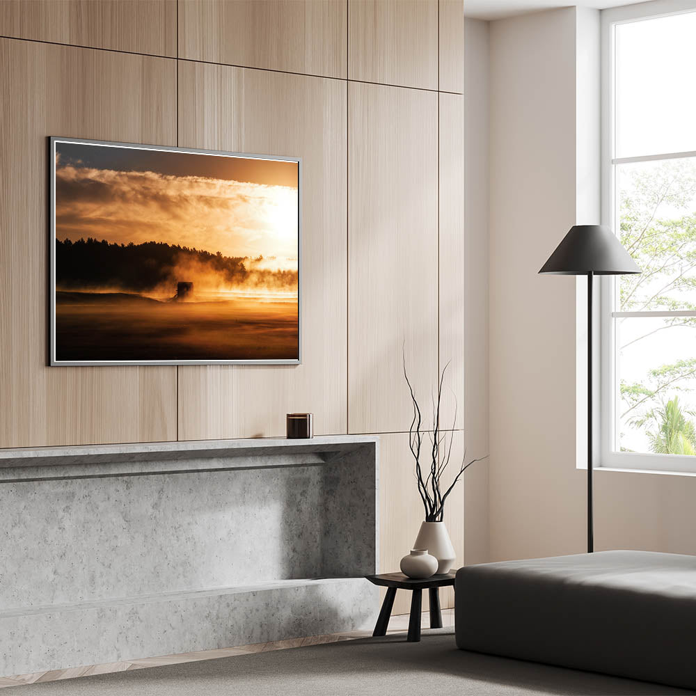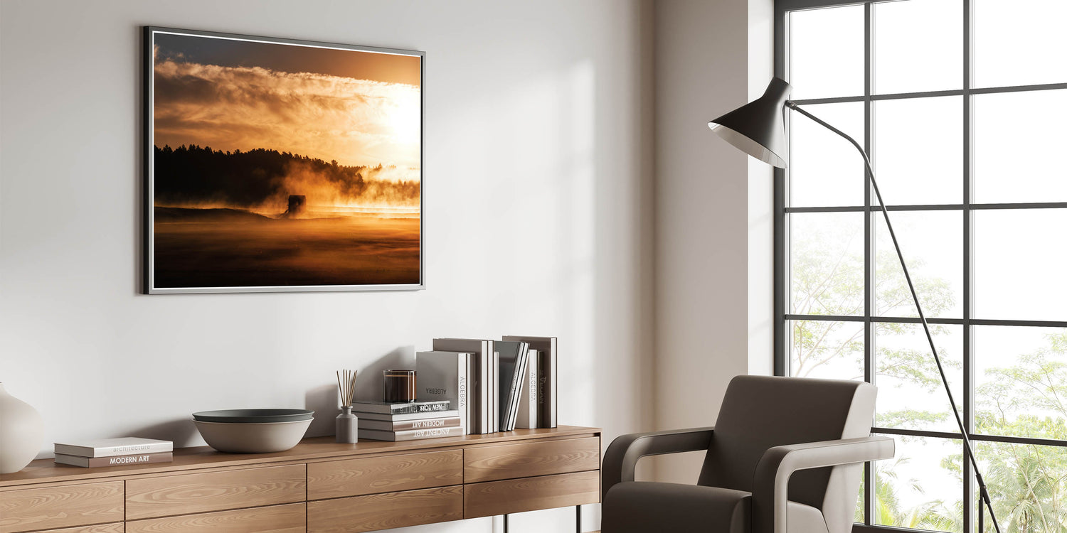 - High-quality rustic wall art featuring a golden sunset and misty landscape