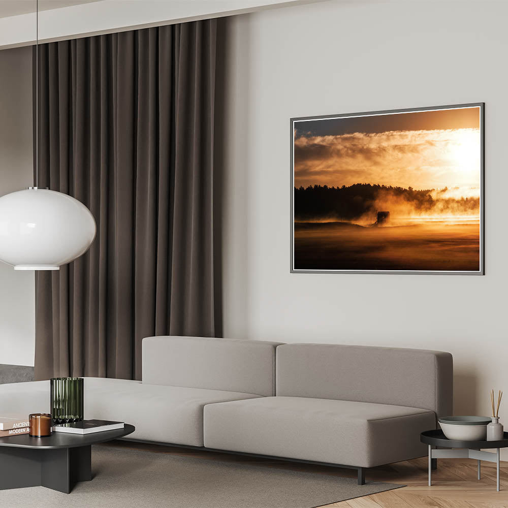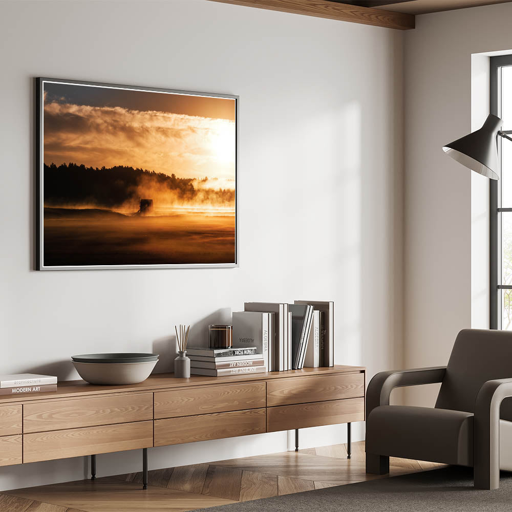 Elevate your rustic decor with this breathtaking wall art featuring a golden sunset over a misty rural landscape. The warm, glowing hues of the setting sun cast a soft light over the scene, creating a dreamlike atmosphere that beautifully captures the magic of the countryside at dusk. The distant silhouette of a rural structure adds to the mystique, making this artwork perfect for adding depth and warmth to your living space.