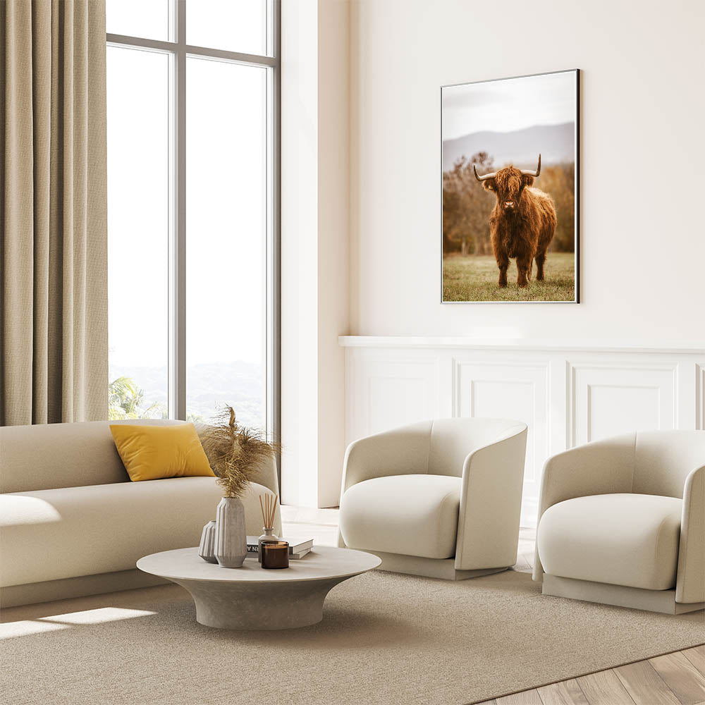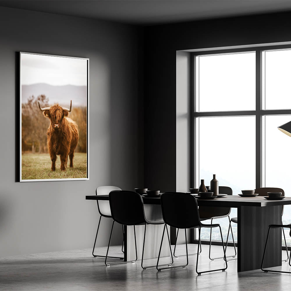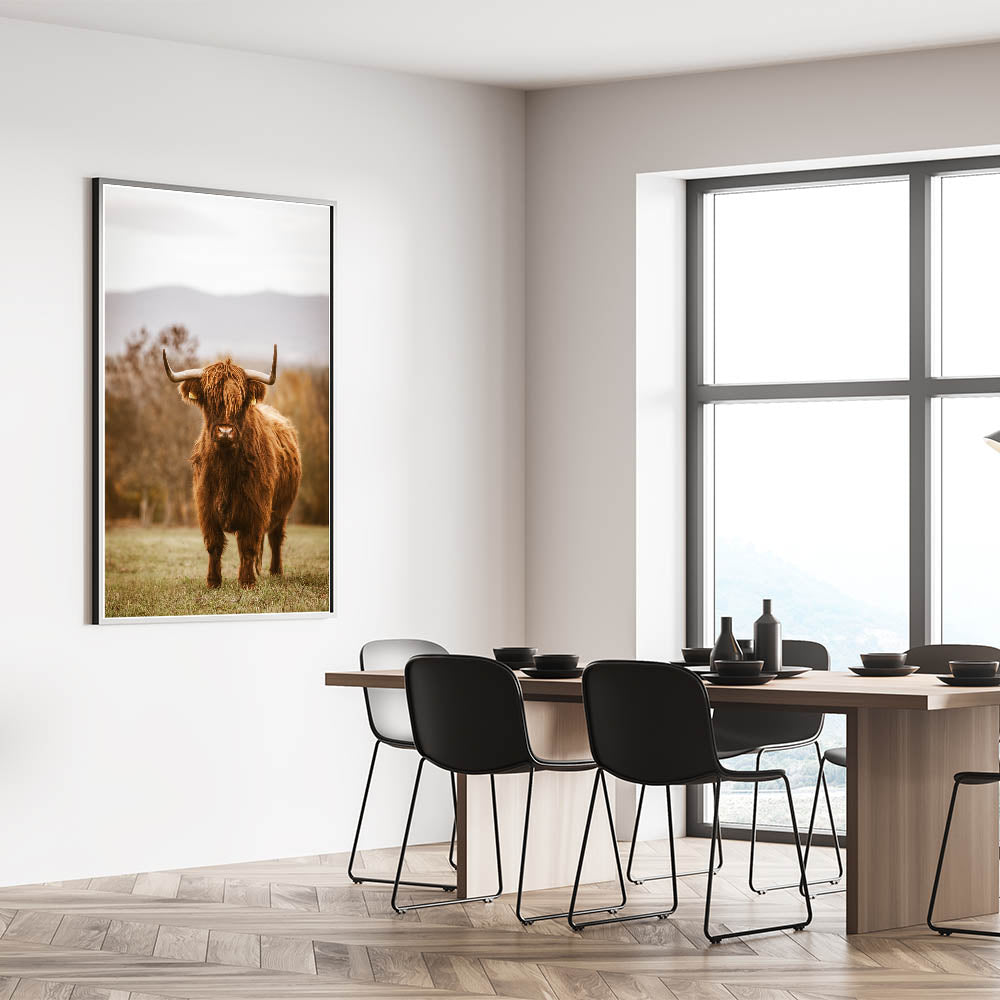 Bring the rugged charm of the countryside into your home with this stunning piece of rustic wall art, featuring a Highland cow standing proudly in an open pasture. The rich brown tones of the cow’s fur contrast beautifully with the soft, muted landscape in the background, making this artwork a perfect fit for farmhouse-style decor. This timeless scene evokes the tranquility of nature, offering a peaceful and grounding presence in any room. Ideal for those who appreciate rustic nature scenes, this artwork adds warmth and character to your home.
