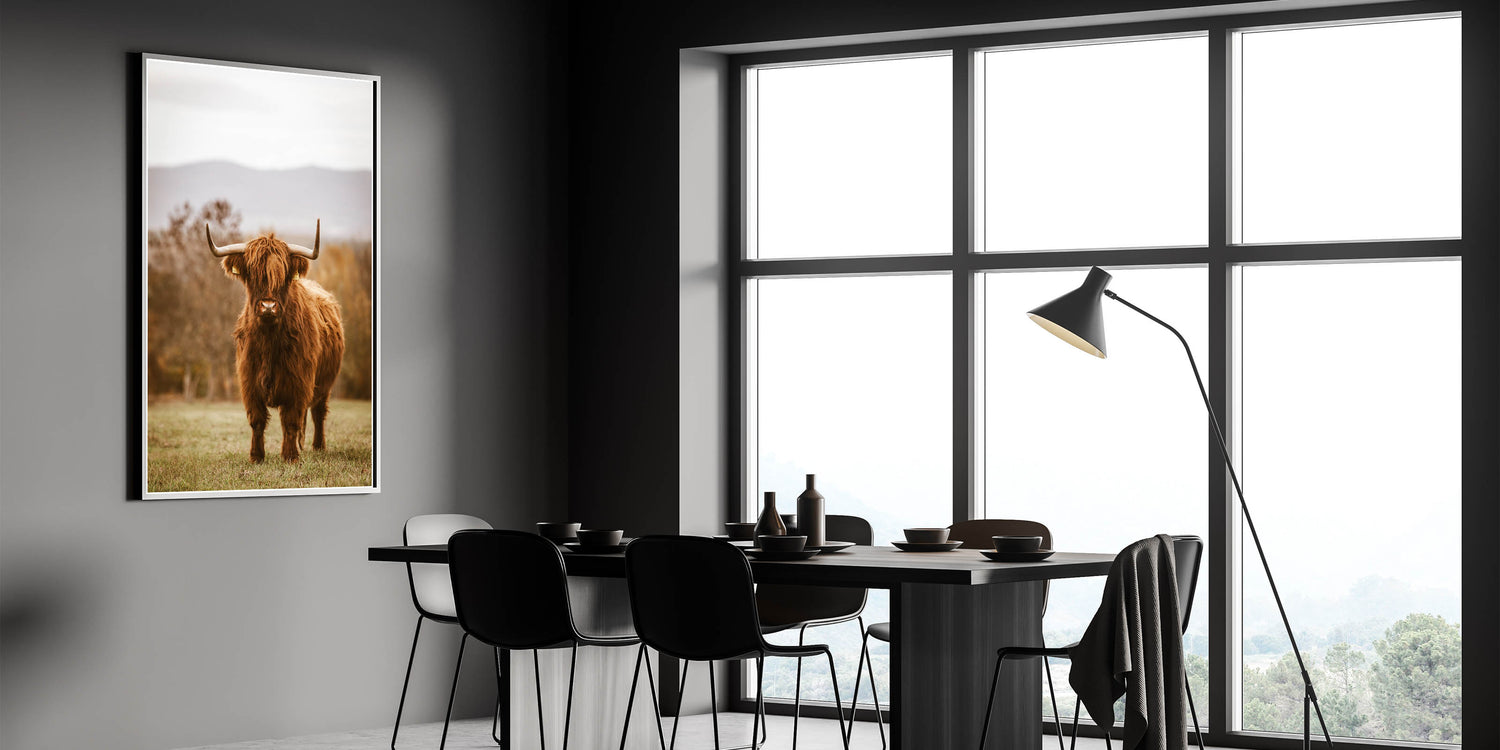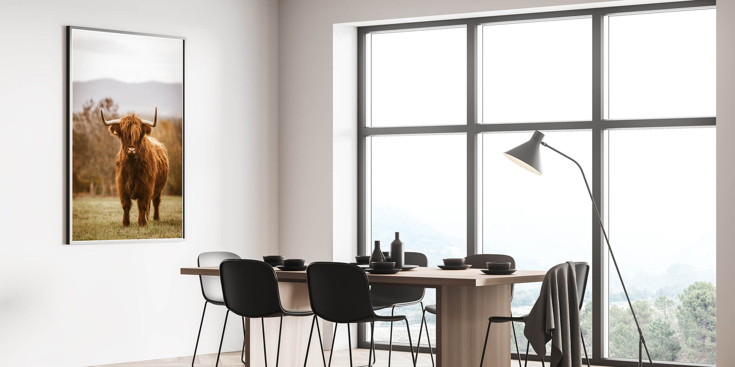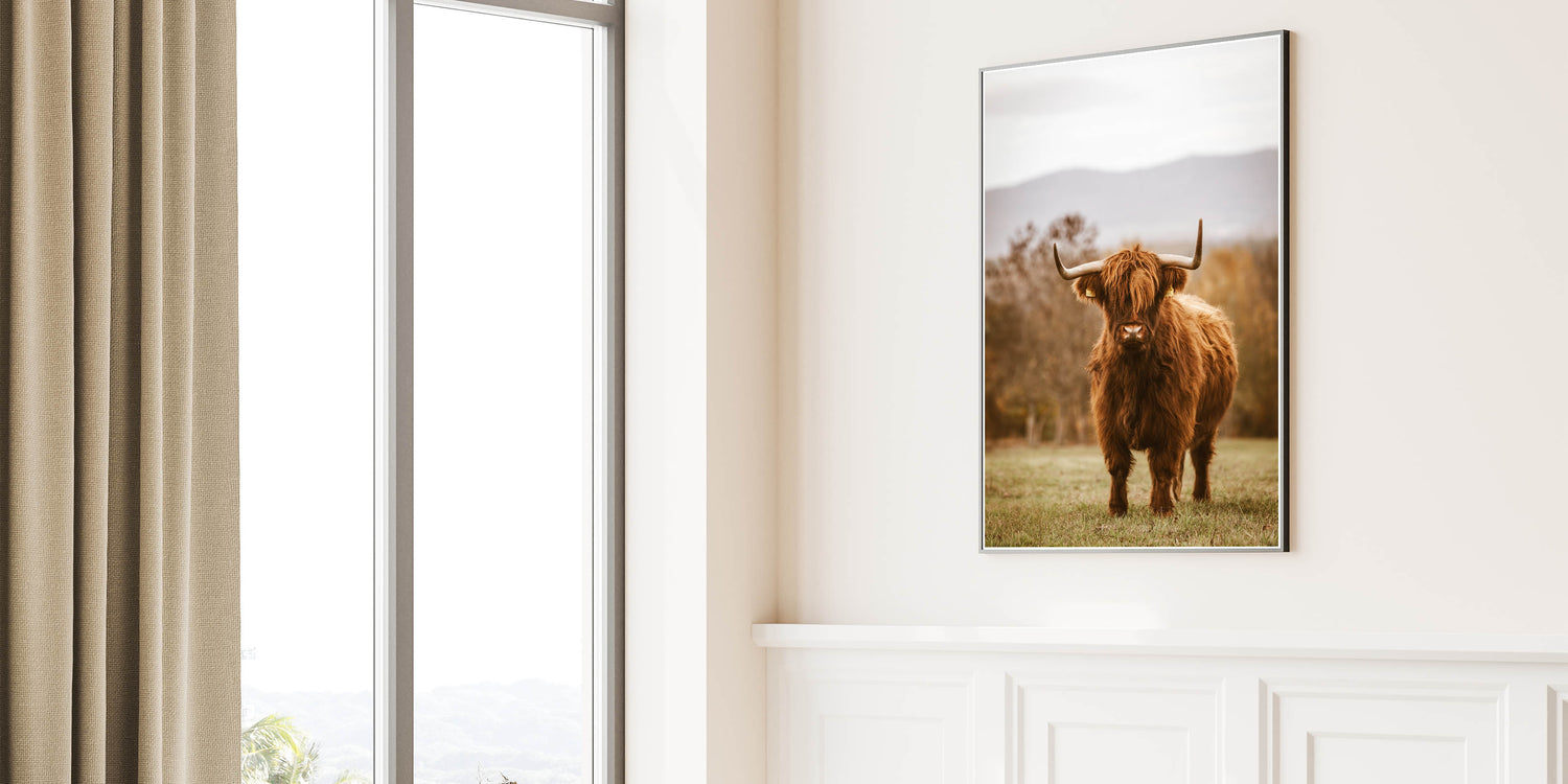 Bring the rugged charm of the countryside into your home with this stunning piece of rustic wall art, featuring a Highland cow standing proudly in an open pasture. The rich brown tones of the cow’s fur contrast beautifully with the soft, muted landscape in the background, making this artwork a perfect fit for farmhouse-style decor. This timeless scene evokes the tranquility of nature, offering a peaceful and grounding presence in any room. Ideal for those who appreciate rustic nature scenes, this artwork adds warmth and character to your home.