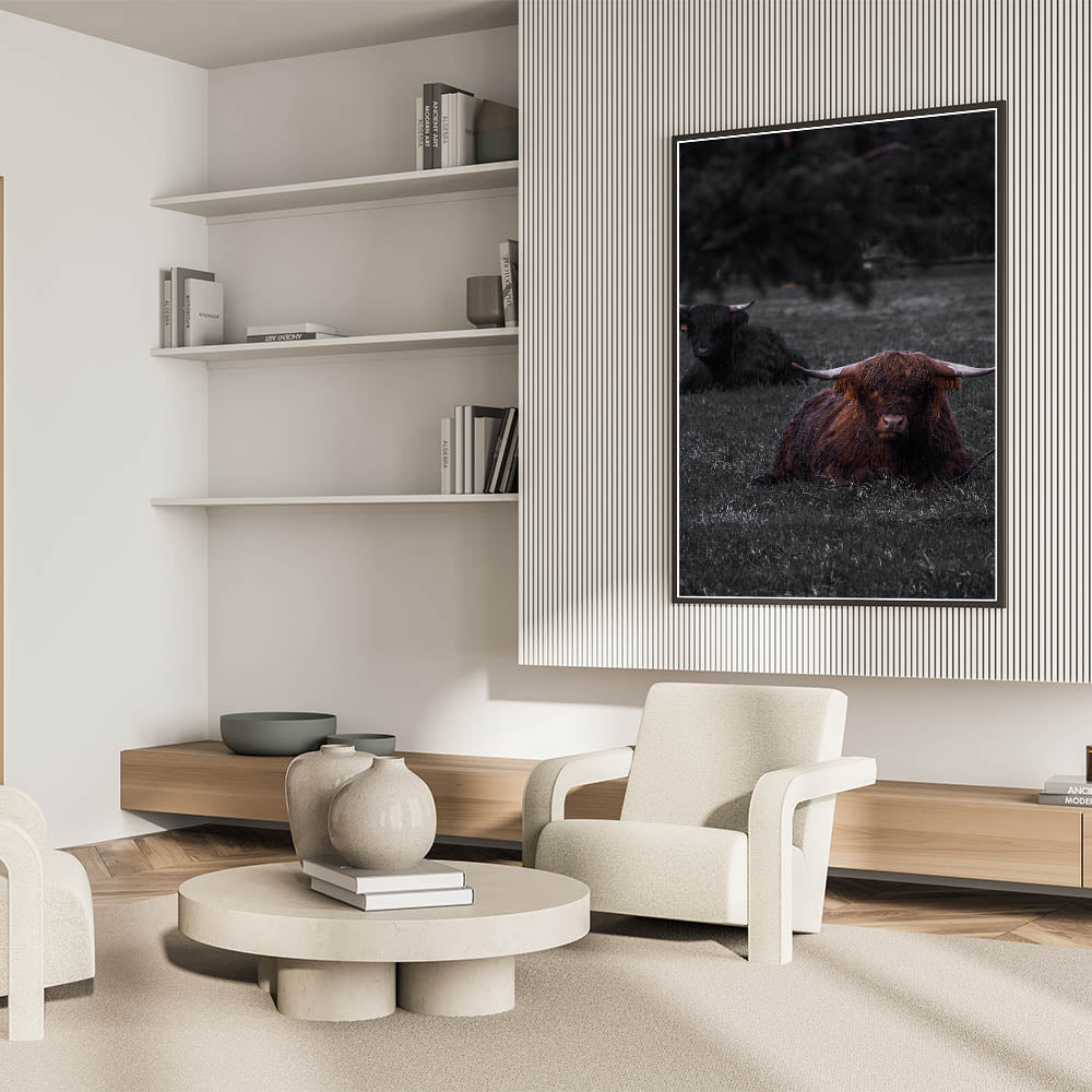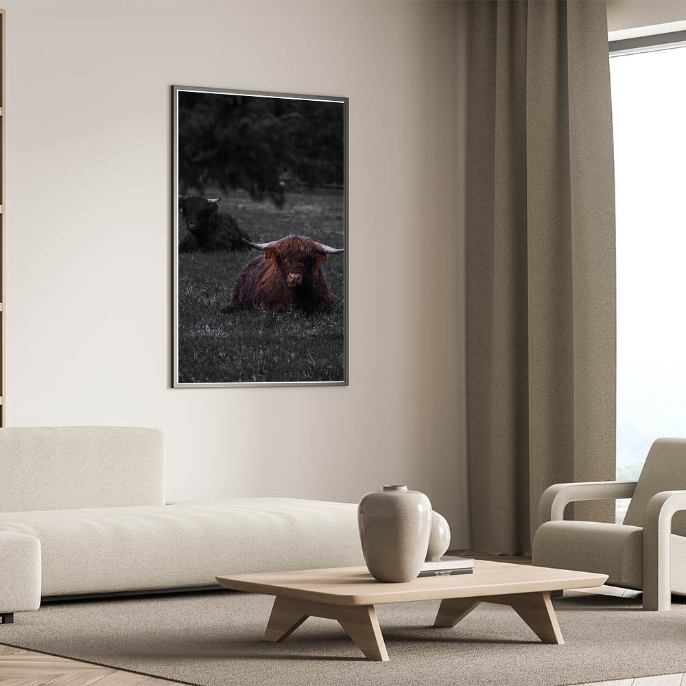Bring the beauty of the countryside into your home with this captivating Rustic Wall Art, featuring two Highland cows resting peacefully in a grassy field. The rich, earthy tones of the cow's coat contrast beautifully with the darkened, moody backdrop, creating a sense of calm and serenity. This piece is perfect for adding a touch of rustic charm to any living room, bedroom, or office, making it an ideal addition to your farmhouse decor or vintage-inspired wall art collection.