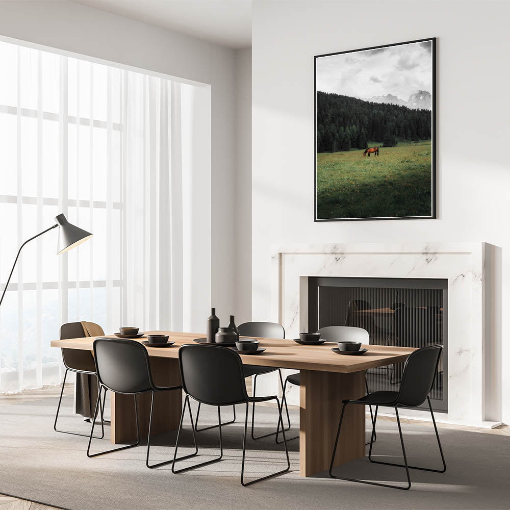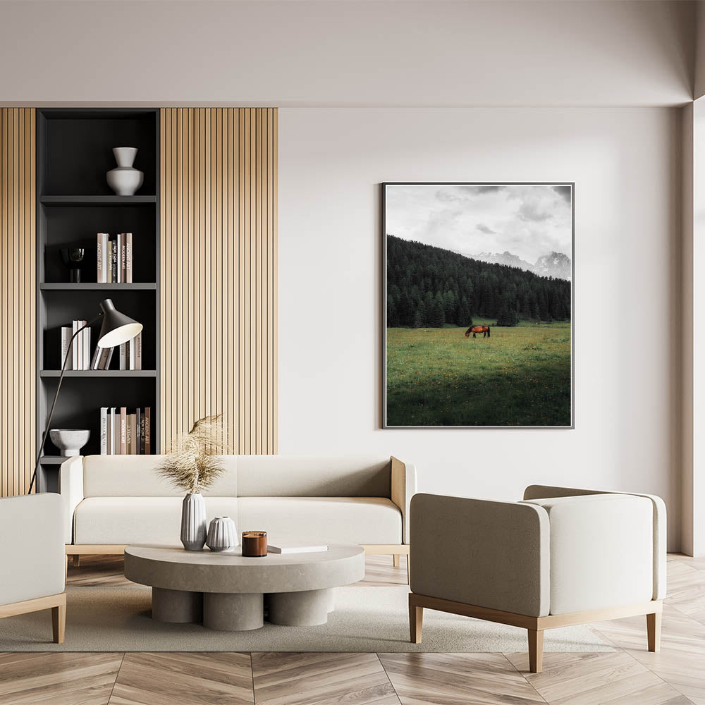 Bring the peaceful beauty of nature into your home with this Rustic Wall Art, featuring a lone horse grazing in a lush, green mountain valley. The serene landscape, framed by towering pine trees and misty mountains, creates a calming atmosphere that’s perfect for any farmhouse decor or vintage-inspired wall art collection. The rich earthy tones and expansive backdrop evoke a sense of tranquility, making this piece ideal for living rooms, bedrooms, or offices.