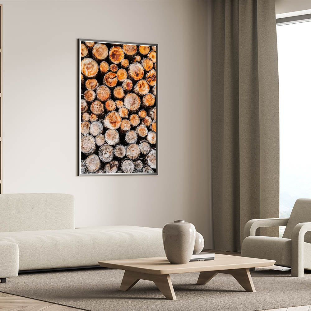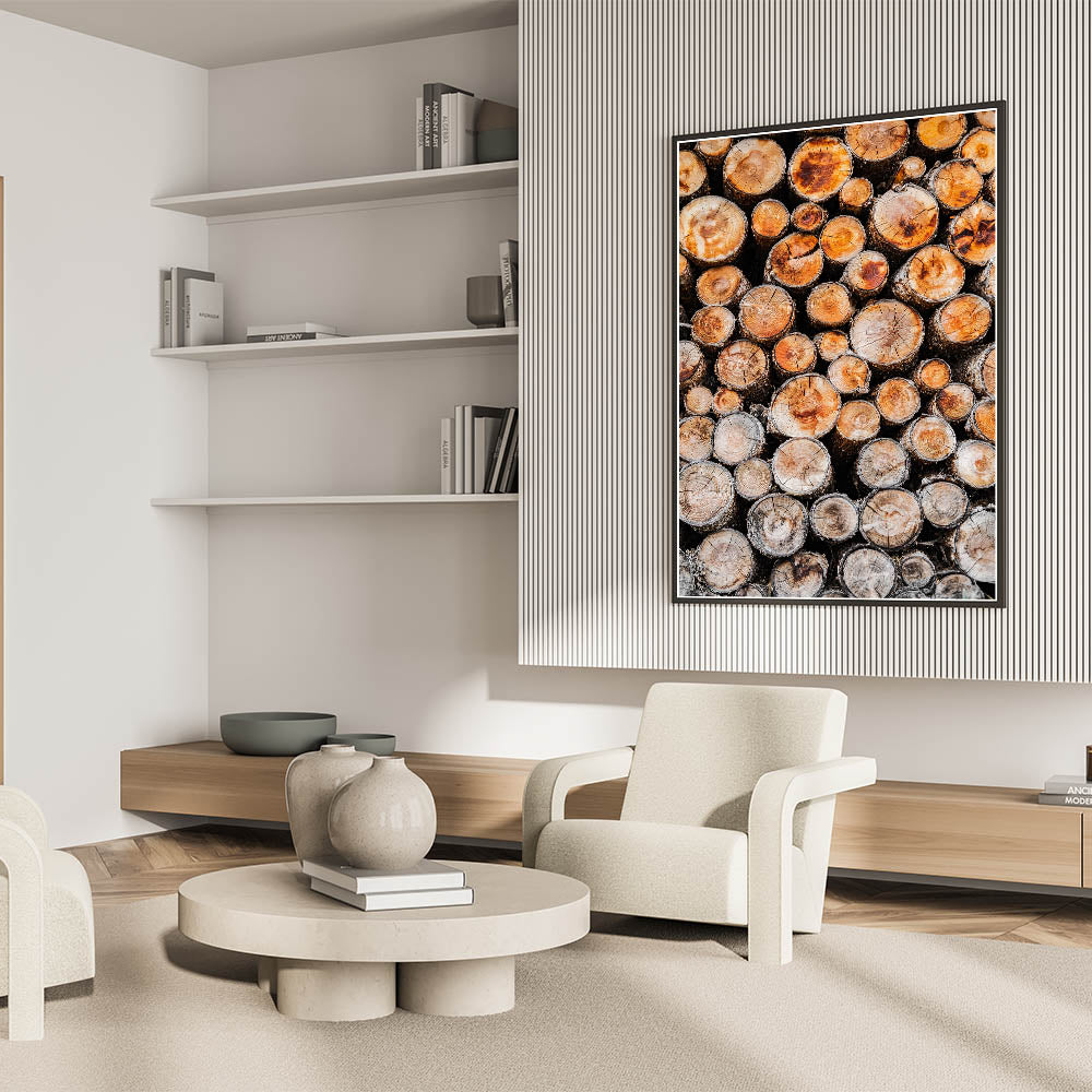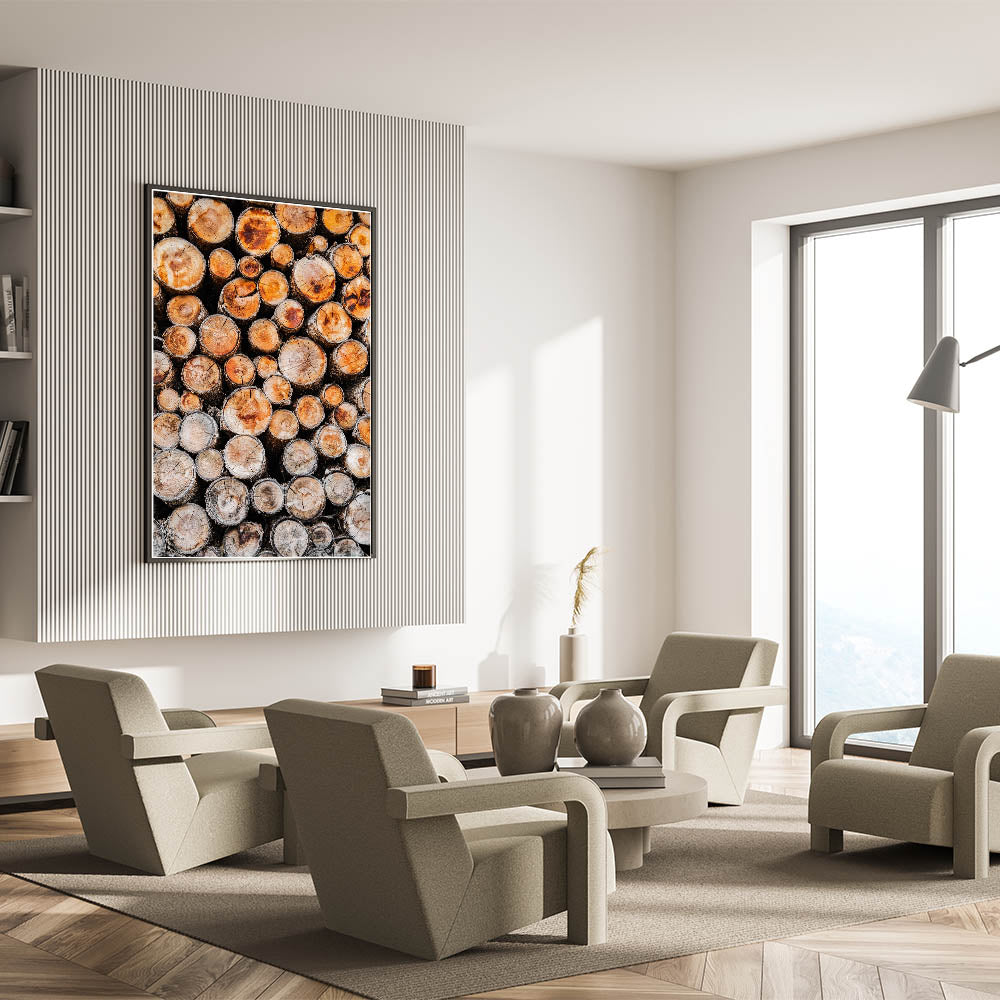 - High-quality print that emphasizes the rich textures and vibrant tones of the firewood.