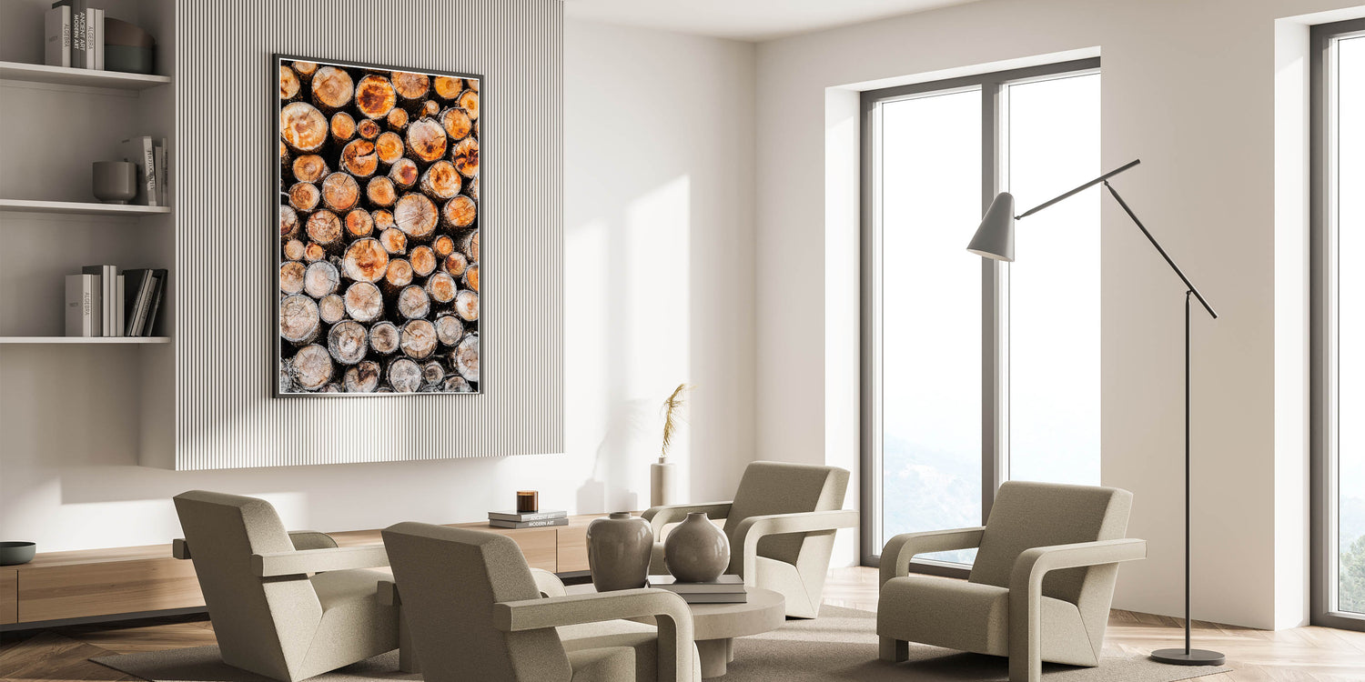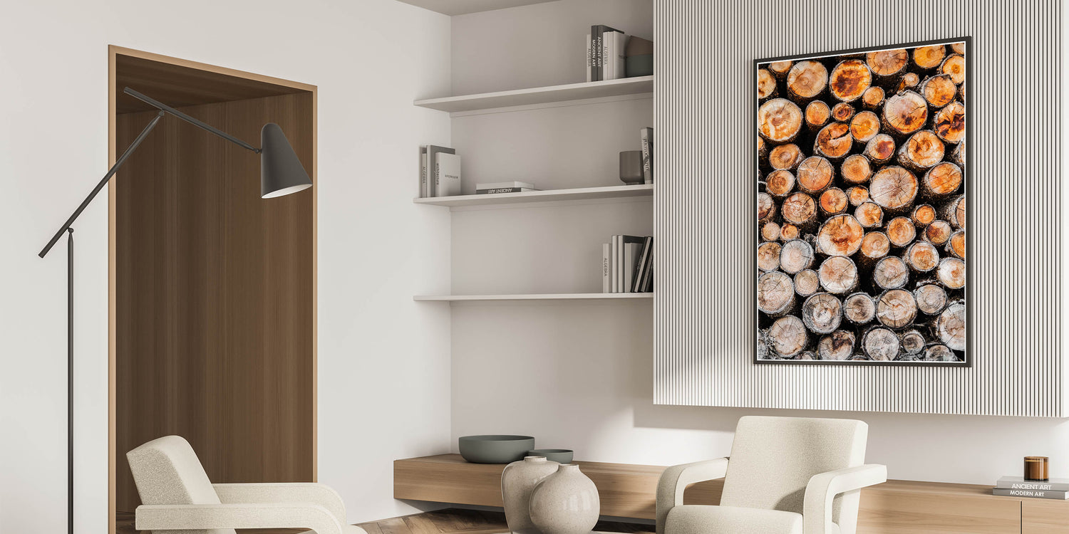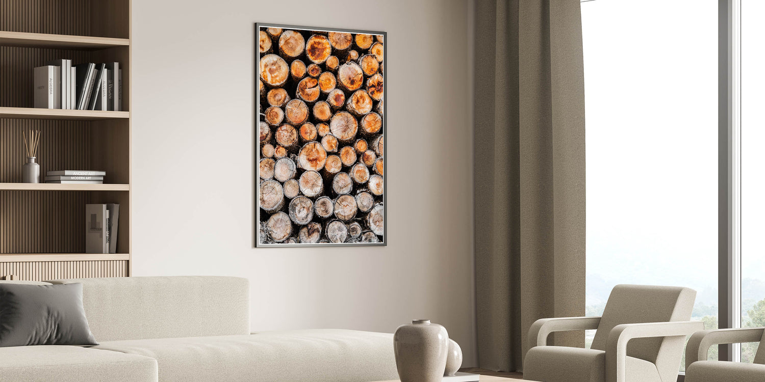 - High-quality print that emphasizes the rich textures and vibrant tones of the firewood.
