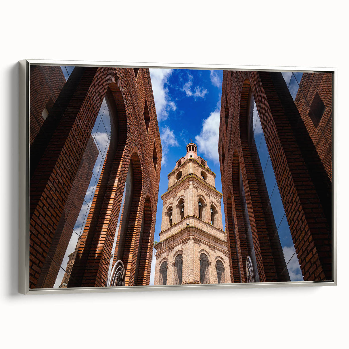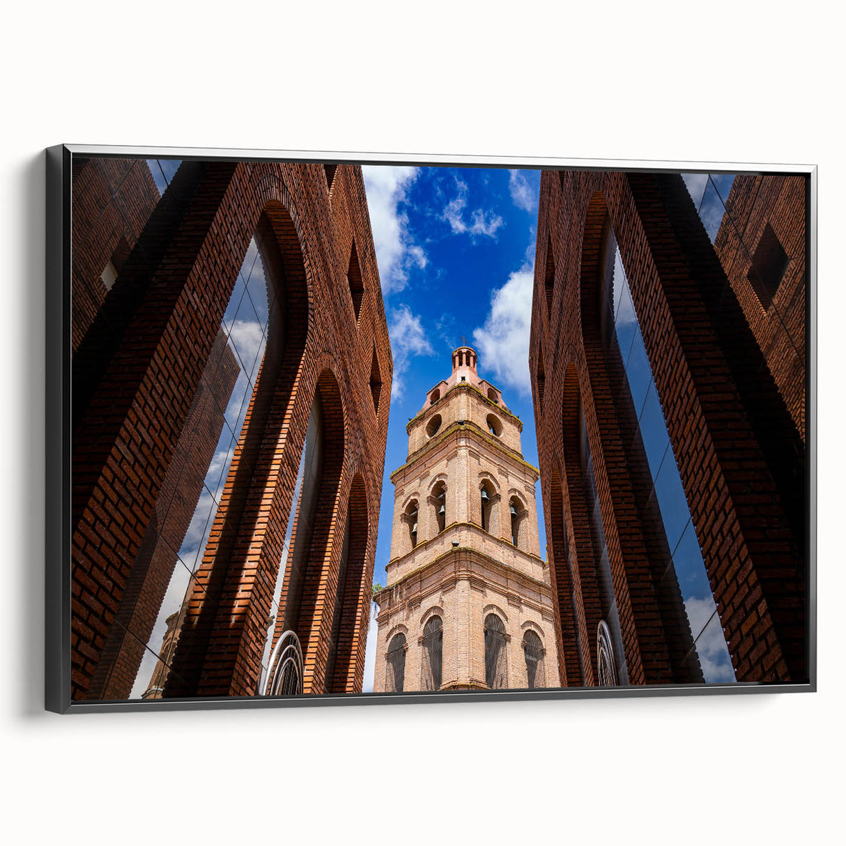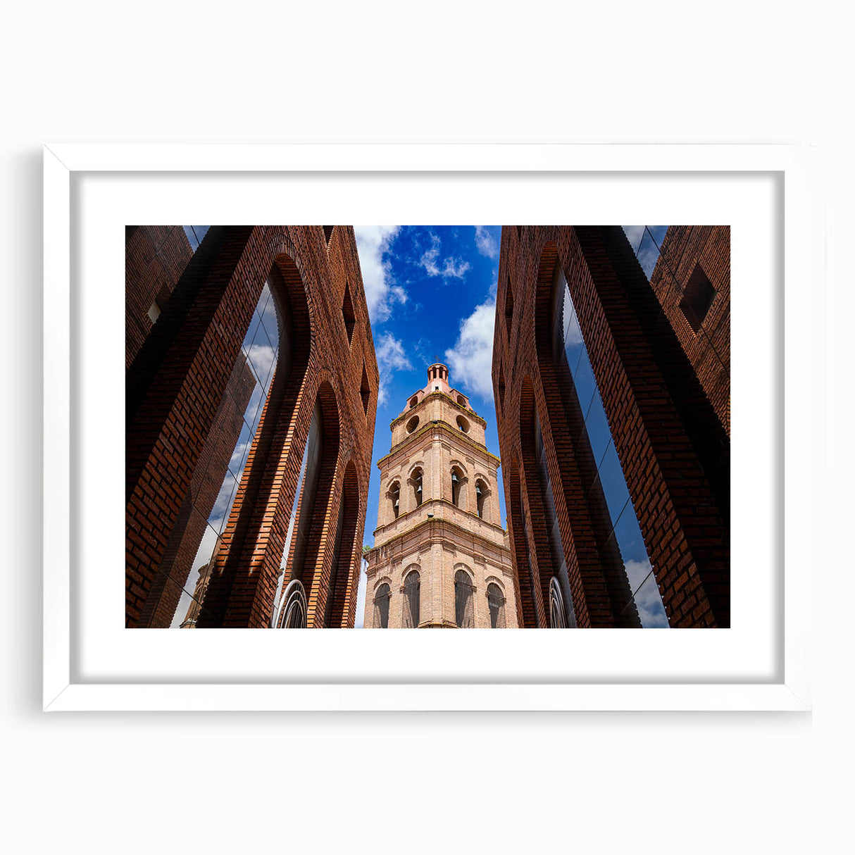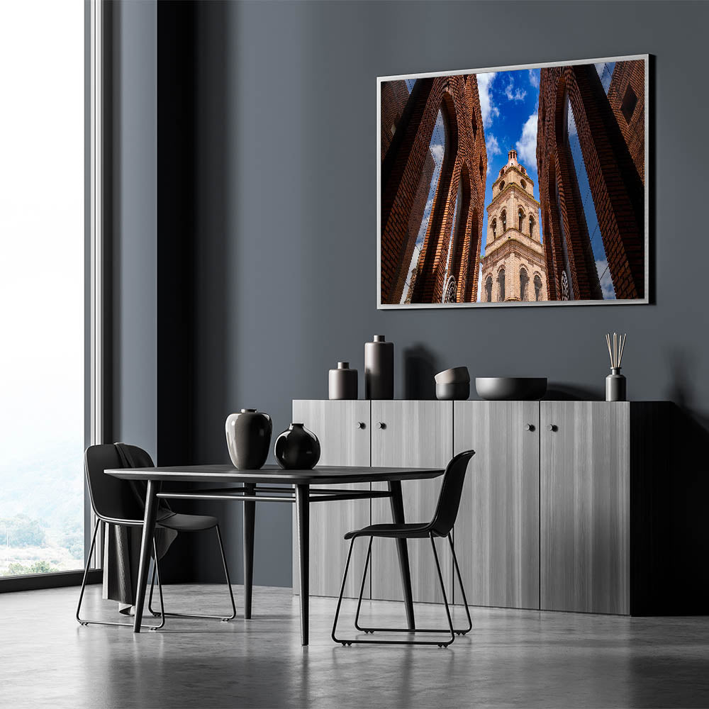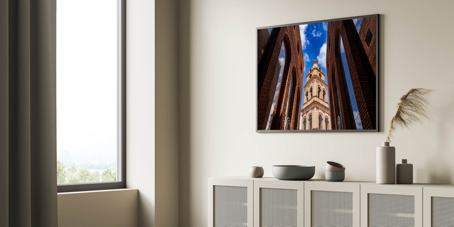 Capture the striking beauty of Santa Cruz’s historic architecture with this captivating wall art. Featuring a stunning upward view of a majestic brick tower framed by symmetrical arches, this piece brings an air of sophistication and charm to any room. The vibrant blue sky in the background contrasts beautifully with the rich tones of the brick, making this artwork a perfect addition to modern or traditional decor. With multiple framing options, this piece is a versatile choice for any space, whether at home or in the office.