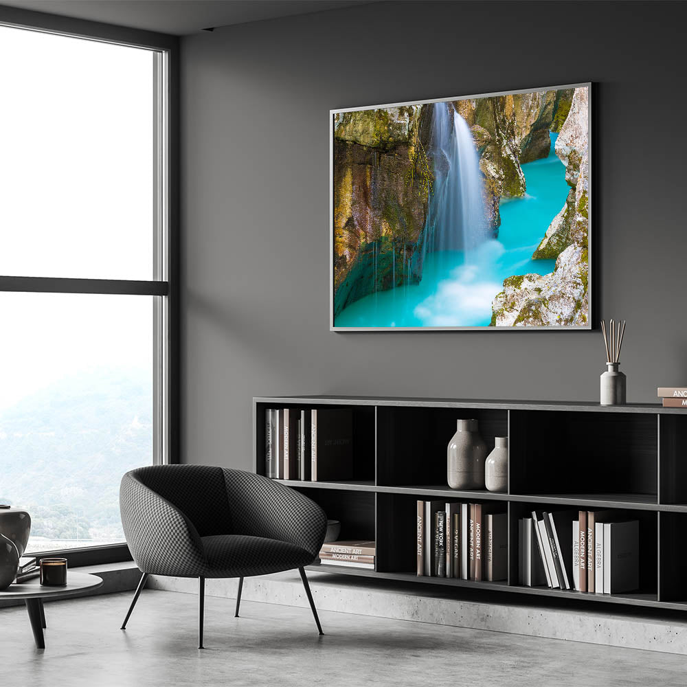 Immerse yourself in the tranquil beauty of Slovenia with this stunning waterfall wall art. Capturing the crystal-clear turquoise waters cascading over ancient rock formations, this piece brings the peaceful essence of Slovenian nature to any room. Perfect for adding a serene ambiance, this high-quality Slovenia wall art is designed to enhance any space with European elegance.