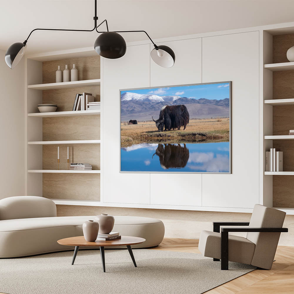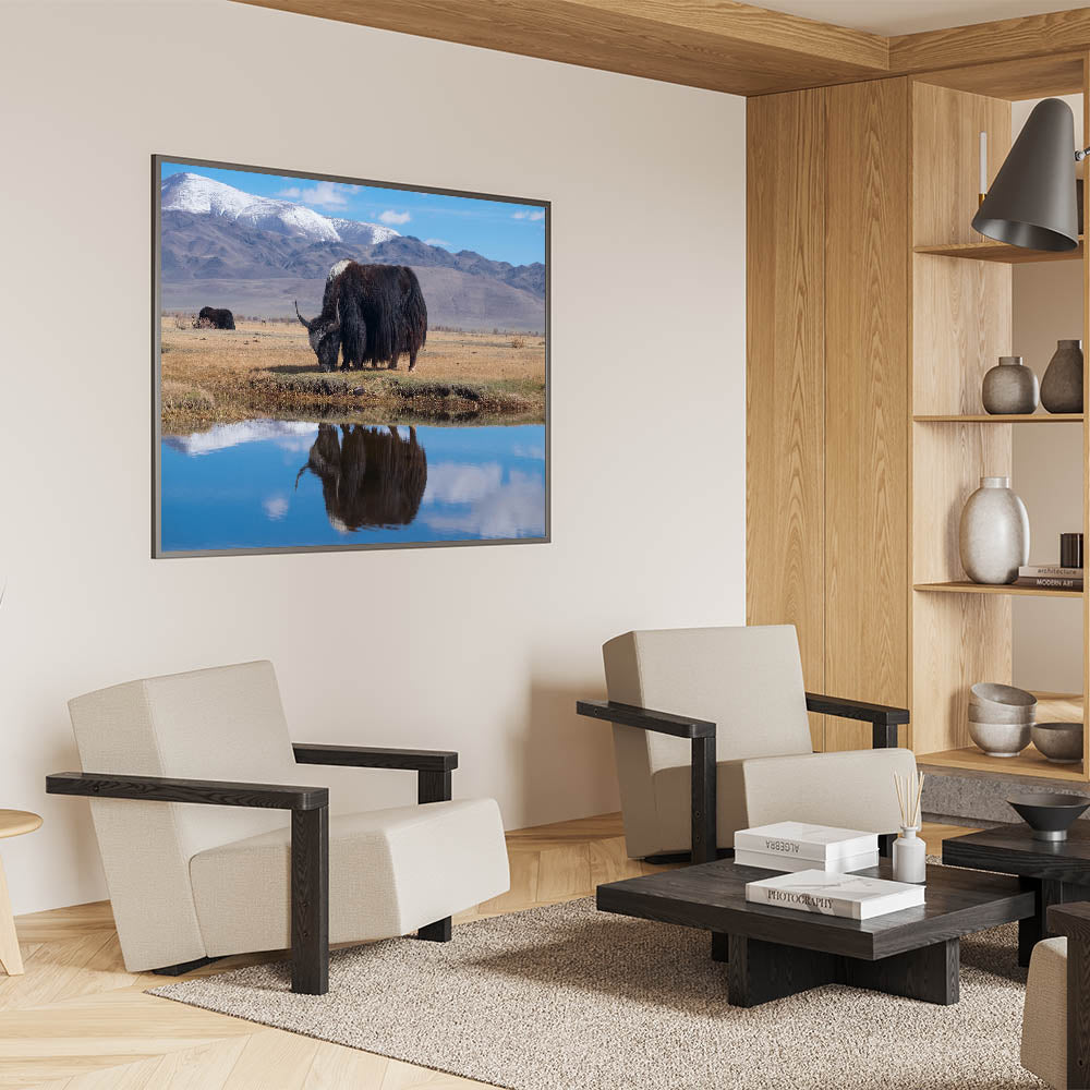 Scenic Tibet Prints - Grazing Yak by Mountain Reflection Canvas and Prints