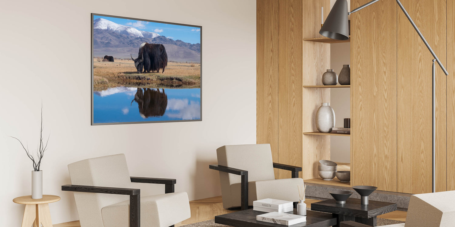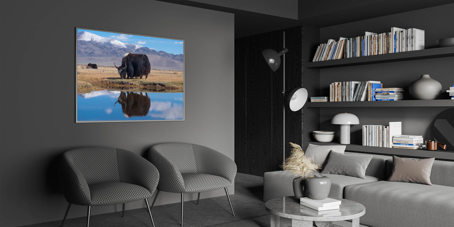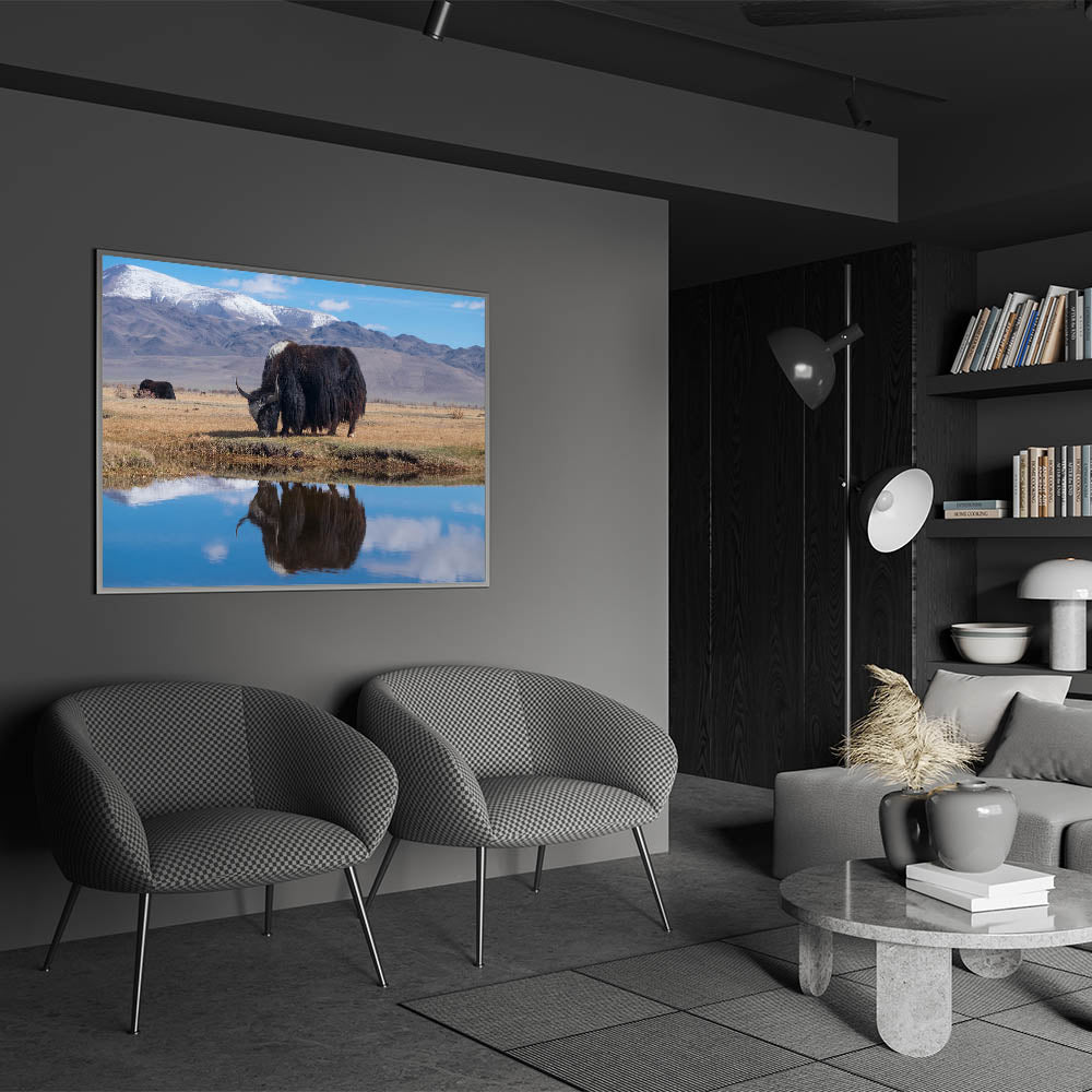 Embrace the peaceful beauty of Tibetan landscapes with this stunning wall art, showcasing a yak grazing by a calm water reflection with majestic mountains in the background. This artwork captures the serene and timeless essence of rural Tibet, making it a perfect piece for those who appreciate nature and tranquility. Ideal for home or office decor, this piece brings a touch of Tibetan heritage to your surroundings.