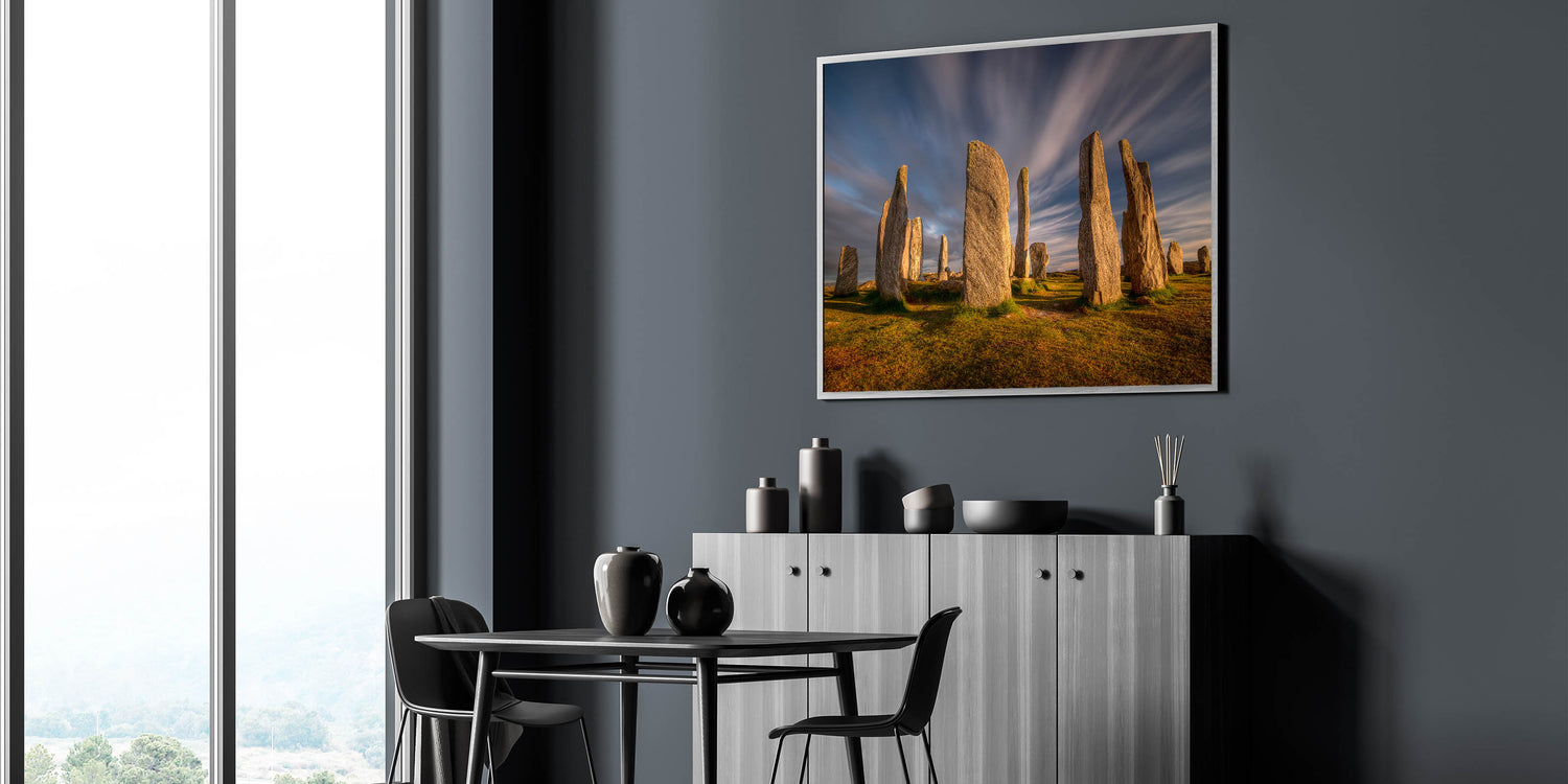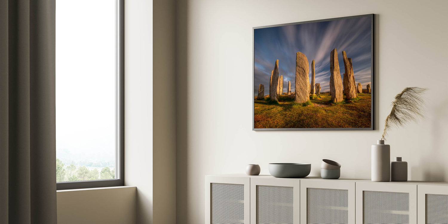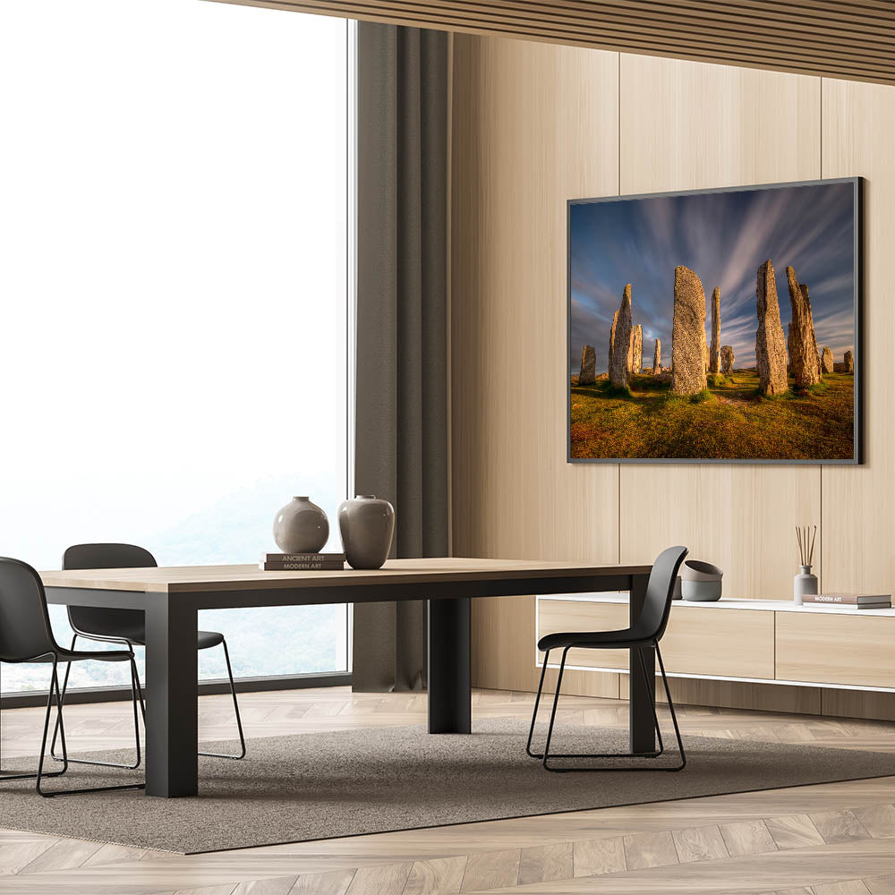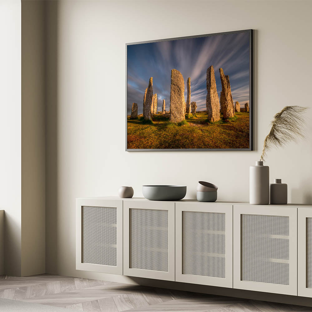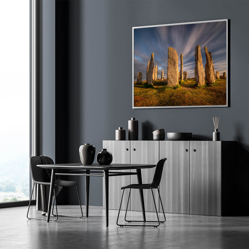 Celebrate the ancient mystique of Scotland with this Beautiful Scottish Landscapes artwork featuring the iconic Standing Stones of Callanish. This majestic piece captures the golden light of dusk as it bathes the weathered stones, creating a scene that feels both timeless and awe-inspiring. Perfect for lovers of history and nature, this Scottish Highlands Artwork adds a touch of intrigue and beauty to any space.