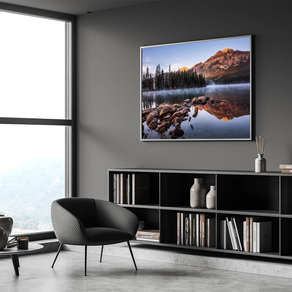 Experience the serene beauty of the Sierra Nevada mountains with this captivating wall art. Featuring a mist-covered lake that reflects the rugged peaks, this artwork brings the tranquility of nature into any space. The soft morning light combined with the detailed rock and forest elements creates a harmonious and peaceful scene, perfect for nature lovers and outdoor enthusiasts alike.