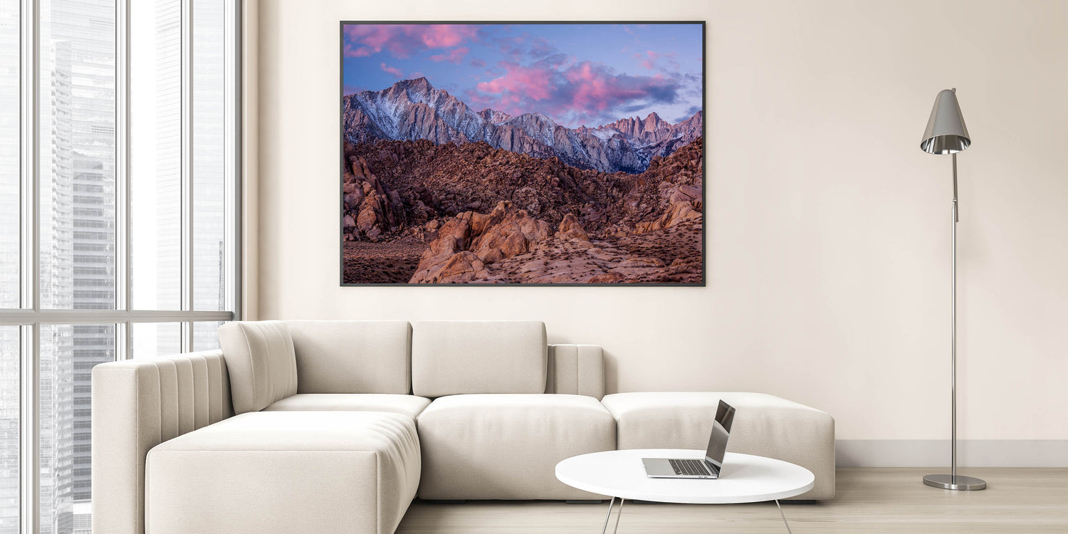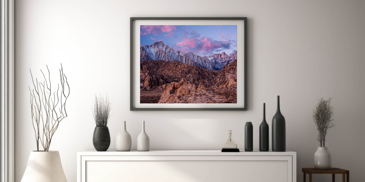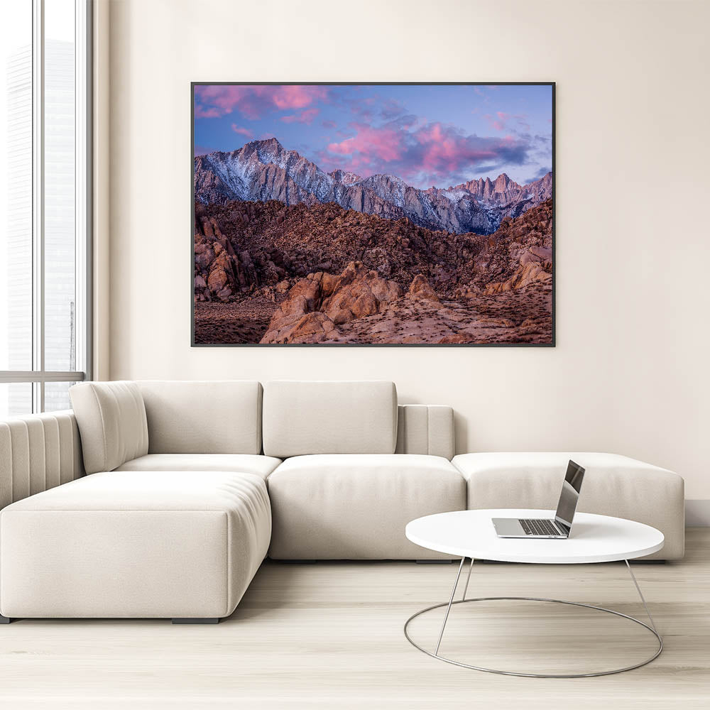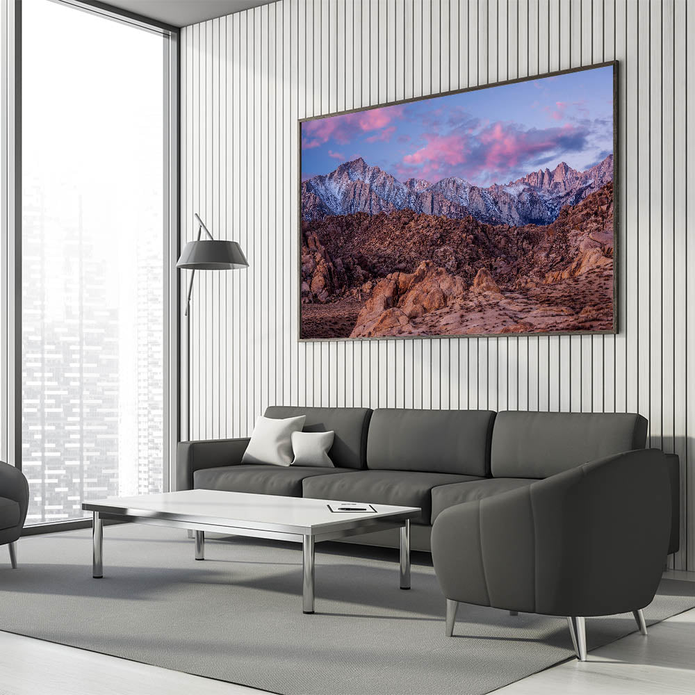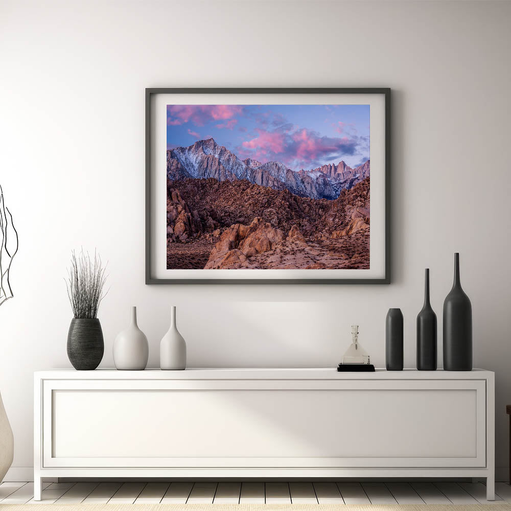 Immerse yourself in the rugged beauty of the Sierra Nevada with this stunning landscape print. Capturing the towering snow-capped peaks against a vibrant sunset sky, this artwork brings the breathtaking wilderness of California right into your home. With rich browns and soft pinks blending together, this piece is ideal for anyone who loves nature and wants to add a touch of the outdoors to their decor.