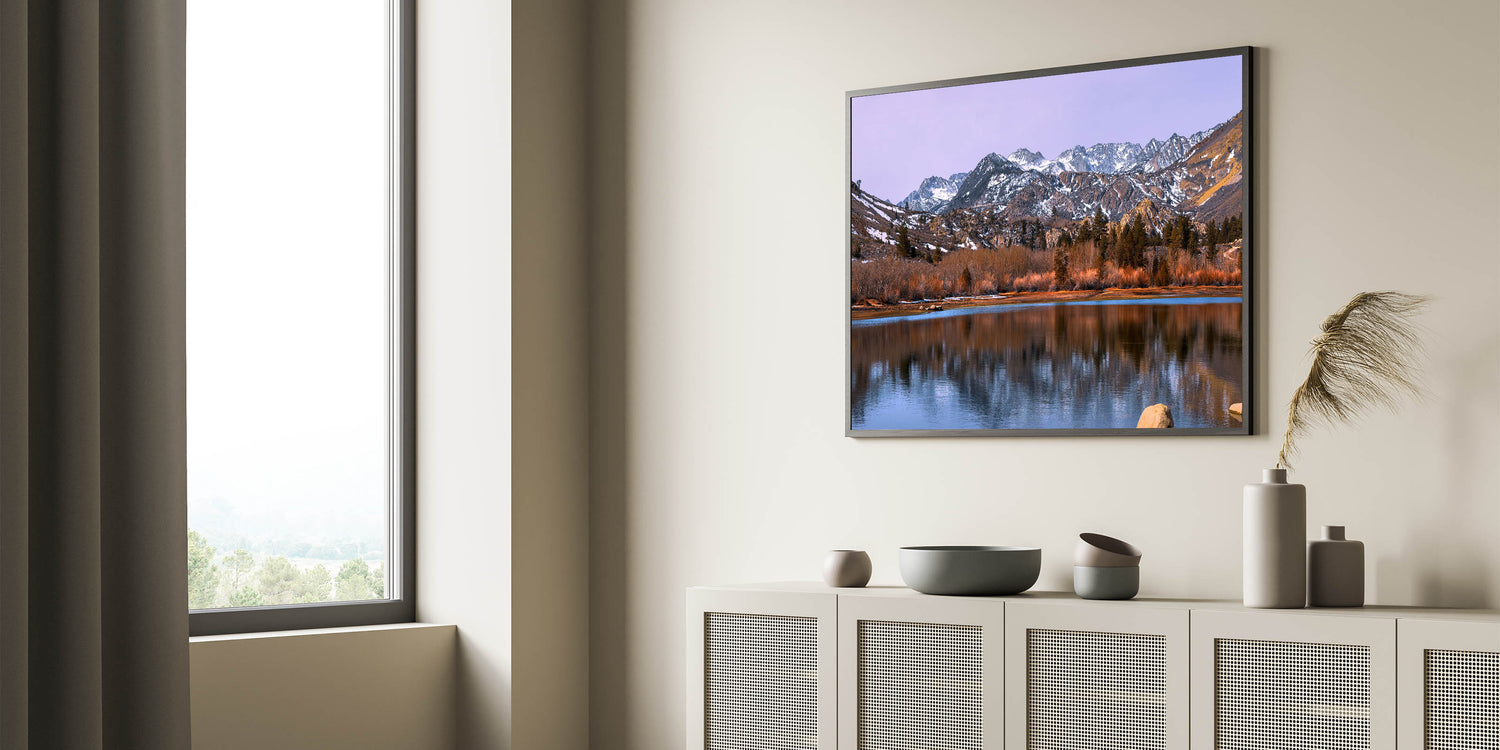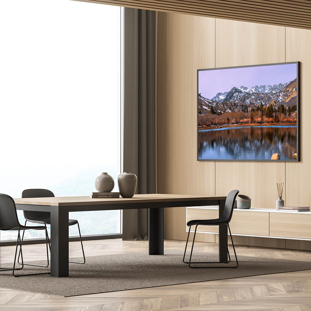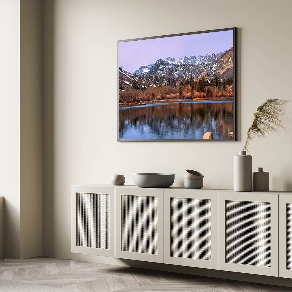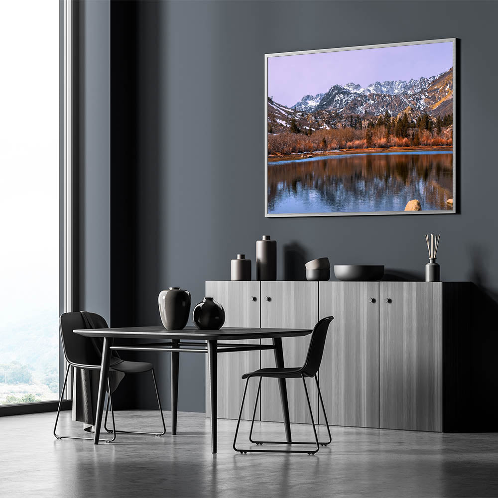 - Vivid Detail: The artwork showcases the tranquil reflection of the Sierra Nevada mountains on a calm lake, creating a peaceful atmosphere.
