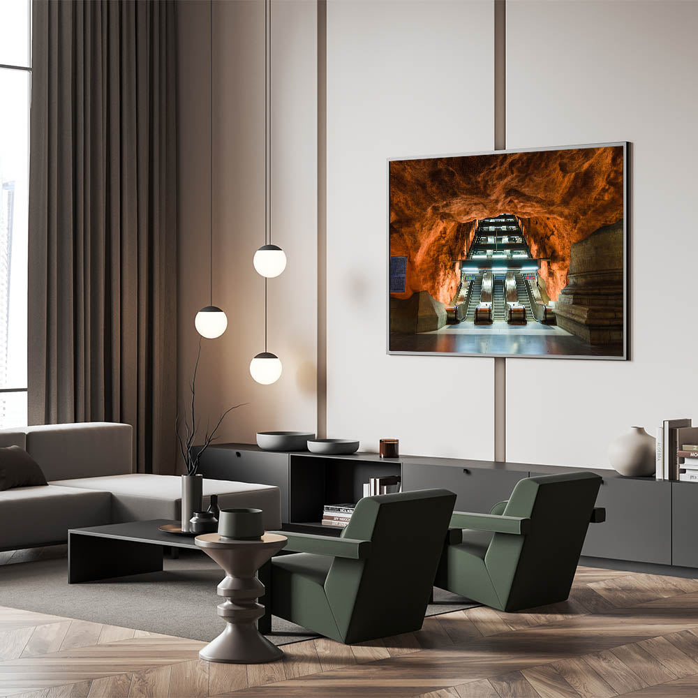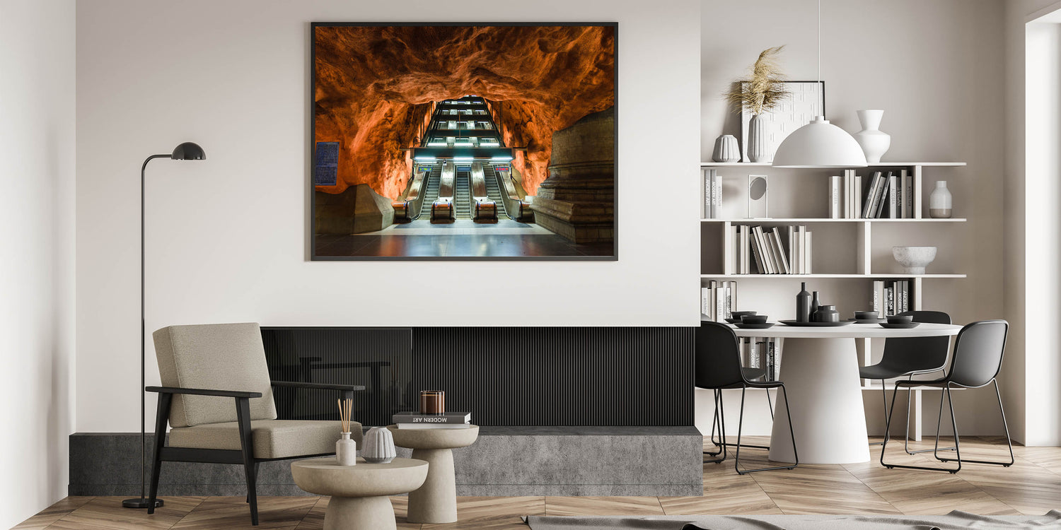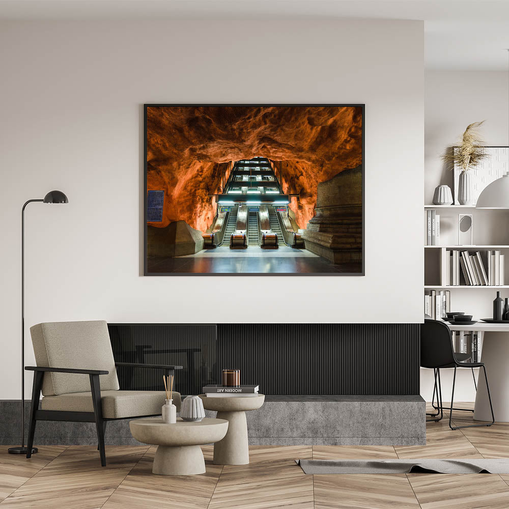 Transform your space with this beautiful Stockholm wall decor showcasing the city's unique underground station. This striking piece of Stockholm cityscape photography captures the fusion of modern architecture with the natural beauty of the rock ceiling, creating a mesmerizing scene that is both bold and captivating. Available in a variety of high-quality materials such as stretched canvas, framed canvas, acrylic glass, and framed prints, this artwork is perfect for enhancing any modern interior.