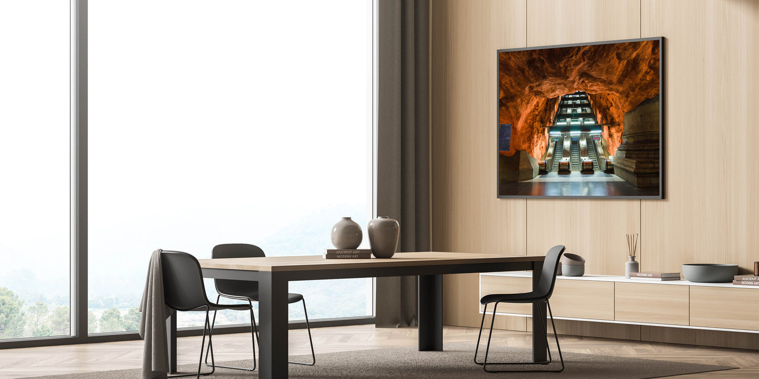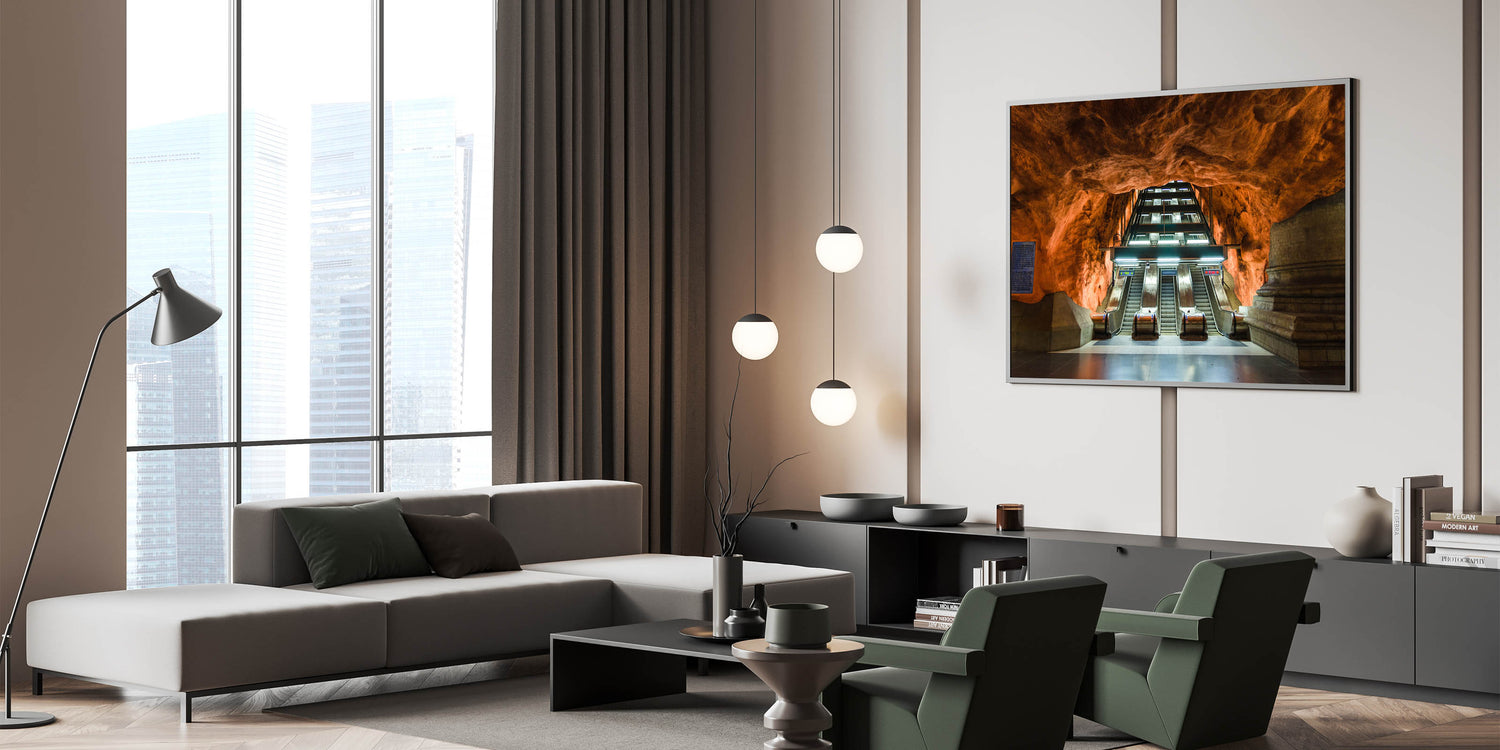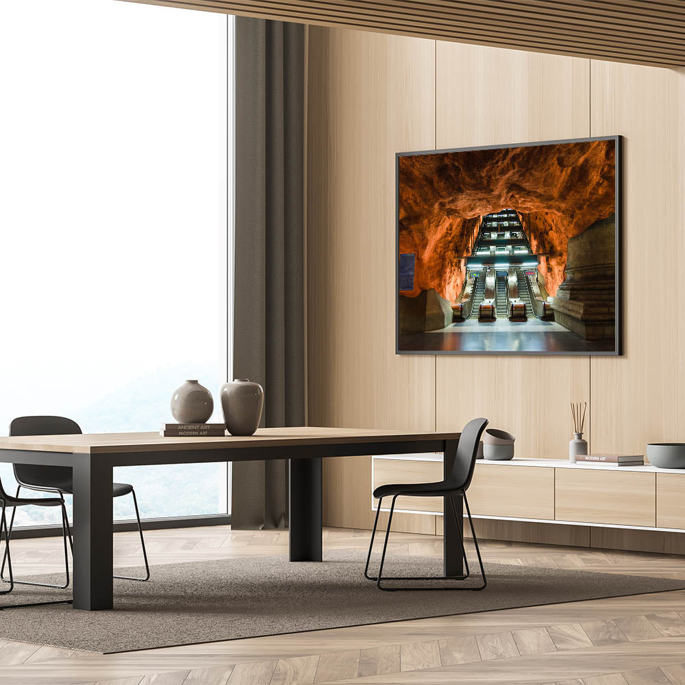 Transform your space with this beautiful Stockholm wall decor showcasing the city's unique underground station. This striking piece of Stockholm cityscape photography captures the fusion of modern architecture with the natural beauty of the rock ceiling, creating a mesmerizing scene that is both bold and captivating. Available in a variety of high-quality materials such as stretched canvas, framed canvas, acrylic glass, and framed prints, this artwork is perfect for enhancing any modern interior.