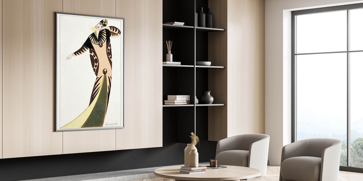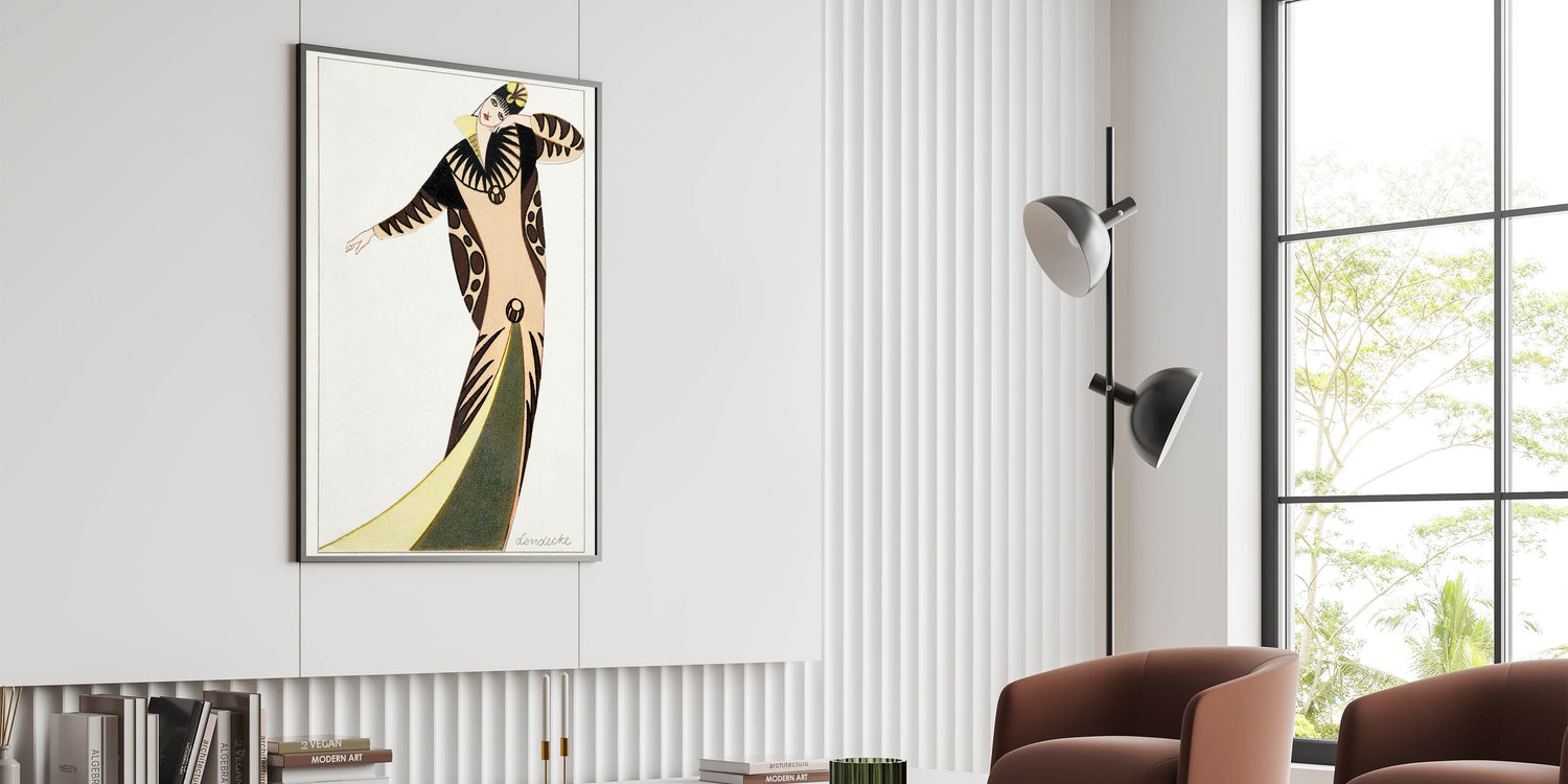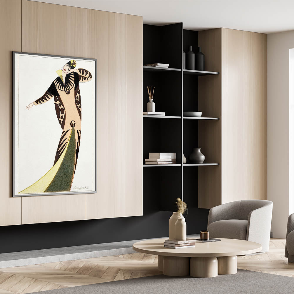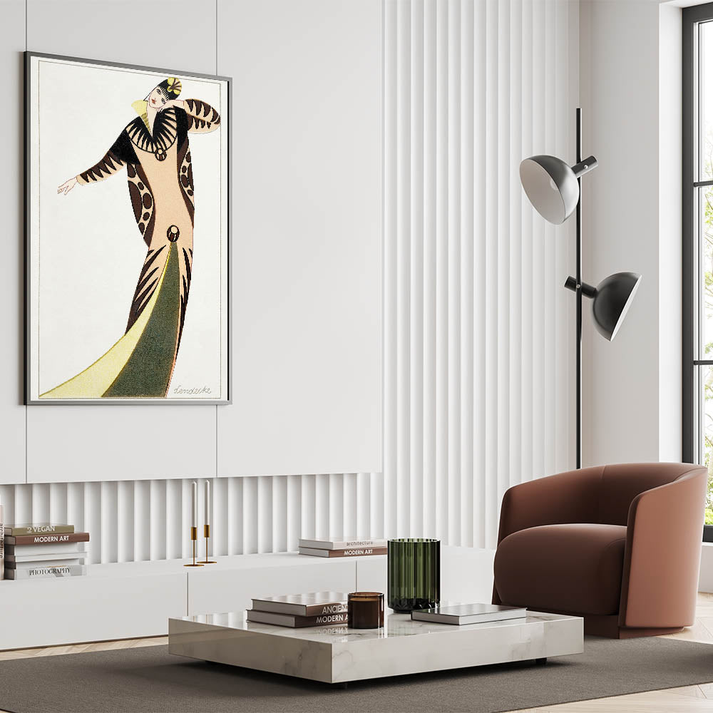Add a statement piece to your decor with this stylish Art Deco wall art, featuring a striking fashion illustration from the 1920s. This captivating design showcases an elegant figure in an elaborate gown with bold geometric patterns and earthy tones, highlighting the unique Art Deco style. The artwork’s intricate detailing and sophisticated color palette make it a perfect fit for both modern and vintage-inspired spaces.